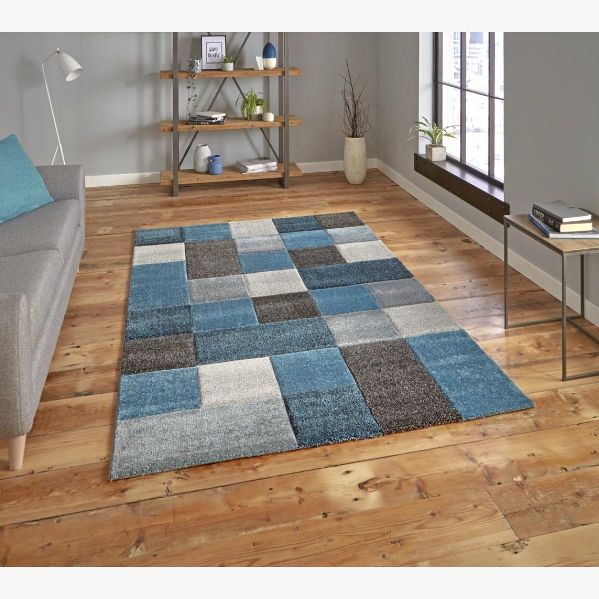I love this rug because of its versatile colour palette and modern geometric design, which can easily complement both contemporary and classic interiors. It works particularly well in living rooms or bedrooms where you want to add a pop of colour without overwhelming the space. The blue and grey tones are neutral enough to pair with a range of furniture styles, yet add interest thanks to the varied shades and pattern. For practical styling, place it under a coffee table or a bed to anchor the room, and consider layering with throws or cushions in coordinating colours to create a cohesive look. Its size makes it flexible for both larger open-plan spaces and more modest rooms, making it a great all-round choice for adding warmth and visual interest.