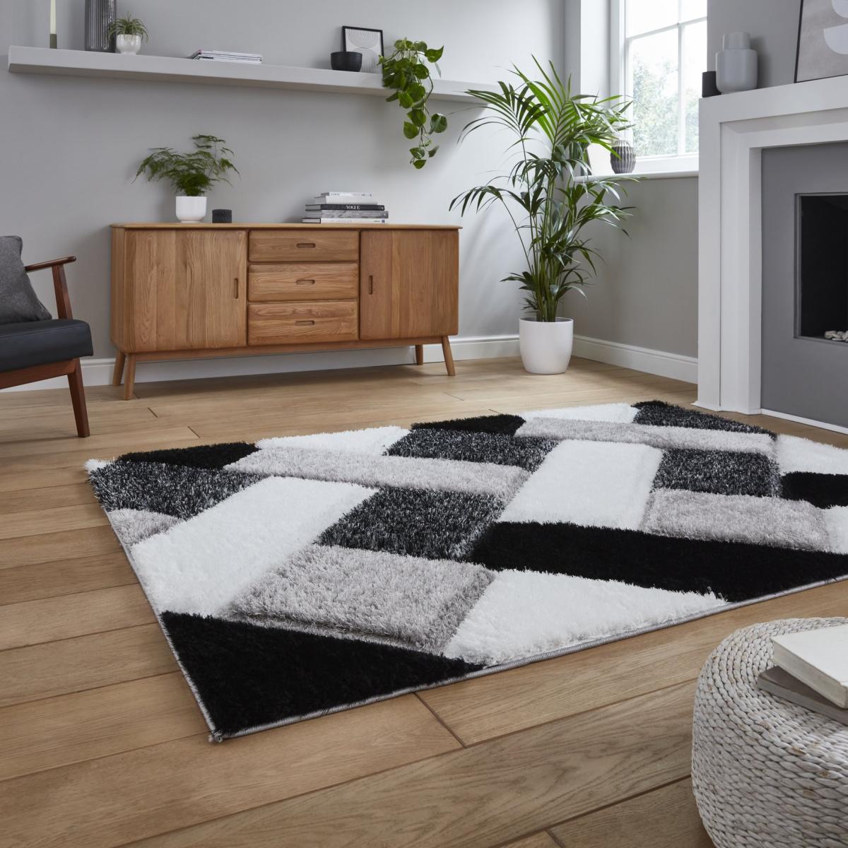 3D Design. Thick Shaggy Pile. Machine made with polypropylene and polyester our Olympia range shows off a modern geometric design. Hand carved to create a deep 3D effect.