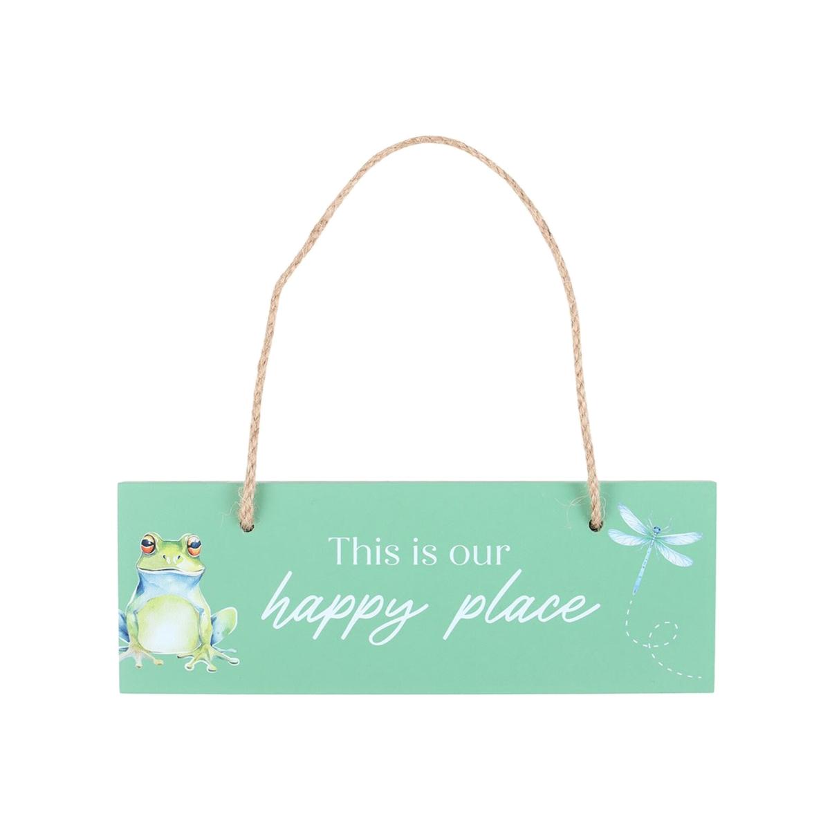 This delightful light green hanging sign is perfect for bringing a sense of joy and nature-inspired charm to the home or garden. Featuring the uplifting phrase "This is Our Happy Place", it features a sitting frog and a delicate dragonfly. Complete with a rustic rope hanger, this sign is ideal for adding a personal touch to any patio or entryway.