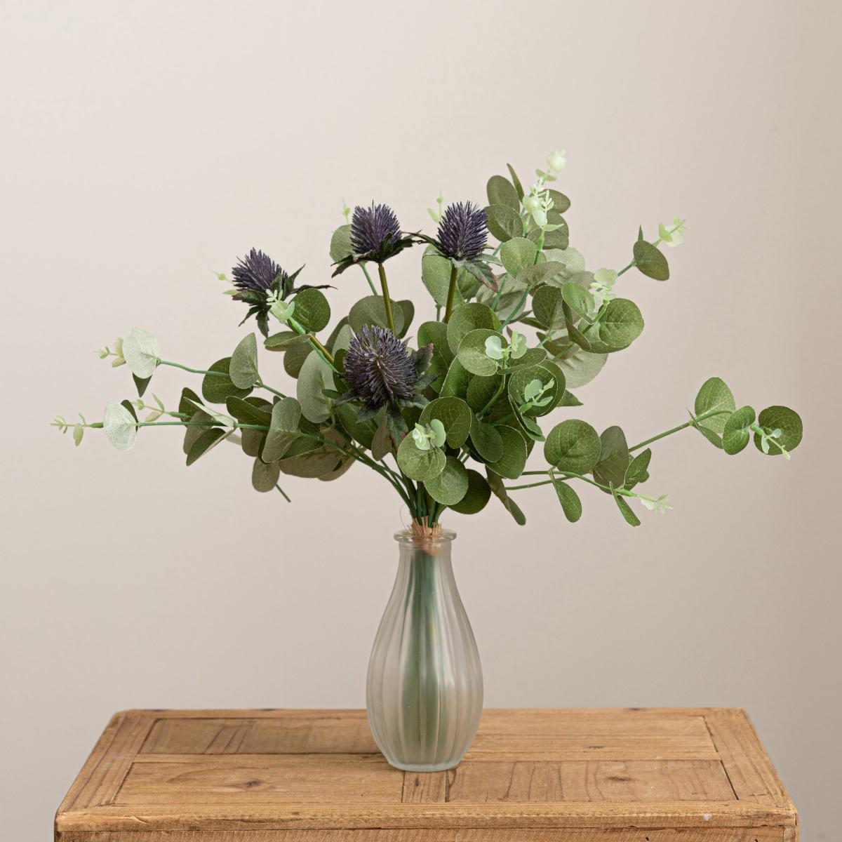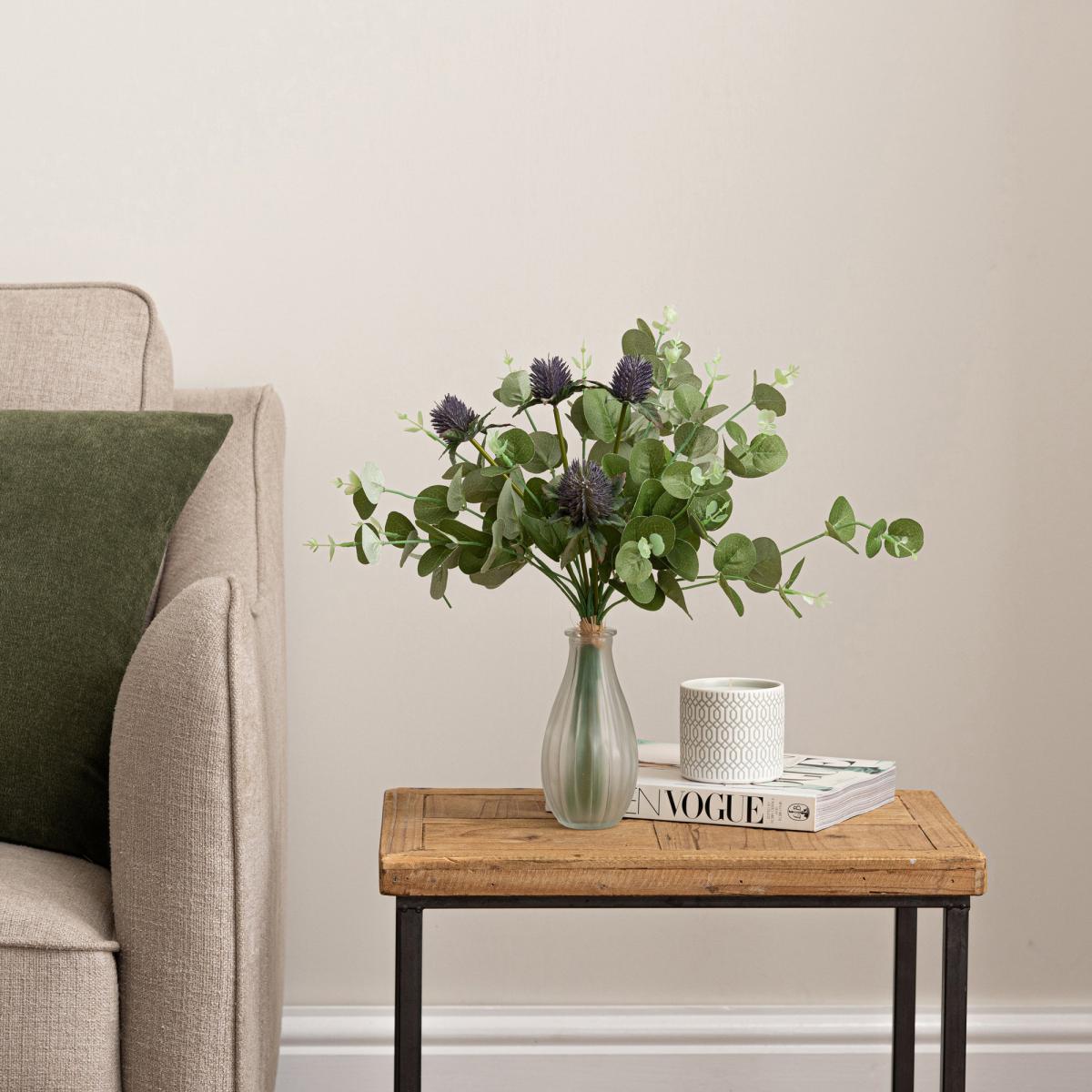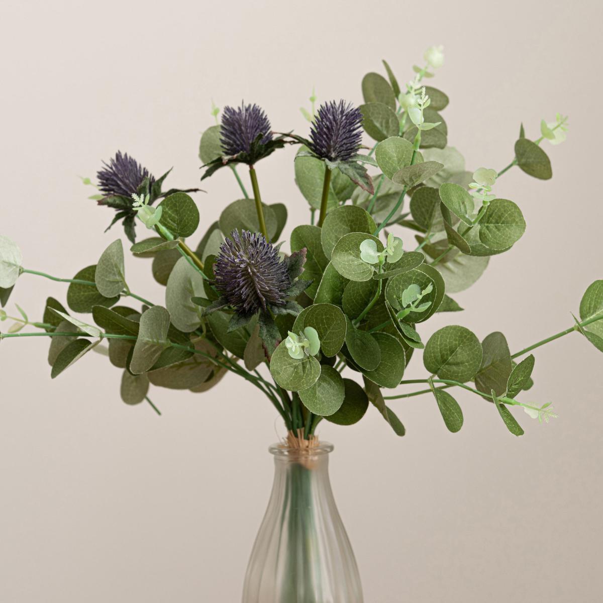 Tied with raffia, this beautiful thistle and eucalyptus bundle will add a stylish look and feel to any room of the house. With detailed thistles and printing on the leaves, this highly realistic artificial bundle is ideal for display within a vase.