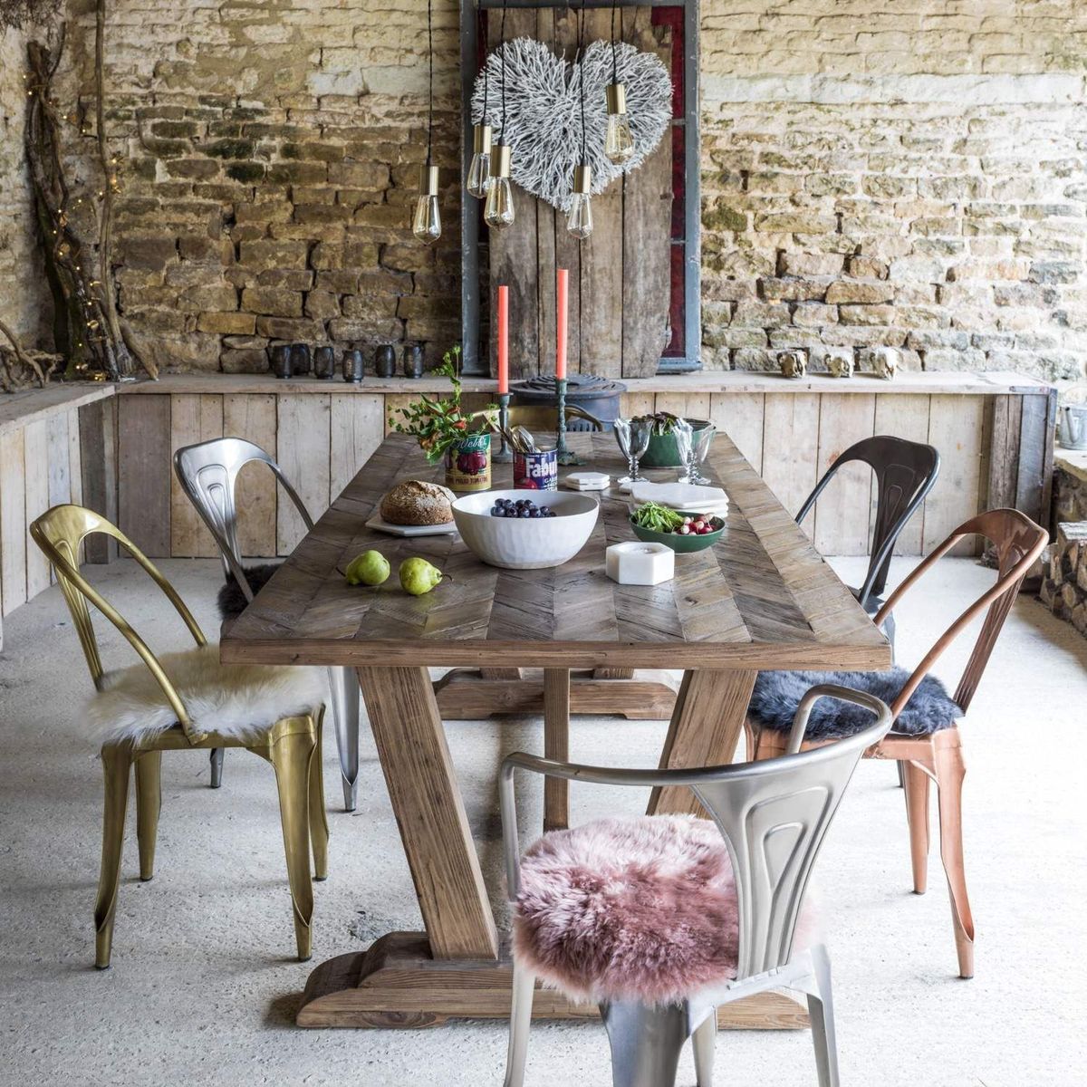 The table offers a great blend of rustic charm and modern appeal, making it versatile for a range of interiors, from industrial to eclectic or even Scandinavian styles. I love how its sturdy, natural wood finish grounds a space, while the varied chairs add a playful yet balanced touch. For styling, consider keeping the table relatively uncluttered to highlight its natural beauty-simple centrepieces such as a bowl of fruit, candles, or fresh greenery work well. Pairing it with contrasting materials like velvet or leather chairs can heighten its character, or mix and match chairs for a more eclectic look. It's practical for everyday family meals but also adaptable enough for special occasions with the right accessories.
