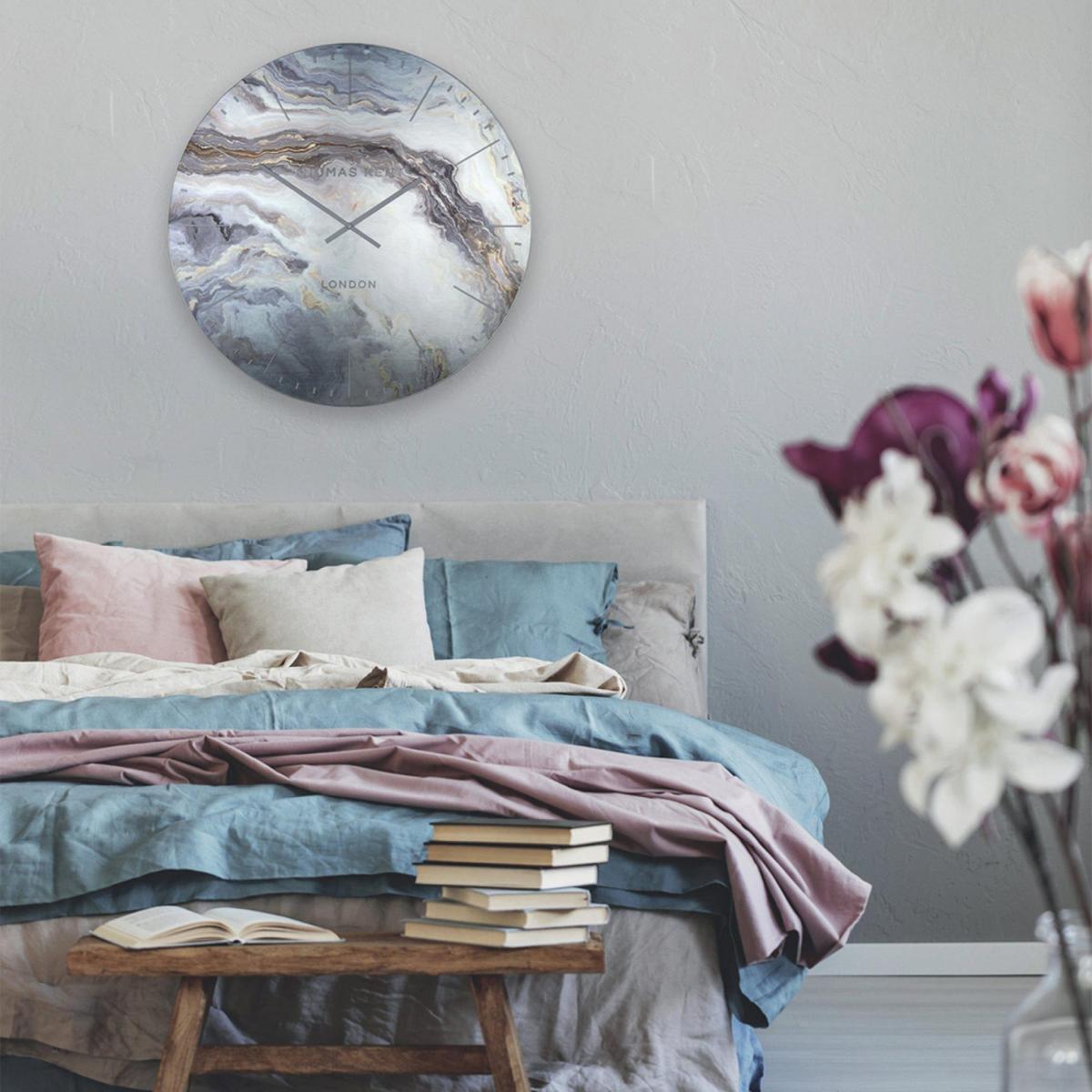 The 66cm Glacier Oyster clock has a silver rim and fluid marbled face design. A domed glass lens, clean cut baton hands and contrasting ‘ticks’.