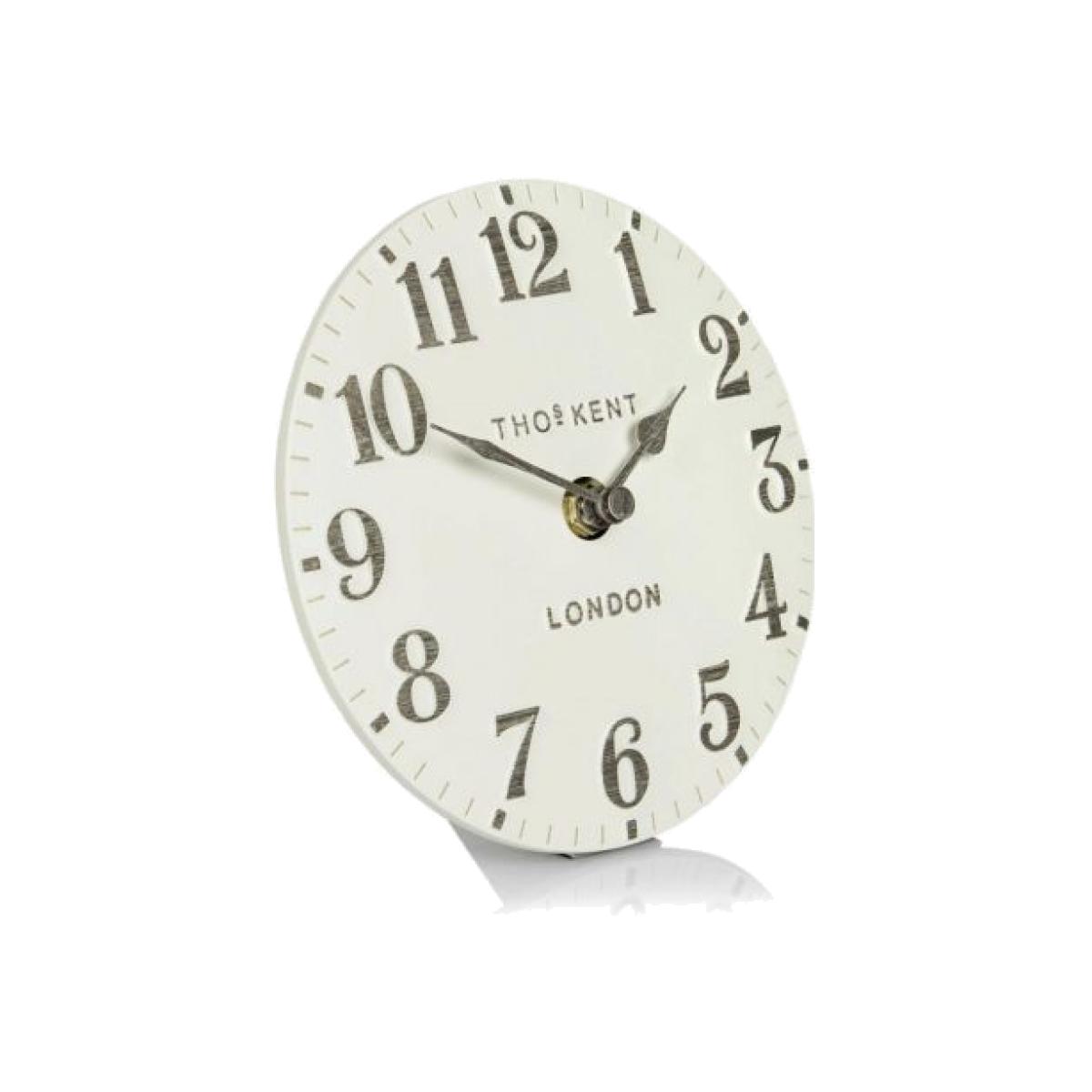 The bold and characterful 6-inch Arabic Mantel Clock from Thomas Kent is cast in sold resin with a moulded stand at the back, With its soft curved convex shape,.open face and raised numerals in contrasting colour this clock is hand-painted for an authentic arts and crafts feel. It’s a real talking point for anyone who wants to bring a little something special to their home decor. Colour : Limestone  Size 15cm (6') Depth 5cm AA Battery required.