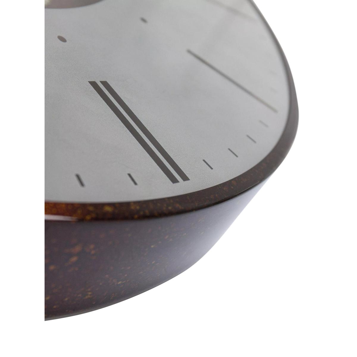The feeling of industry sits at the heart of this contemporary large wall clock design. An assortment of decorative cogs moves seamlessly together to create a dramatic exposed mechanical effect. A contrasting hammered metal and worn stone design brings the wheels to life. Arranged on a bronze canvas dial, a brown antique frame encases the feature wall statement. The modern numerals reveal the bronze background canvas.