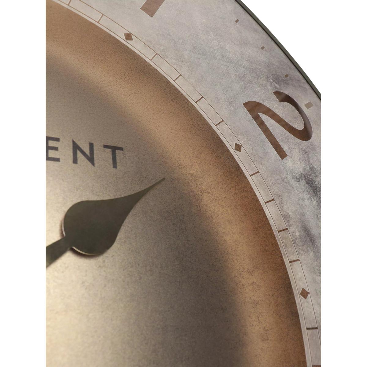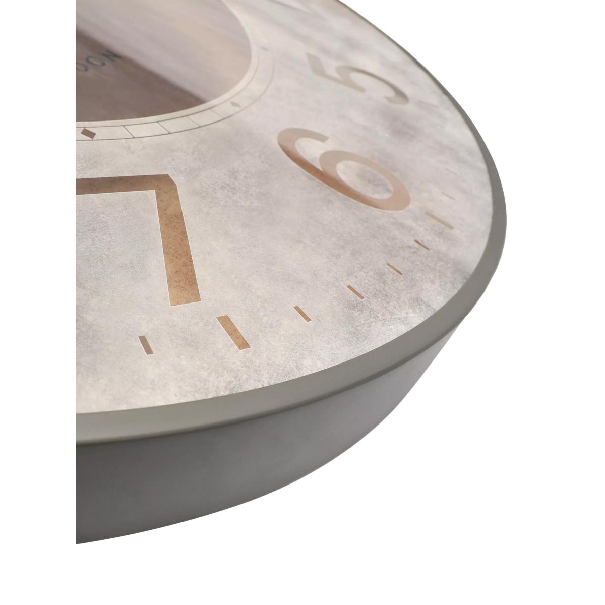 This contemporary wall clock, with a traditional twist, has a warm metallic palette and subtle stone-effect revealed on a glass dial. This unique touch elevates the etching of the modern numerals marking the hours. The mottled effect creates a subtle contrast against the textured backdrop, while the complementing gold-toned traditional clock hands add a touch of glamour to the dramatic oversized wall clock. A matte grey rim beautifully completes the inspiring design for your wall.