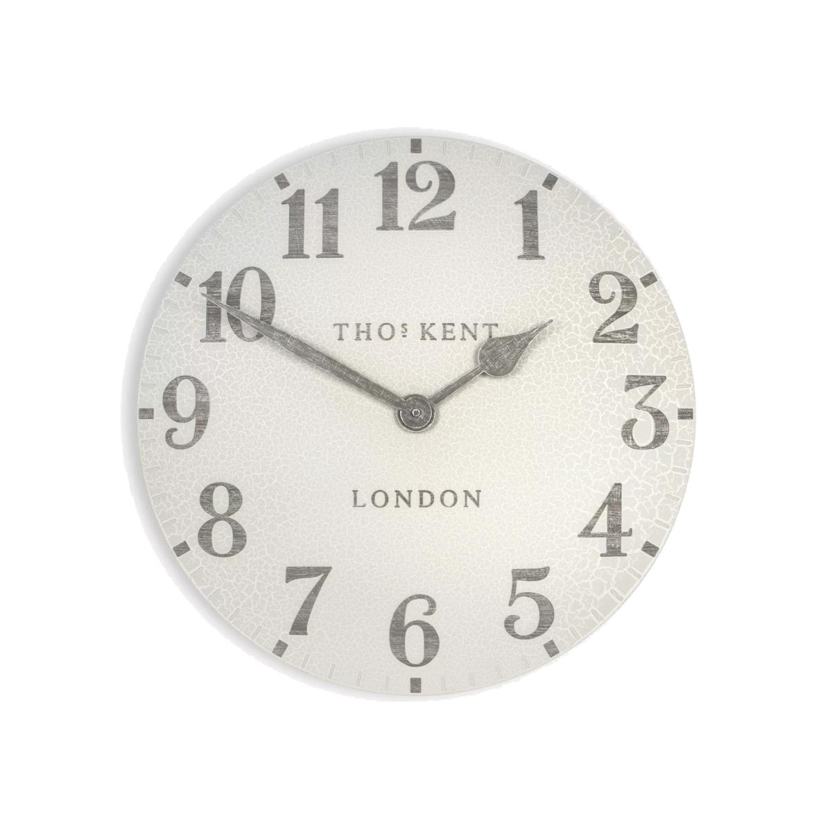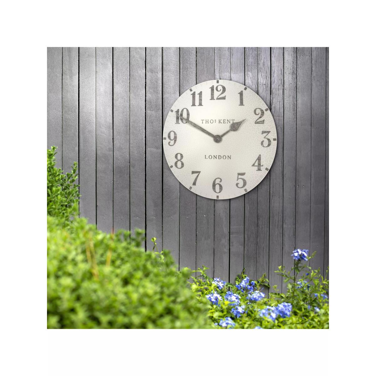 This classic Arabic wall clock has been designed to withstand the challenges of the great outdoors. A hardy 20 inch dial showcases a limestone white base. The district Arabic numerals are shaded in a contrasting shade of mink grey. A weathered crackle effect drifts over the curvaceous dial creating a stunning garden feature