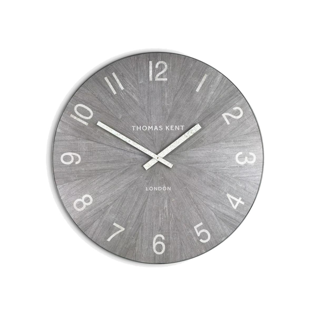 A modern take on Thomas Kent's grand Wharf clocks, based on the clocks found on wharf buildings in the heyday of the dockyards. This open-faced wall clock is finished with a galvanised steel trim and an under-finished, textured face. Mimicking wood joinery with its patterned dial, the design is completed with Arabic numerals and matching clock hands.