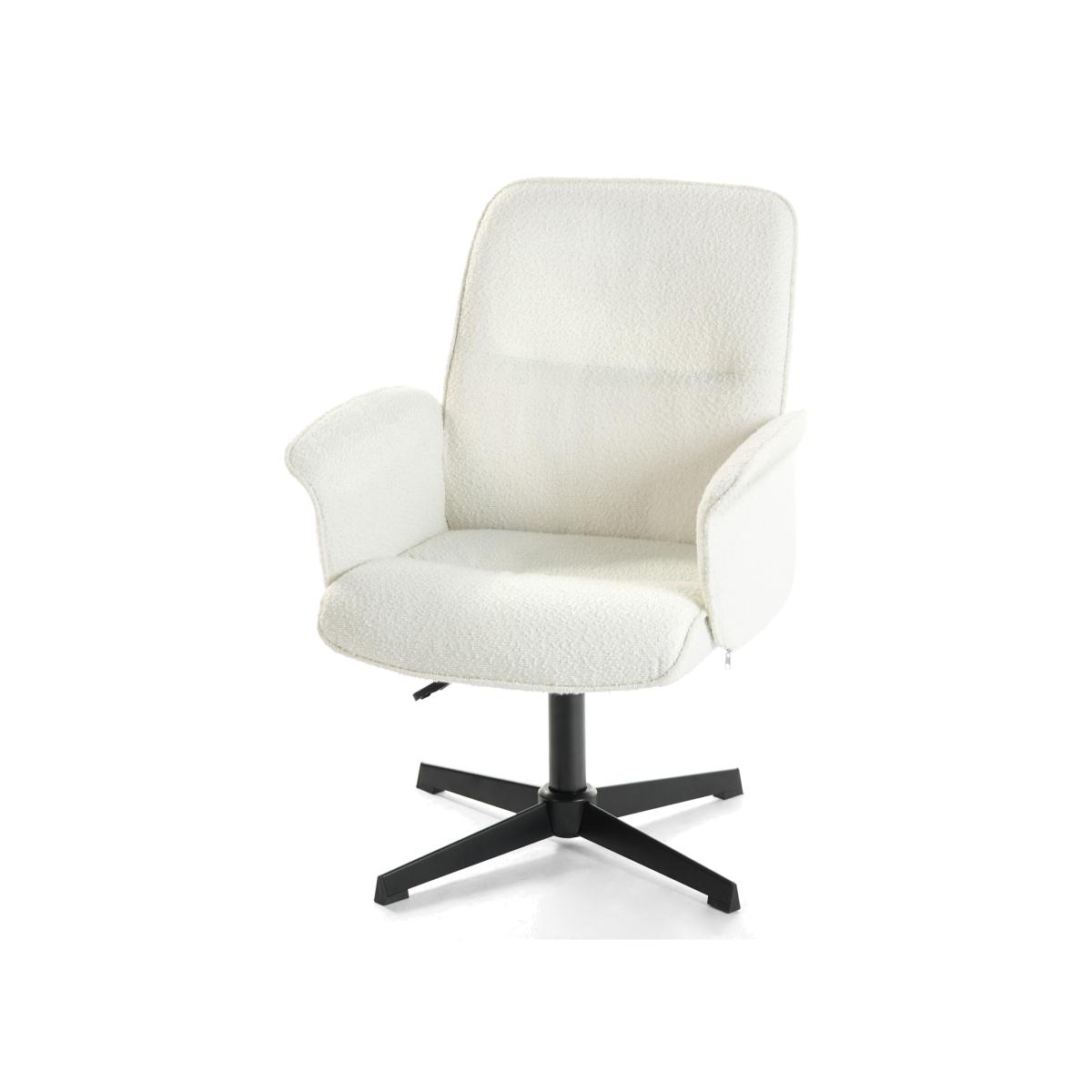 Experience the perfect blend of comfort and style with this boucle swivel chair. Wrapped in soft, plush boucle fabric, it provides a warm and inviting feel, making every seat a cozy retreat. The ergonomic design features a spacious seat, supportive backrest, and well-padded armrests, ensuring maximum comfort for extended sitting. Its 360 degree swivel and adjustable height function allow for effortless movement and adaptability, whether you're working, reading, or relaxing. The sturdy black metal base enhances stability and durability, while the elegant off-white color complements various interiors. Ideal for home offices, vanity tables, or cozy reading nooks, this chair adds a touch of sophistication to any space.