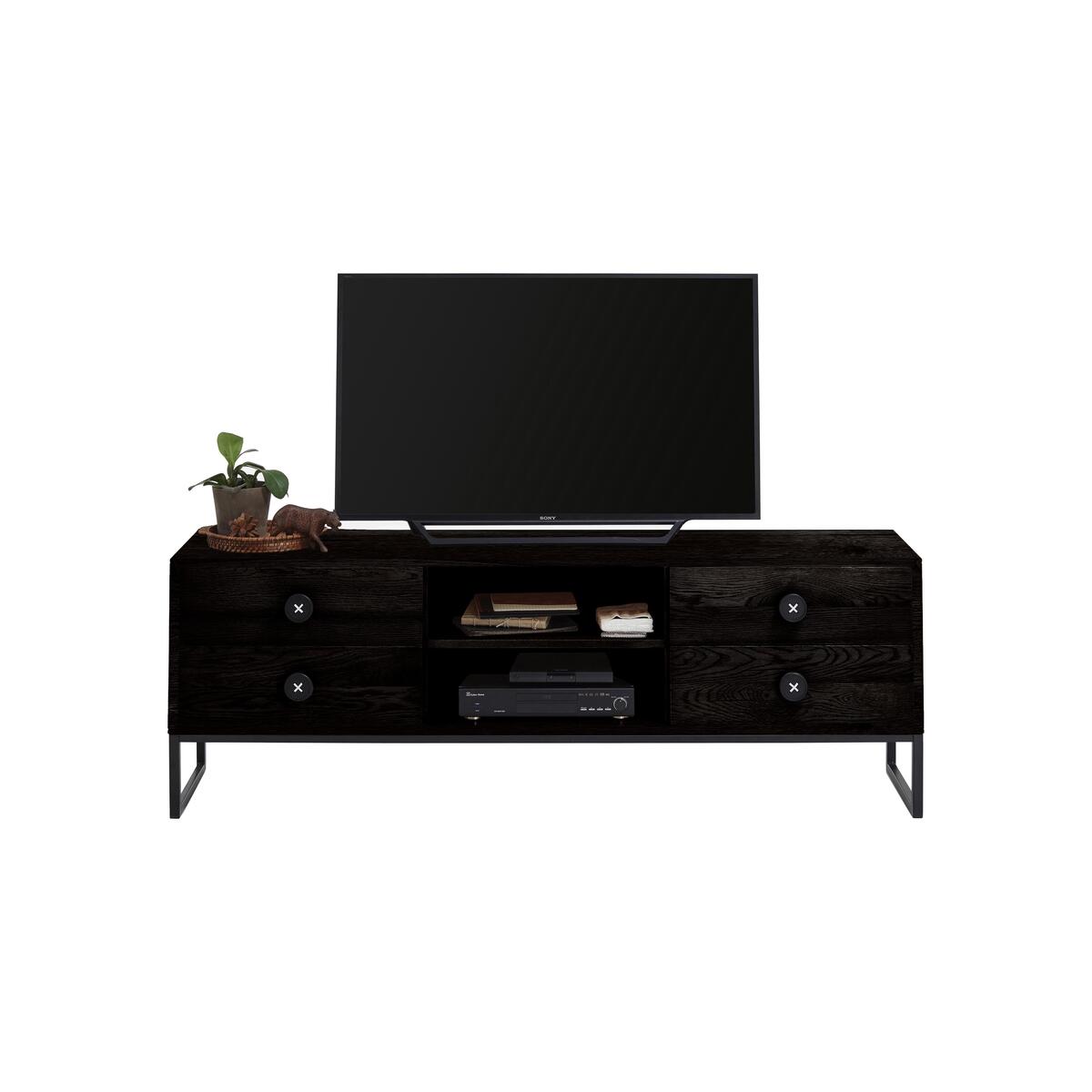 Handmade from solid oak, every piece in the striking Thor collection is a one of a kind. The statement dining table is beautifully finished with a very cool handcrafted metal base and is available in a huge choice of sizes – add optional extension leaves and you can seat up to 18.The range’s sideboards, highboards and TV units combine clever storage spaces with a contemporary industrial aesthetic. Even better, every piece is customisable. Choose from a wide selection of fabulous finishes that include traditional warm oak colours as well as sophisticated modern tones. Contemporary solid oak TV unit is made by hand. Metal base has a black antiqued finish. Design your own – choose from 8 beautiful wood finishes. Display – or hide – your media equipment beautifully with the cool and contemporary Thor 4 drawer TV unit. Handcrafted from solid oak, this stylish media unit is offered in a choice of eight different fabulous wood finishes that include the two-tone finish of Mocca Black frame with contrasting Old Bassano doors and drawers, as well as pale Whitewash, authentic Smoked, and dramatic Shadow. Set on a U-shaped base handmade from metal with an antiqued black finish, this statement piece combines style with storage. There are four roomy soft-closing drawers, each finished with a decorative drawer pull and an open storage area with a shelf. The Thor 4 drawer TV unit is one of many storage pieces in the Thor furniture collection. The range includes sideboards and highboards as well as an entirely customisable large dining table and a selection of dining sets. Please note. The pieces in this collection are handcrafted from solid oak, and characterful knots, saw marks and variations in tone and texture are to be expected. The oak is finished with a matte lacquer. Simply use a clean cloth wrung in water to clean. The metal work has been finished by hand and may display similar marks.