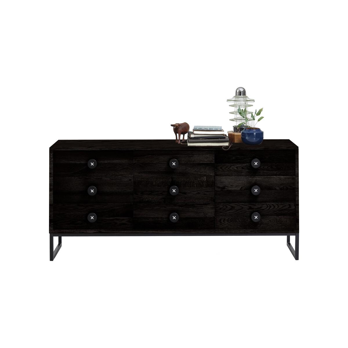 Contemporary solid oak multi-drawer sideboard is made by hand. Metal base has a black antiqued finish. Design your own - choose from 8 beautiful wood finishes Perfect for a home office - the drawers make for a very efficient filing system - or in a dining room or living room, the large Thor 9 drawer sideboard combines great functionality with striking urban style. It's beautifully crafted, too. Both the base and the frame are handmade - the frame from solid oak and the U-shaped base from metal with an antiqued black finish. Choose from eight different wood finishes, including the option of a Mocca Black frame with contrasting Old Bassano drawers. Drawers are soft-closing and are finished with striking circular drawer pulls. Part of the fabulously stylish Thor collection, the Thor 9 drawer sideboard is one of several sideboards and highboards in the range. If you love this cool and contemporary look along with its customisability, want to create your own bespoke Thor dining table. Choose your length, your width and your wood finish and design your ideal dining table. Please note : The pieces in this collection are handcrafted from solid oak, and characterful knots, saw marks and variations in tone and texture are to be expected. The oak is finished with a matte lacquer. Simply use a clean cloth wrung in water to clean. The metal work has been finished by hand and may display similar marks.