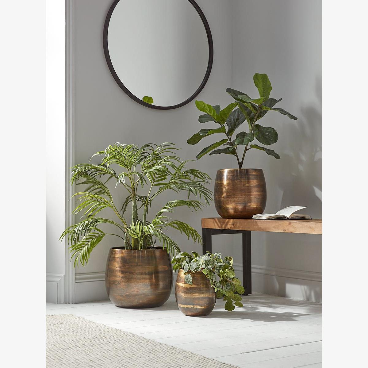 A trio of burnished metal indoor planters which will bring rich warmth to any corner of your home. In three different sizes, they can be grouped together for a cohesive display or used separately. The bronze tone is an effective complement for the lush shades of real or faux greenery.