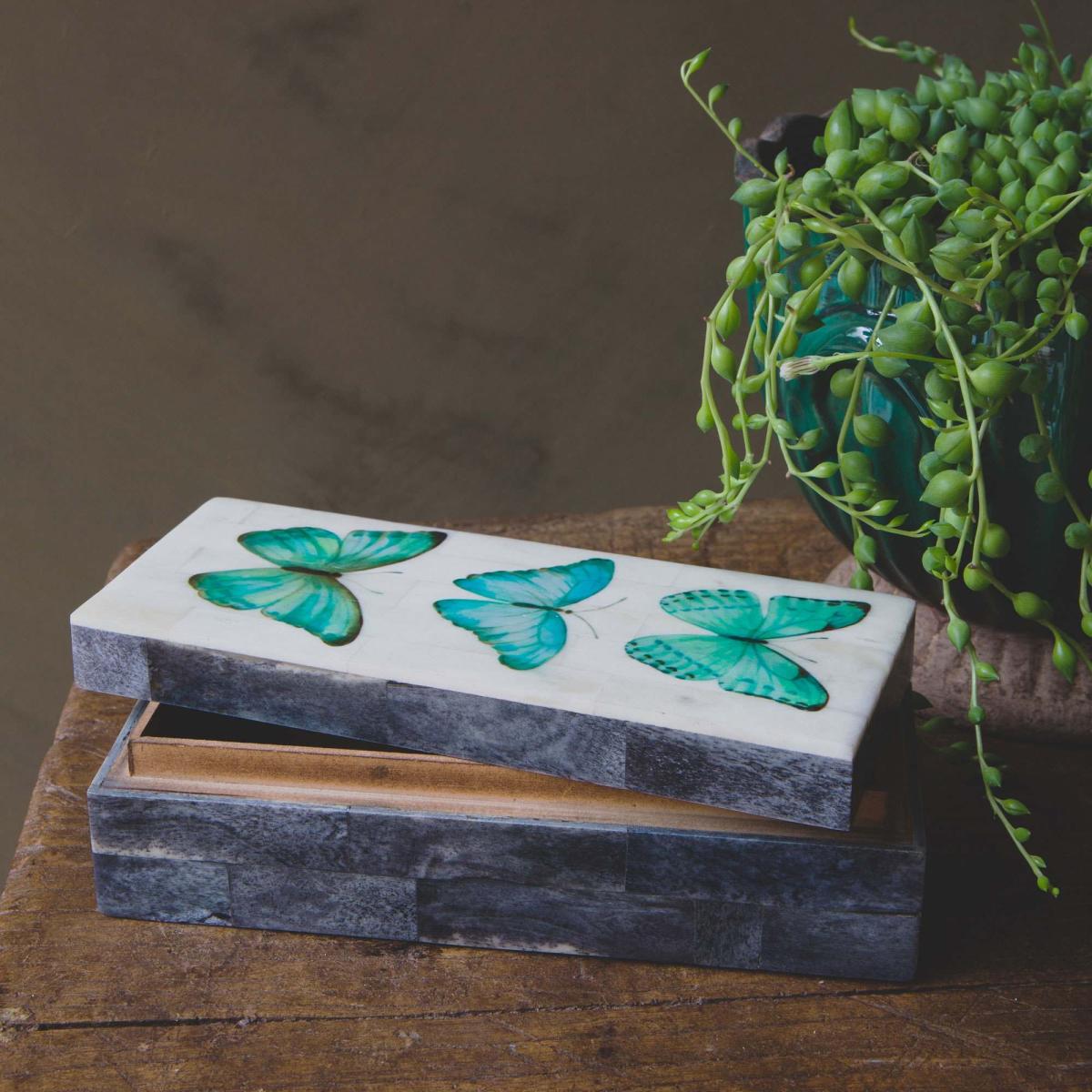 Crafted from natural bone and Sheesham wood, this intricate butterfly box is the perfect place to keep trinkets and jewellery. Features three printed butterflies in shades of blue.