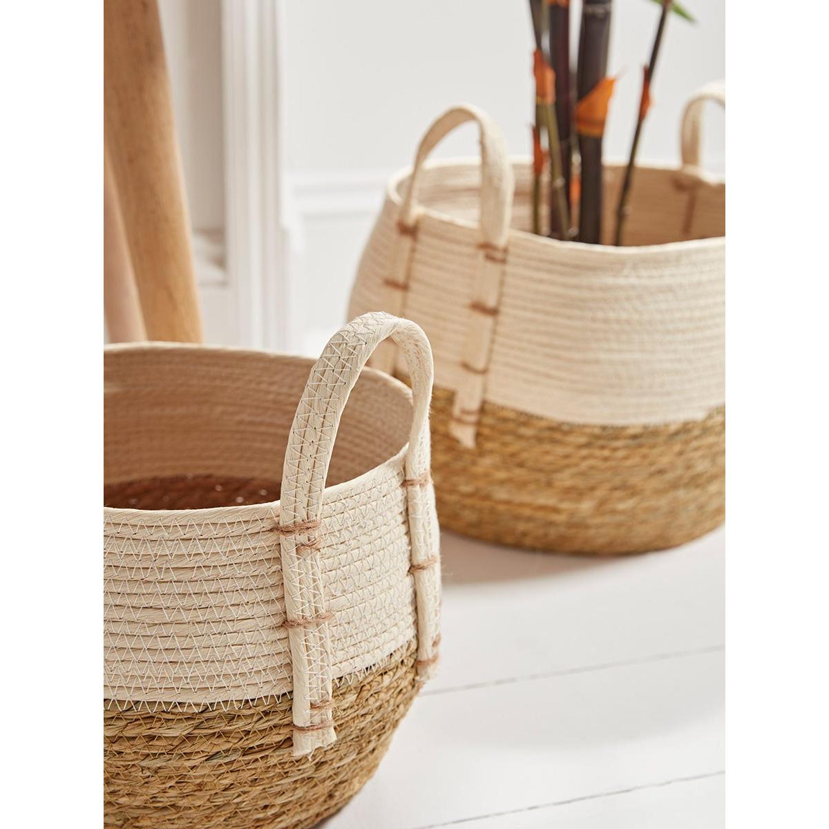 A practical set of wide mouthed baskets with handles woven from a warm neutral combination of natural and cream corngrass fibres. It’s impossible to have too much storage and we are happy to predict that these baskets, which come in a set of three, will prove useful in any room of the house. Each set includes one small, one medium and one large basket.