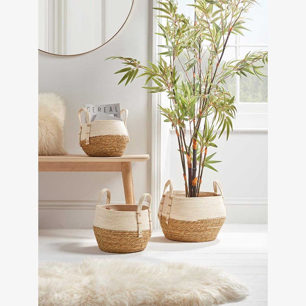 I love these baskets for their understated natural appeal and versatility. The neutral cream and beige tones make them an easy addition to almost any interior style, from Scandi and coastal to more boho spaces. They work particularly well as plant bases, as shown here, adding texture without overwhelming. Practical styling tips include using them for storage in living rooms or bedrooms to keep clutter out of sight, or grouping different sizes together for visual interest. Their sturdy design also makes them suitable for both decorative and functional use-think laundry, throws, or outdoor accessories-making them a practical yet aesthetic choice for contemporary interiors.