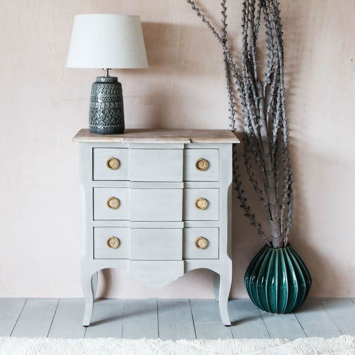 I love this little French-inspired chest of drawers for its charming, vintage appeal and versatility. It works well in both traditional and shabby chic interiors, as well as in more contemporary spaces when styled with a mix of modern and antique accessories. Practical tips include topping it with a decorative tray or lamp to create a focal point, or using the drawers for organising smaller items in a bedroom or hallway. Its light, distressed finish makes it ideal for layered styling, pairing effortlessly with soft colours, floral textiles or rustic accents to bring a cosy, lived-in feel.