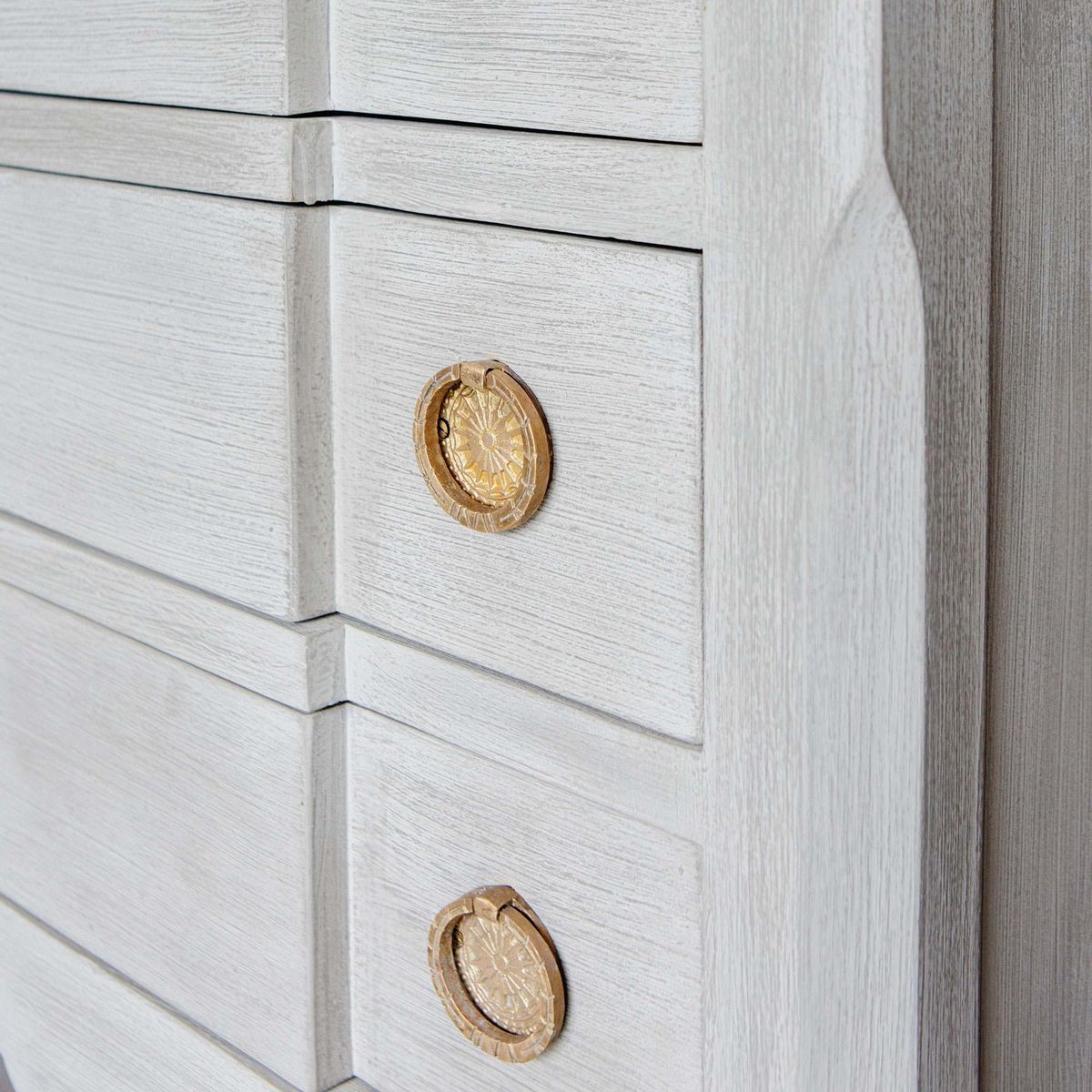 A beautiful french-inspired chest of drawers handcrafted from mango wood featuring a light whitewash finish and cut-out detailing. Each draw is complete with ornate brass pullers adding to its charm.