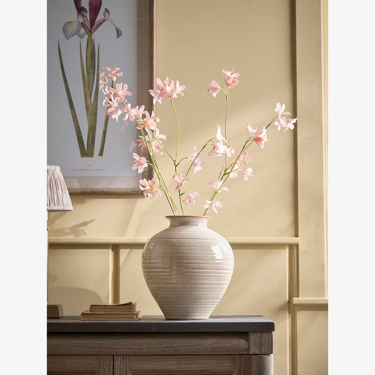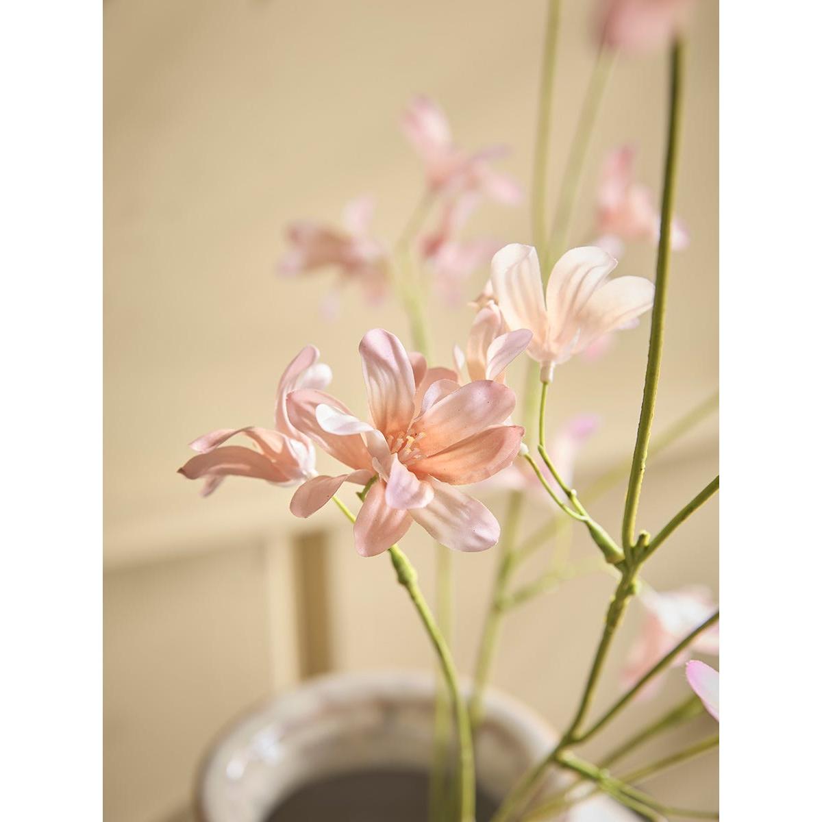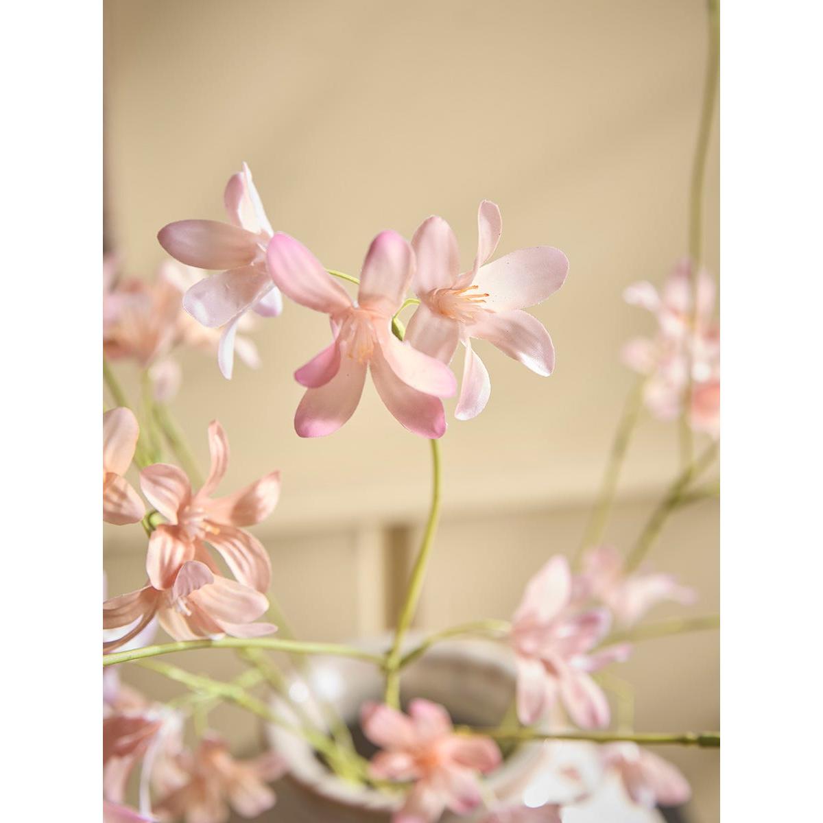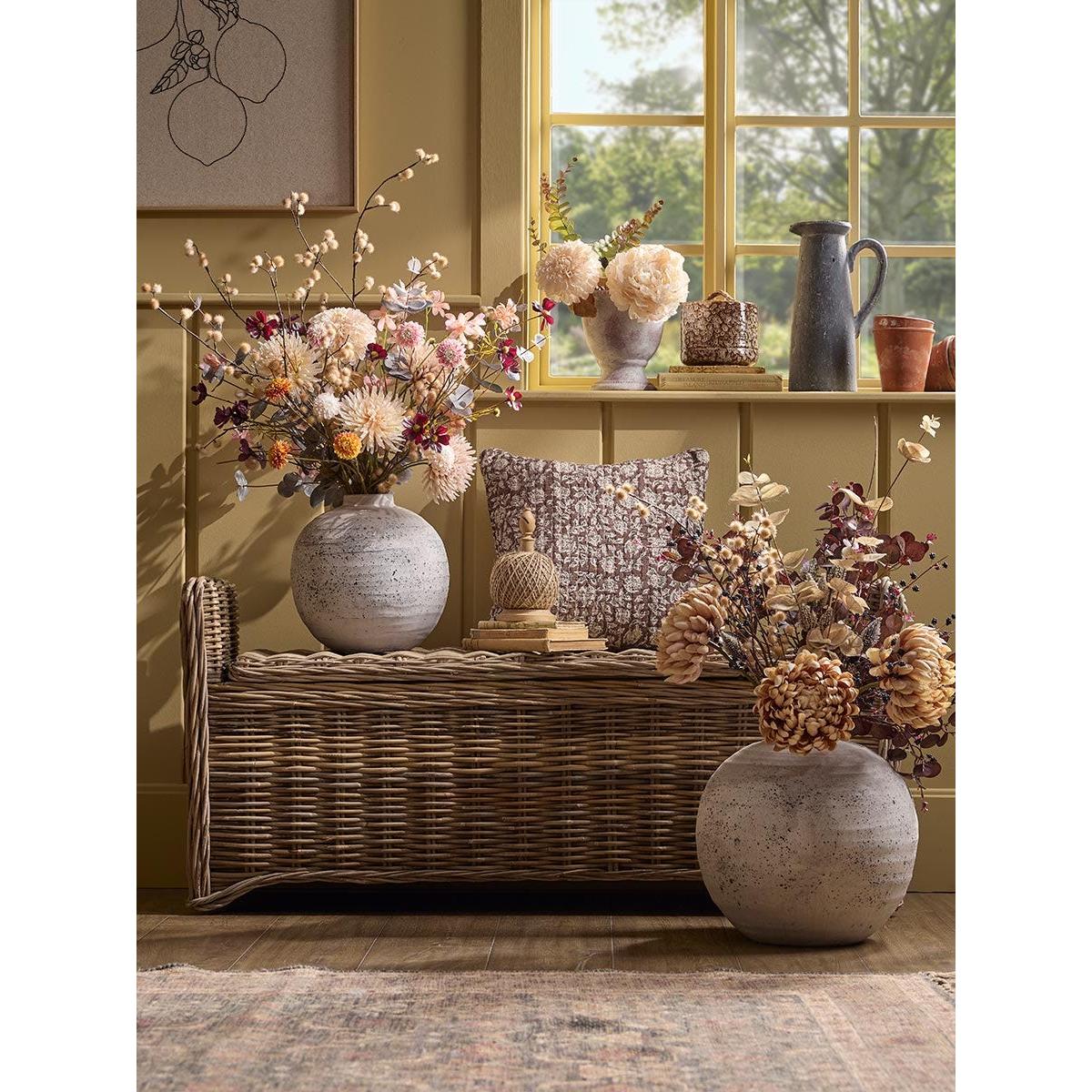 I love these peach faux hyacinth sprays for their colour warmth and delicate form, making them a versatile addition to various interiors. They work particularly well in neutral or pastel palettes, adding a subtle touch of colour without overwhelming the space. For styling tips, I recommend placing them in simple vases or combining them with other faux botanicals for a lush, layered look. They’re perfect for creating low-maintenance arrangements on sideboards, console tables, or shelf displays - especially in areas where real flowers might struggle to thrive. Their realistic appearance also makes them a great choice for those who love the look of fresh flowers but want something that lasts.