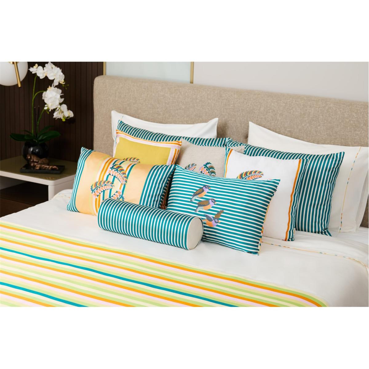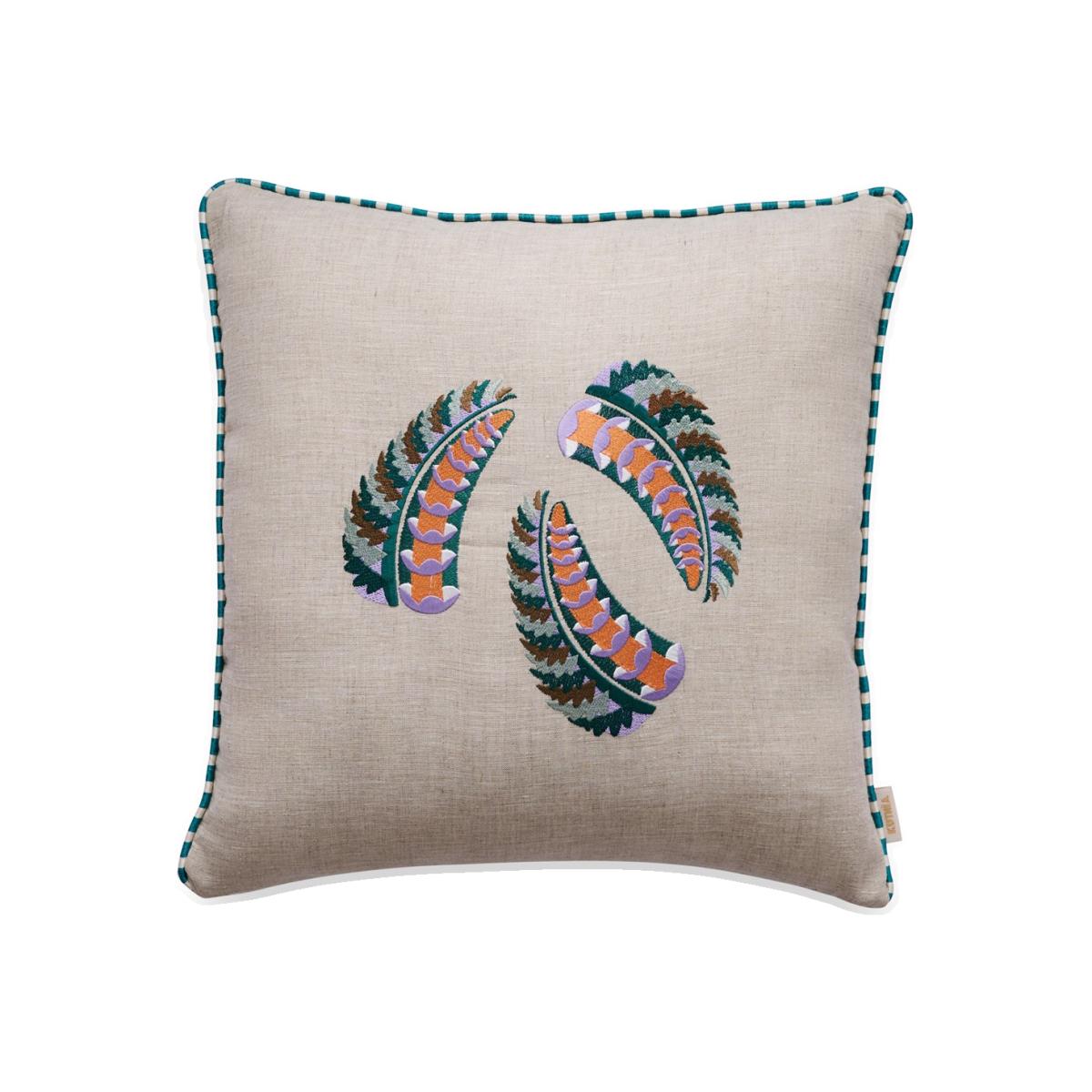 I’m a big fan of what I’ll call the “feather cushion” - its neutral linen ground keeps things grounded while the piped edge and bold embroidery introduce just the right pop of colour. It sits equally well in a Scandi-inspired living room as in a relaxed boho scheme, and you can easily layer it with solid-tone cushions in deep teals or soft blush to pull out those accent hues. For a simple yet styled look, pair it with a chunky knit throw over a mid-century sofa or tuck it into an armchair alongside a woven basket for blankets.