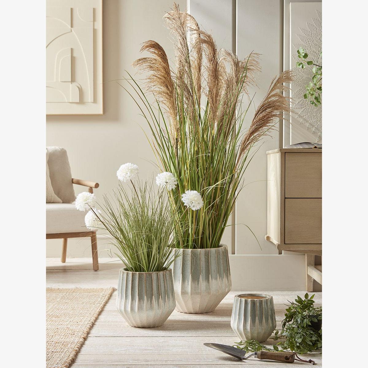 I love these fluted planters for their timeless elegance and textured detail, which add subtle sophistication to any space. The soft sage colour makes them versatile, effortlessly complementing everything from neutral minimal interiors to more layered, earthy schemes. They work particularly well in contemporary or Scandi-inspired settings, where their clean lines and understated style can really shine. For styling tips, I’d suggest pairing the larger ones with tall, exotic greenery like pampas or grasses for height, and filling the smaller pots with trailing plants like ivy or pothos to create visual interest. Their neutral tone makes them easy to incorporate into various colour palettes, and they’re practical too - sturdy and simple to move around as your interior evolves.