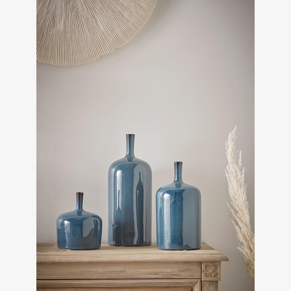 A trio of striking vases in a rich reflective blue glaze which will dress a mantelpiece or shelf beautifully. In three different sizes, each vase has a broad bottle base and unusual narrow neck which will take a single stem, although they make a lovely statement in their own right. A harmonious addition to a laid back coastal themed space.