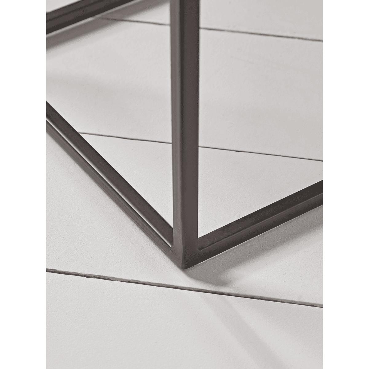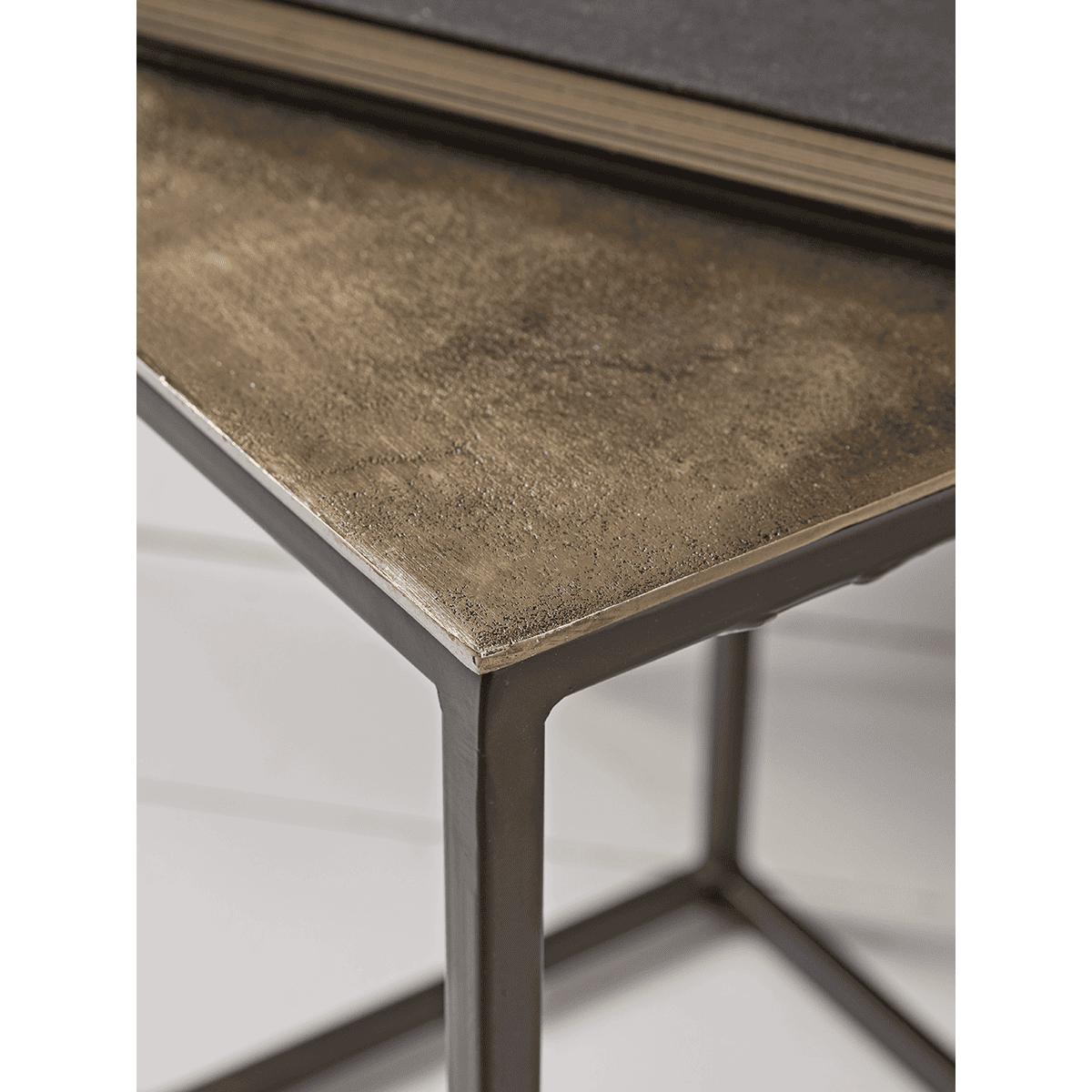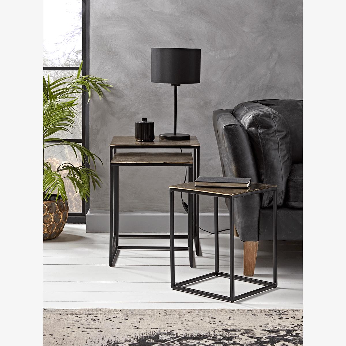 Simple lines are complemented by rich tones and versatility in this nest of tables. Each table in this trio has a dark metal angular frame and an aluminium top with a warm, burnished gold tone. We like to style the largest as a lamp table beside our favourite sofa or chair, with its siblings tucked away beneath, ready to be called into action when visitors call for coffee or drinks. Full of character, yet discrete, this nest of tables will enhance any setting.