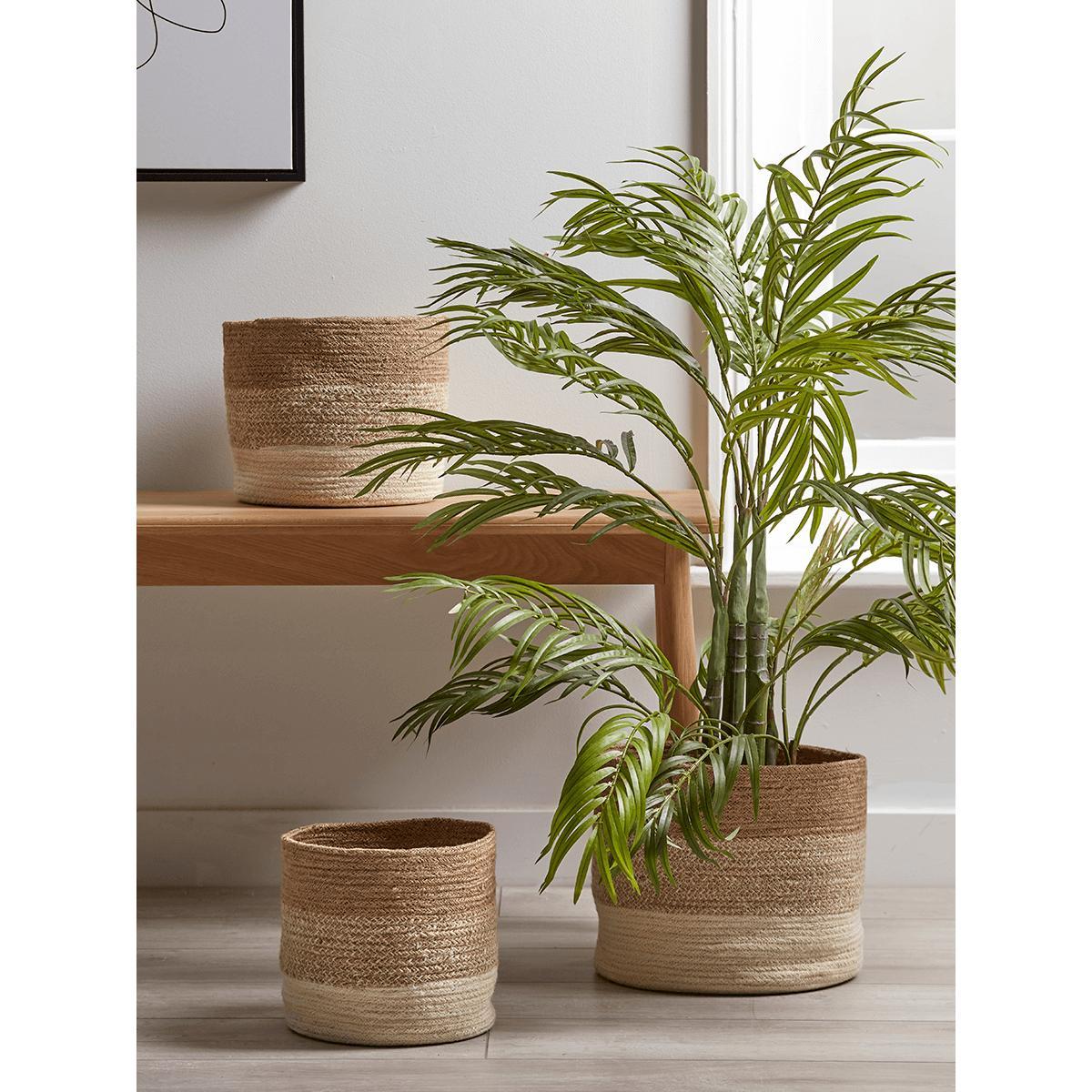 I love these graduated stripe baskets for their versatility and natural texture, making them a practical yet stylish addition to many interiors. They work particularly well in coastal, boho, or Scandinavian-inspired spaces, adding warmth and organisational charm. Practical styling tips include using the largest one as a statement plant holder-like in the image-while the smaller baskets are perfect for storing everyday essentials such as blankets, toys, or laundry. Their neutral tones ensure they blend seamlessly with a variety of colour palettes, and their graduated size allows for flexible display options, helping to keep spaces tidy without sacrificing style.