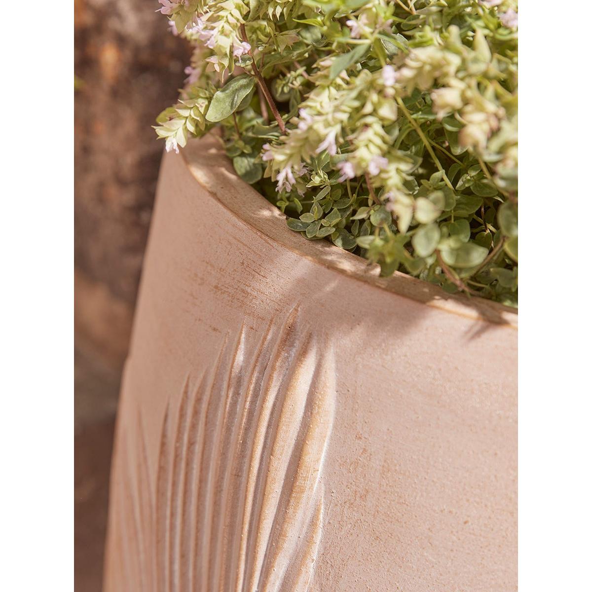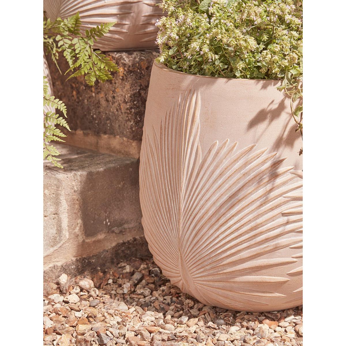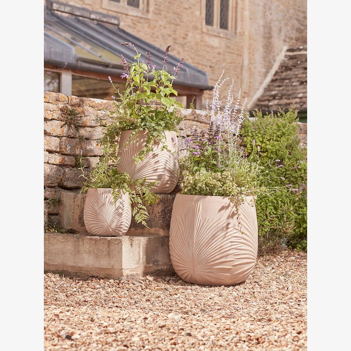 With their warm sand colouring and raised palm leaf pattern, these planters fully embody the rustic sun bleached appeal of our Tuscan Villa outdoor trend. Handmade in lightweight fibre clay, the set includes one each of three sizes of pot,  perfect for creating a layered effect with your planting.