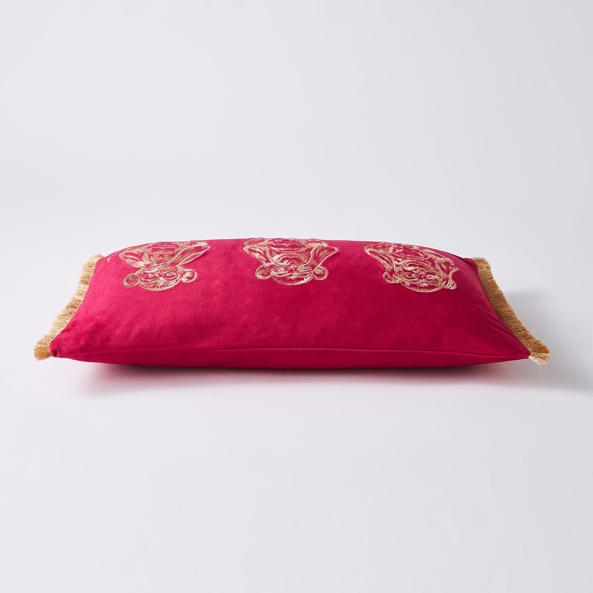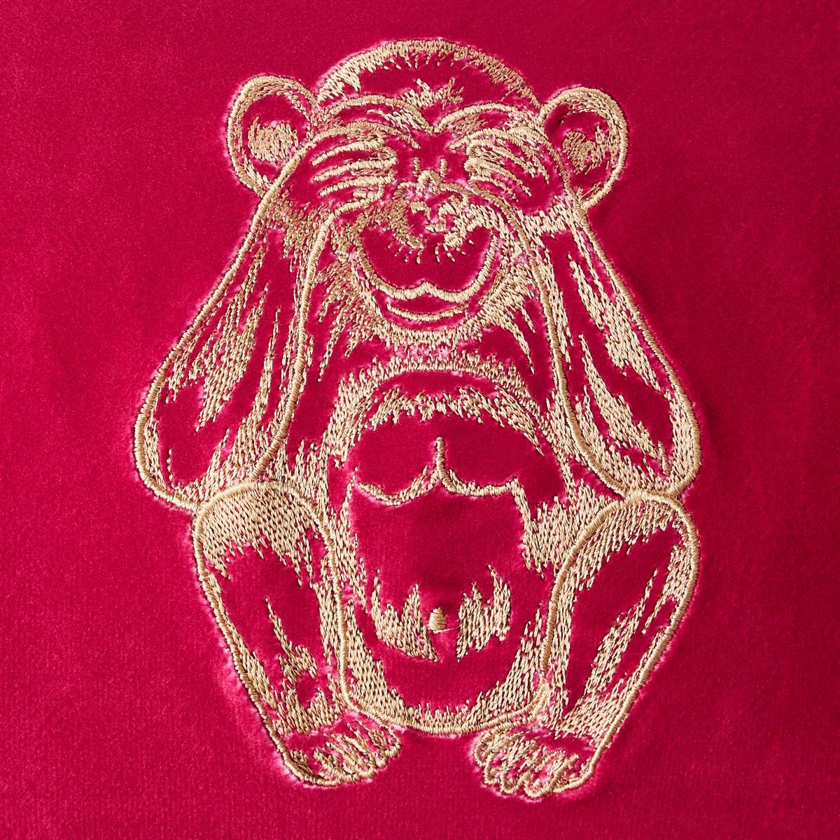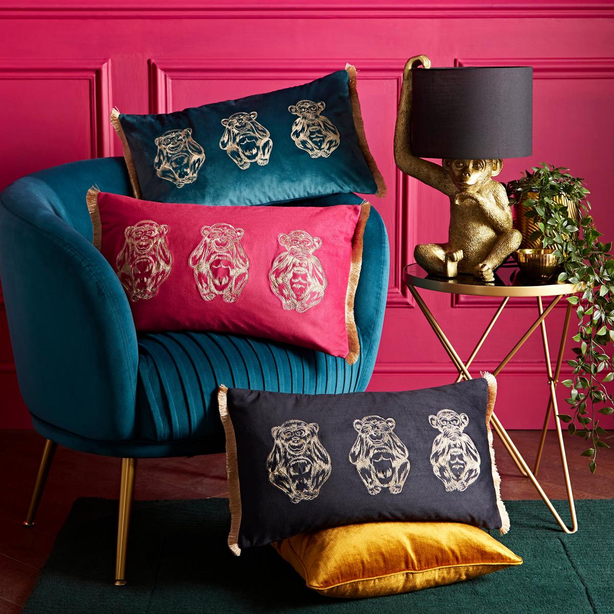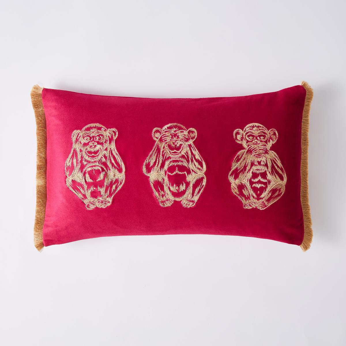 * Velvet Feel* Embroidered design* Available in three colourways Ideal for adding a touch of luxury to any room, this elegant cushion is fashioned from sumptuously smooth velvet fabric and features a gold embroidered monkeys design for an opulent finish. This cushion is completed with gold fringed edging for a sophisticated edge and is perfect for bringing colour and texture to your interior decor. Crafted with a removable cover for easy care, this cushion is filled with plump and durable polyester to ensure lasting comfort and a full shape.
