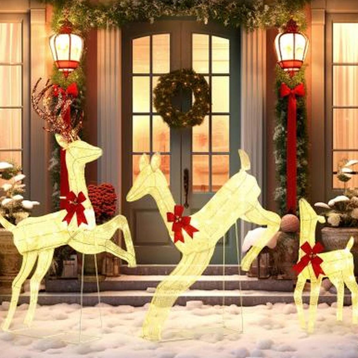 An enchanting scene for your Christmas outdoors, with this reindeer Christmas decorations. Formed of a Buck, a Doe and a Fawn, all together and complementing each other. Made from metal, the frames are solid: they keep in shape to be used time and again. covered in 300 LED lights, this garden reindeer lights the area beautifully - great for night times! With an IP44 rating, it is water-resistant - suitable for covered outdoor use. Power Cord Line Length: 5 m. Three Piece LED Light Reindeer Christmas Decoration - Warm white