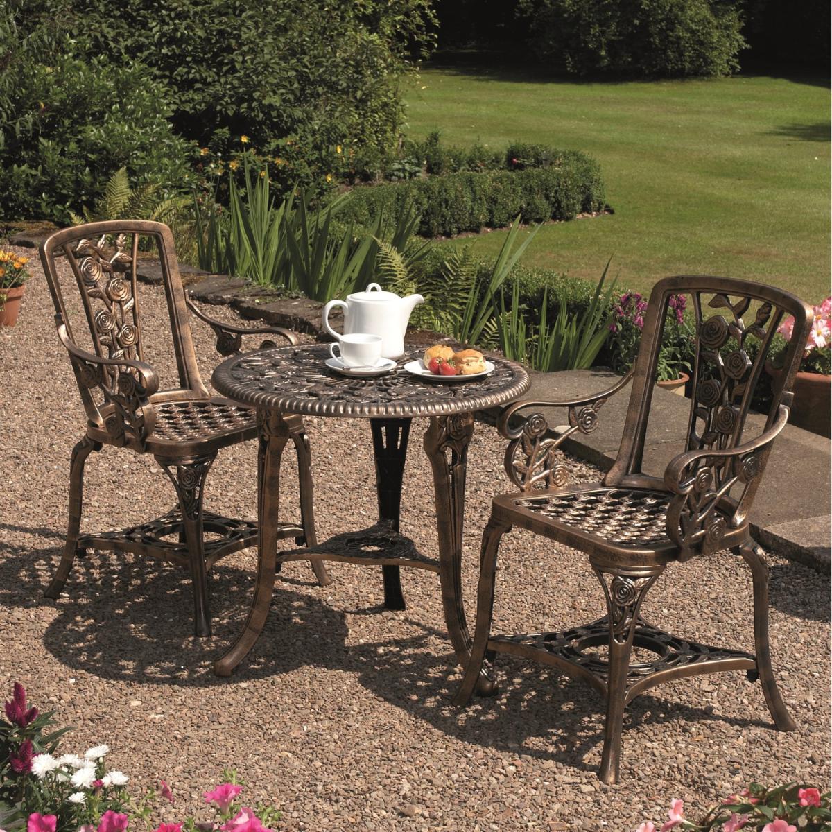 The three-piece rose bistro set in bronze offers a timeless yet versatile option for garden spaces. I love how its classic design complements both traditional and contemporary outdoor settings, adding a touch of elegance without feeling formal. It's perfect for intimate meals or a relaxed coffee spot, especially when styled with cushions or a lightweight tablecloth. Practical styling tips include pairing it with potted plants or string lights for cosy evenings, and utilising durable, weather-resistant accessories to keep the warm bronze finish in top condition. This set works well in gardens with cottage garden charm or modern minimalist landscapes, making it a flexible choice for various outdoor styles.