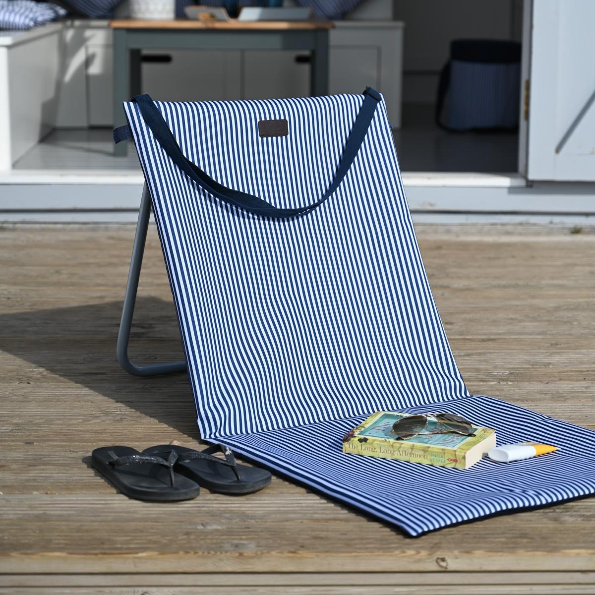 Indulge in ultimate relaxation with the Three Rivers Foldable Chair, perfect for your next picnic. Designed in classic blue and white stripes, it's sure to be a statement piece in any outdoor space. This chair is a combination of a beach mat and a reclining lounger, making it the perfect choice for those who want to soak up the sun in comfort. The lightweight and foldable design allows for easy transport and storage, and it can even be carried over your shoulder thanks to the integrated strap. Made from tubular steel and polyester, the chair is both durable and comfortable, with lightly padded showerproof fabric that dries quickly. There's even a large pocket in the backrest for your convenience. This chair is easy to clean and coordinates with other products in the Three Rivers picnic range.