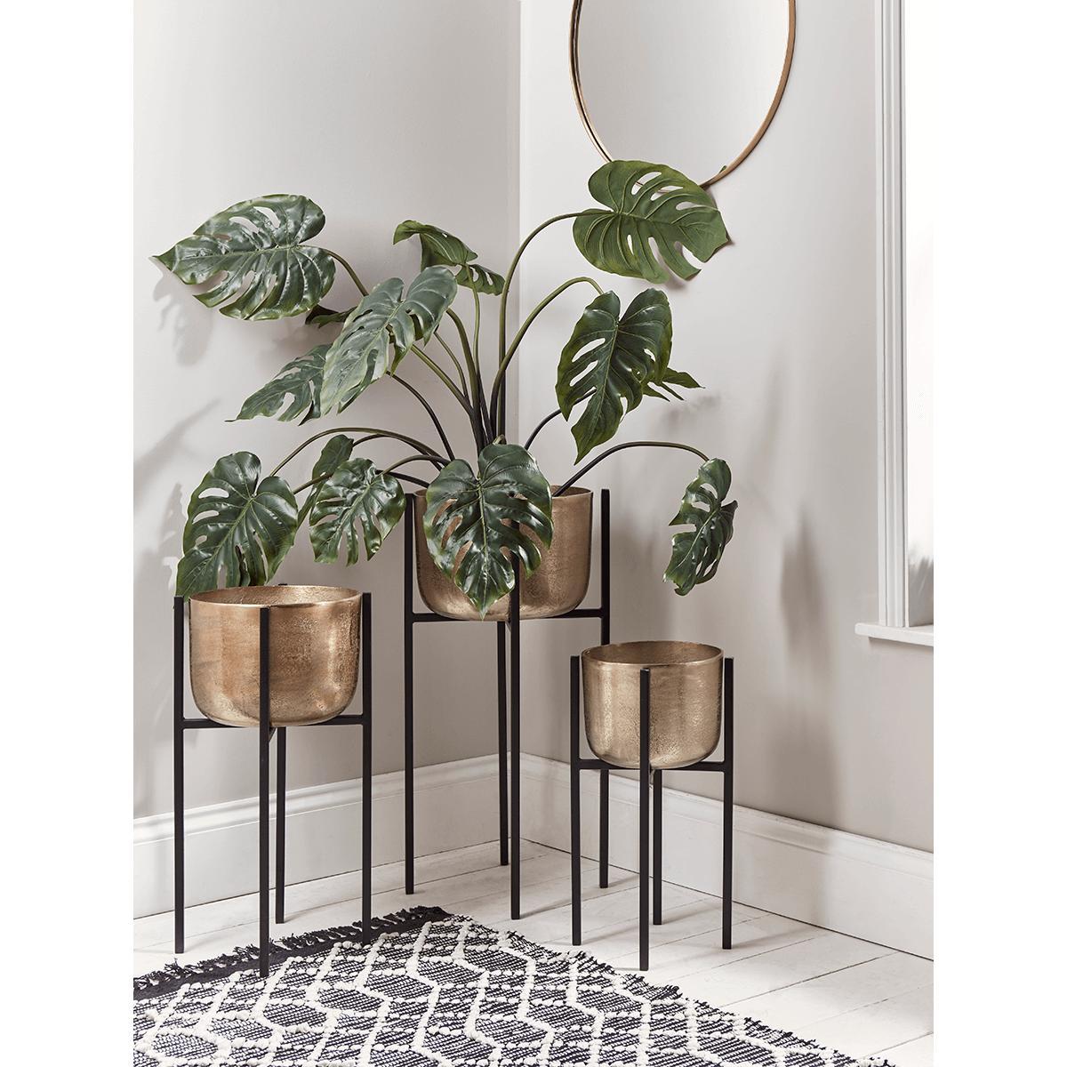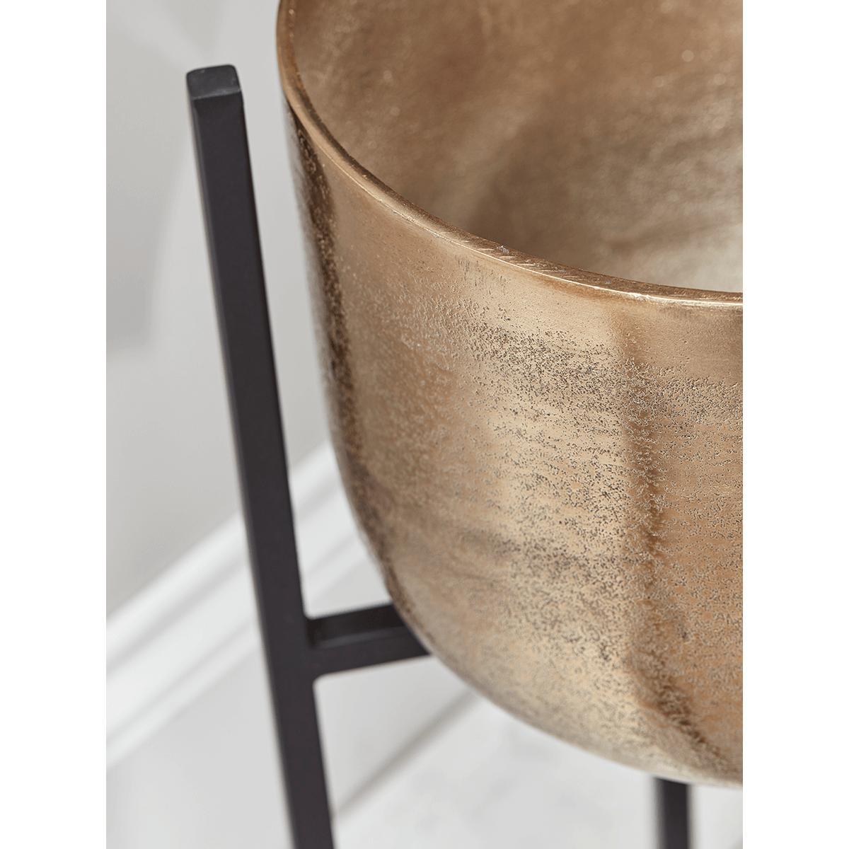 Crafted from aluminium with a light brass toned finish our bowl bodied planters sit on a striking frame to make a real impact in your home. Our set of three can be placed together for a botanical feature or spread about the home - the perfect home for your favourite flowers and shrubs.