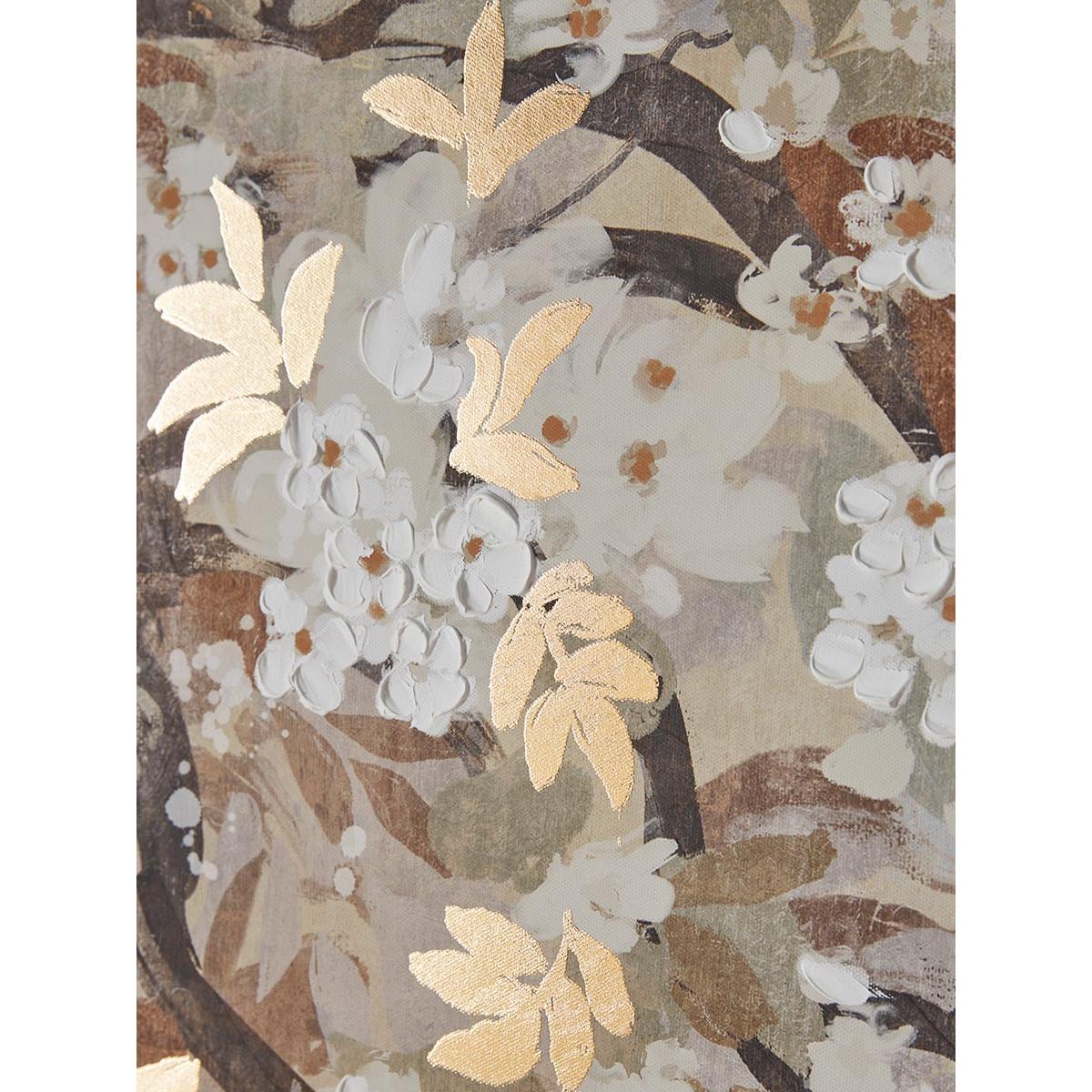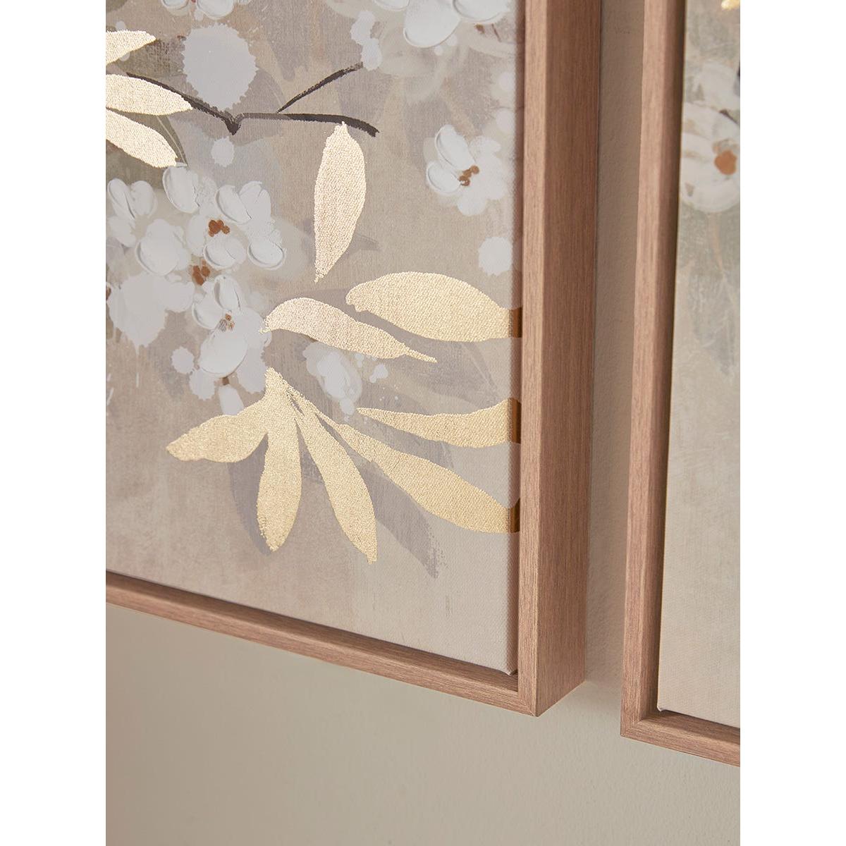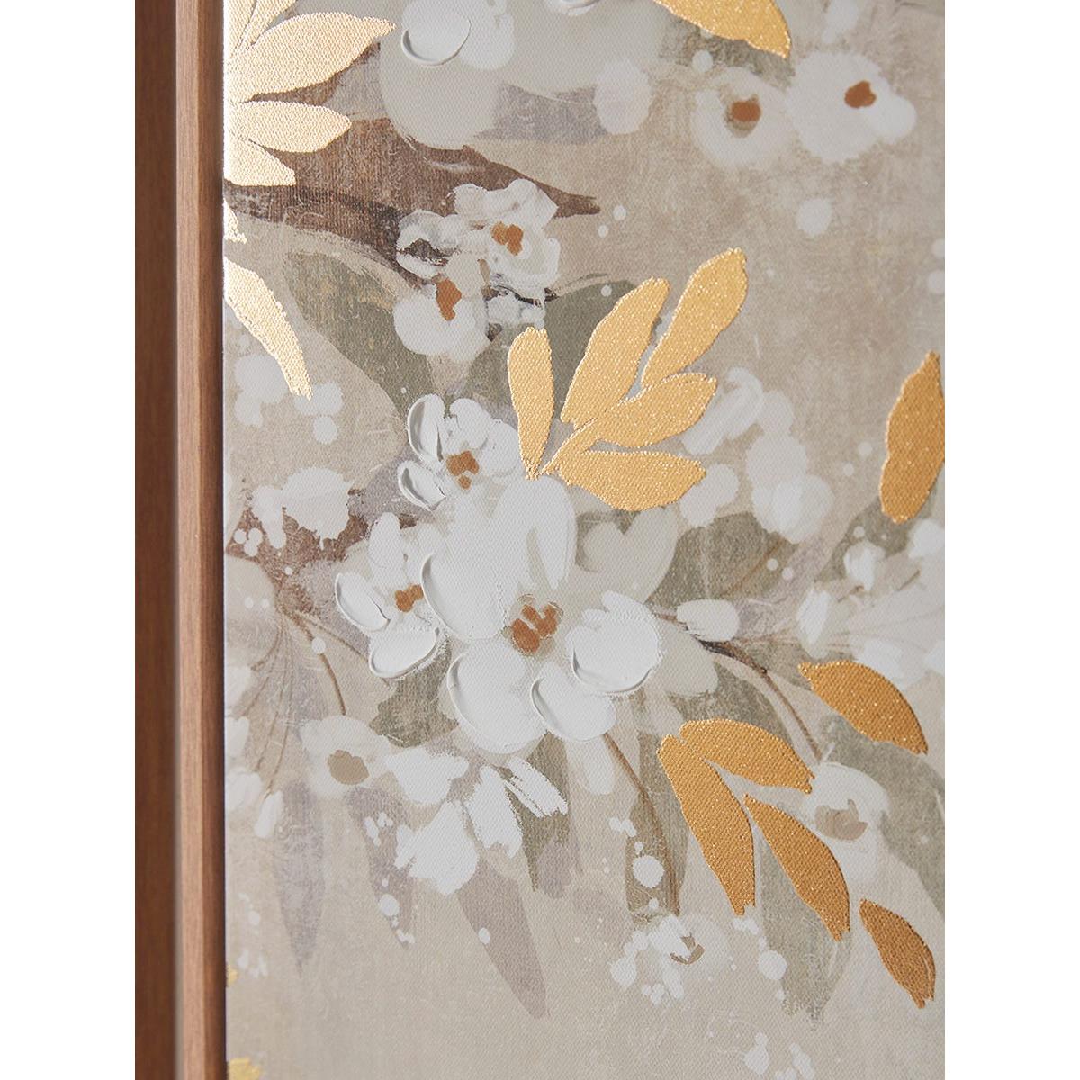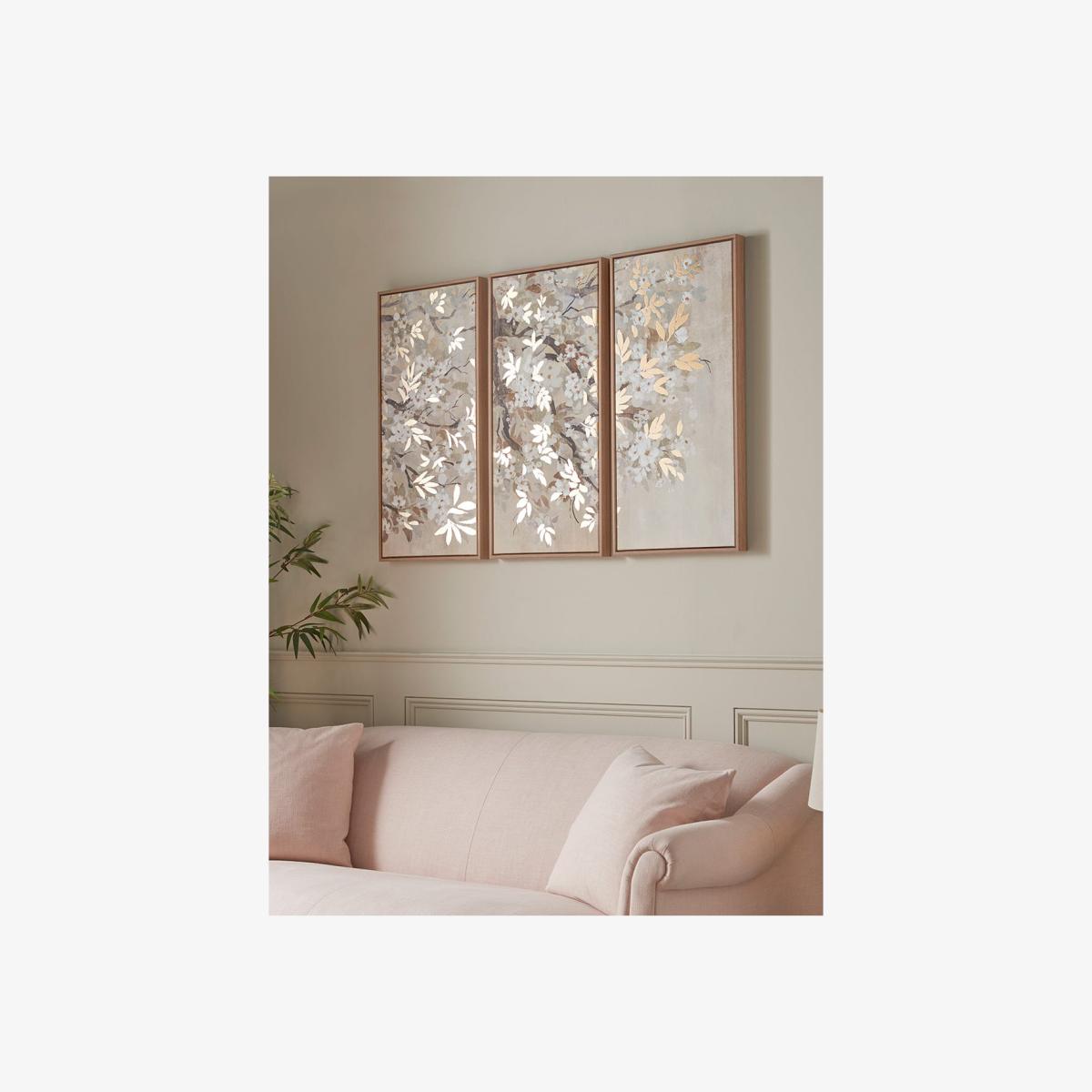 Delicate white flower blossom is sprinkled across dark boughs of bronze and rust and highlighted with top notes of metallic gold leaves in our charming new trio of canvas pictures. With a design that progresses across all three canvases, this set of wall art pieces will provide an inviting backdrop to any room. Each canvas has a free-floating wooden frame.