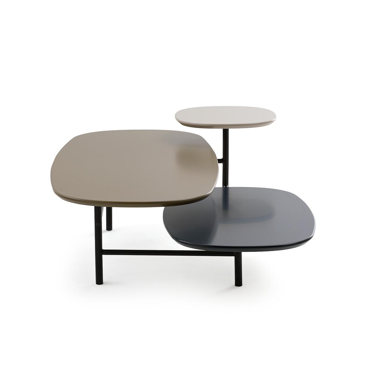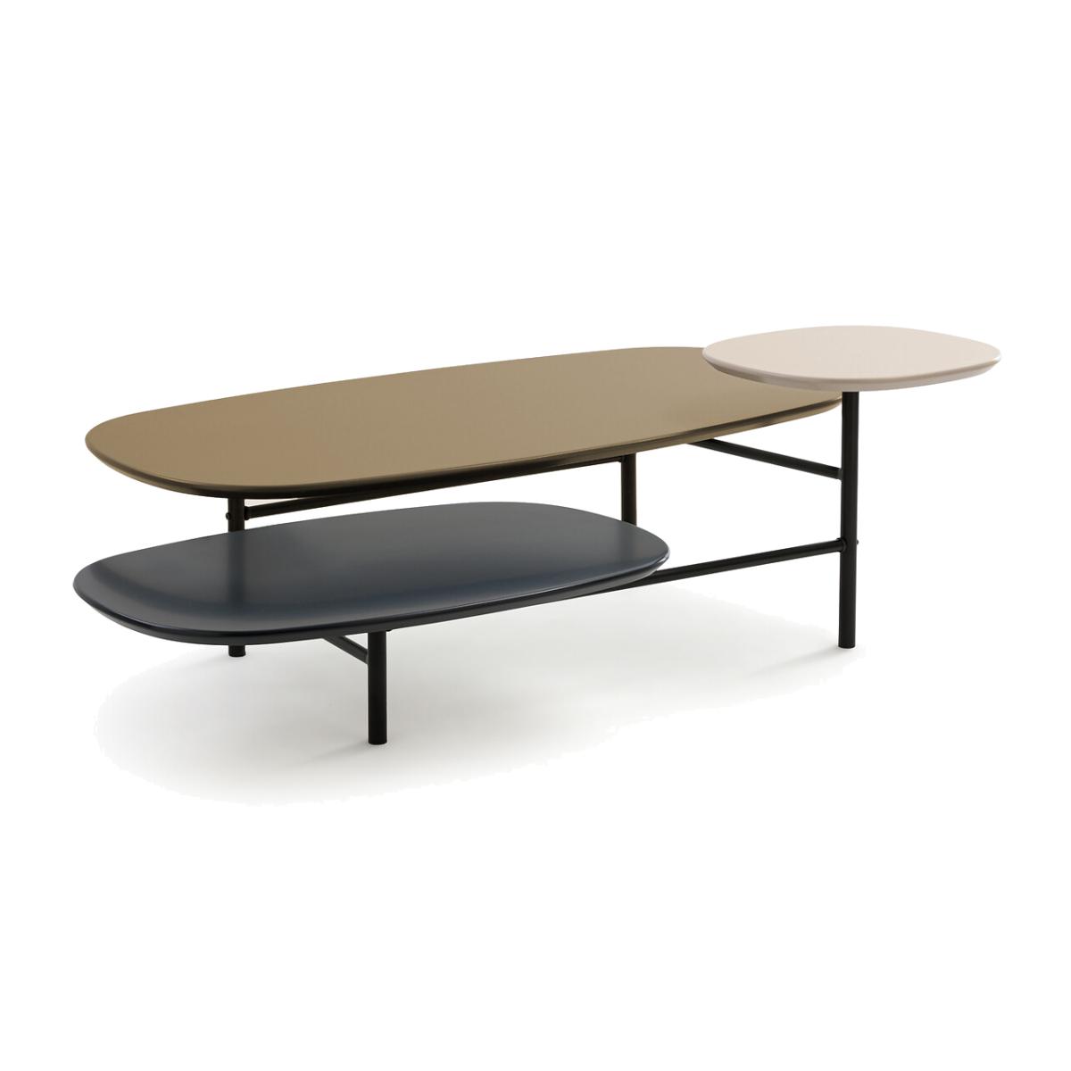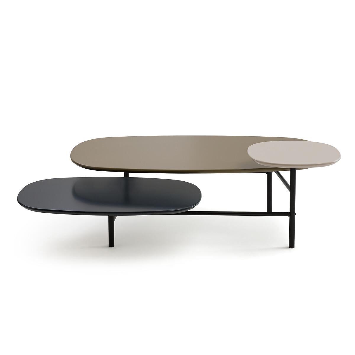 To celebrate our 10 years of design, we have chosen to reissue the collabs that have marked the history of La Redoute Interiors. (Re)discover these emblematic creations, published in limited series. Designed by Guillaume Delvigne, this coffee table creates the visual impact of a contemporary sculpture in the living room. With its three lacquered tops with variable geometry and its tubular base in matte black steel, it is as beautiful as it is functional. Elegant and totemic. Product Details • 3 coloured tops in matte lacquered MDF, thickness 22mm, polyurethane finish • FSC® certified wood • Base in epoxy-finished iron tubes, matte black lacquered • Polypropylene glides. Care Advice • To protect your coffee table, consider trivets, coasters and placemats. Dimensions. Overall • Width: 140cm • Height: 45cm • Depth: 90cm. Usable space • Large tabletop: L120 x H20 x D60cm • Middle tabletop: L80 x H20 x D50cm • Small top: L40 x H20 x D40cmDelivery:. Sold pre-assembled. Available for home delivery. • WOOD FROM SUSTAINABLY MANAGED FORESTS. FSC® certified wood comes from forests that are environmentally, socially and economically well managed. Dimensions and weight of parcel2 parcels • L81 x H15 x D62cm. 5.2kg • L129 x H9 x D67cm. 19.6kg