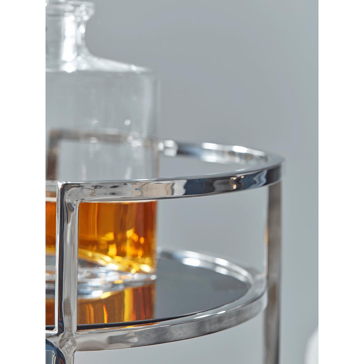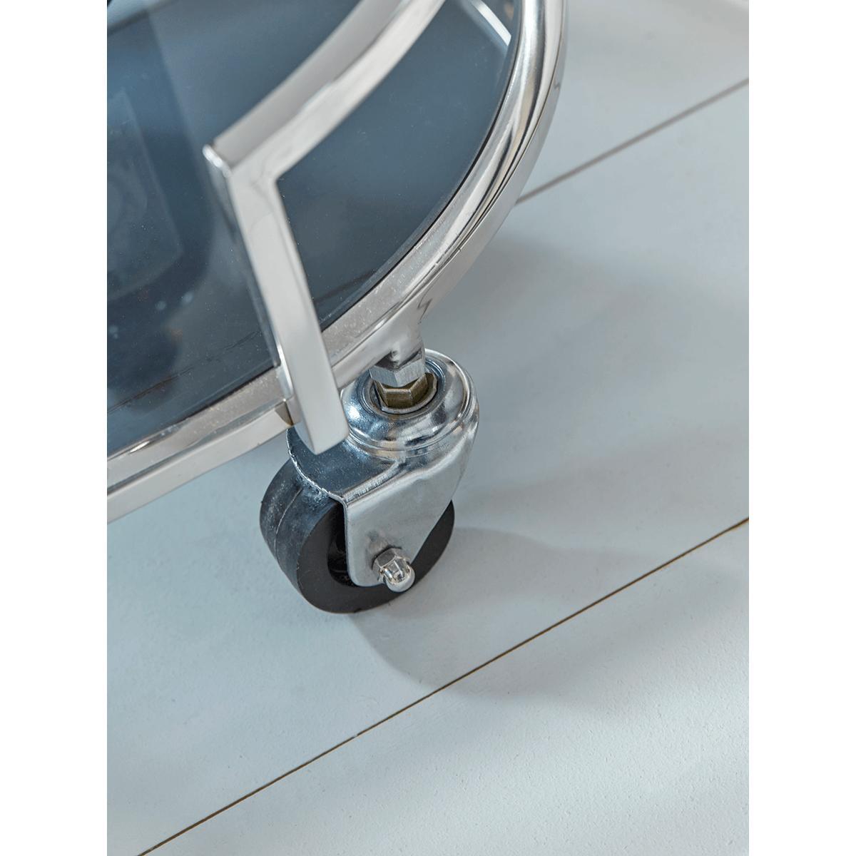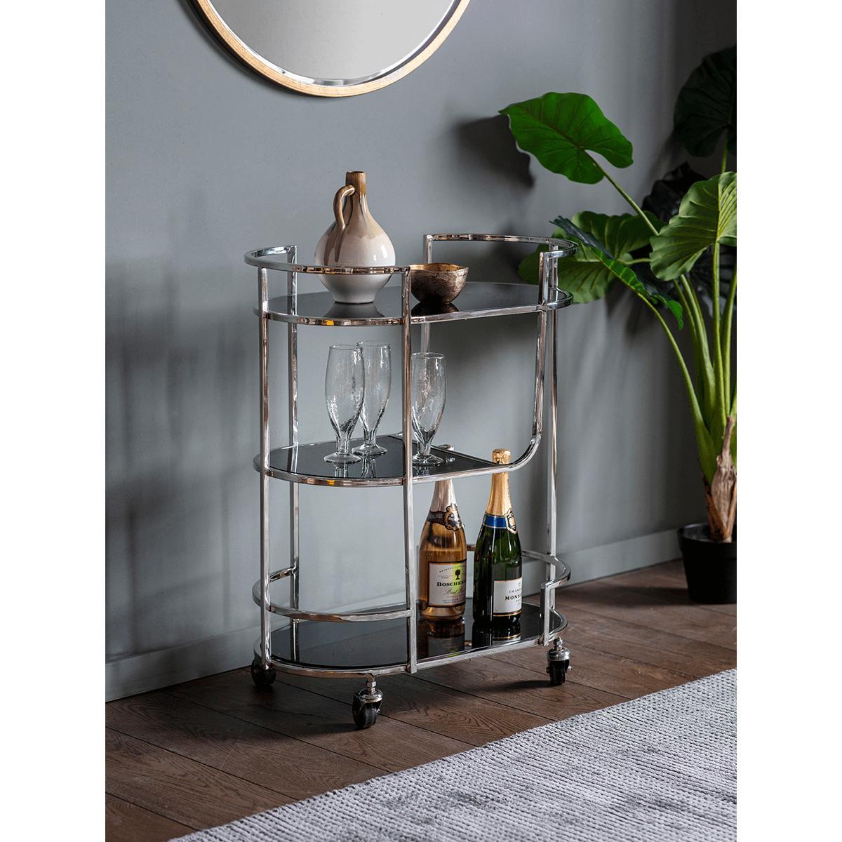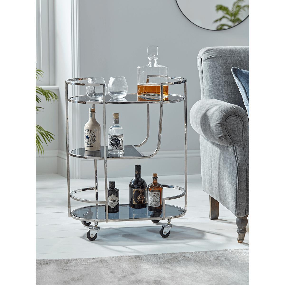 Elevate your hosting with our beautiful three-tier drinks trolley, conveniently on wheels it comes with a striking smoke mirrored-effect on the glass tray shelves and a luxe polished steel curved frame. A timeless addition for those entertaining at home, in style this season.