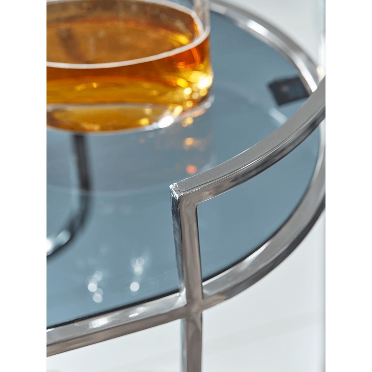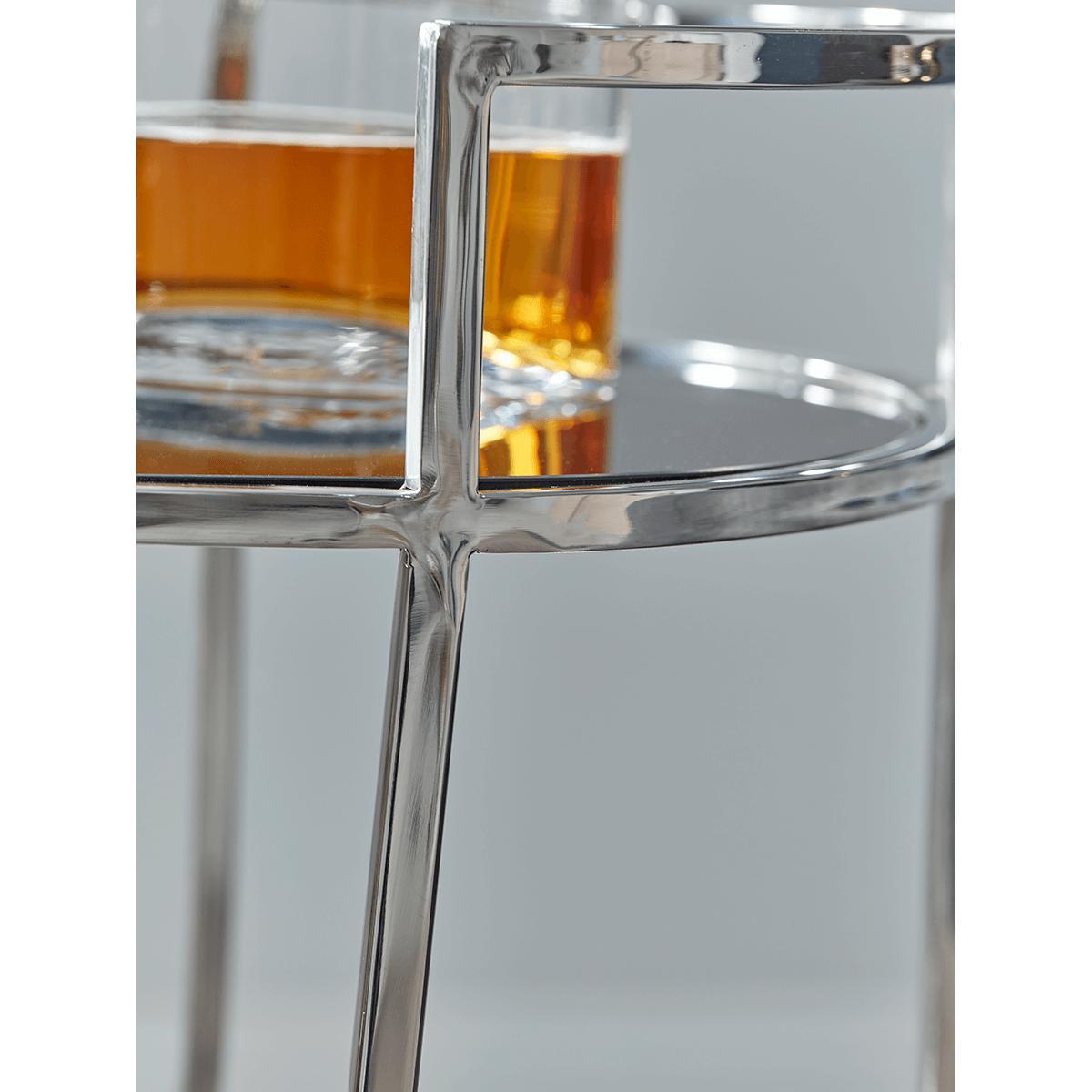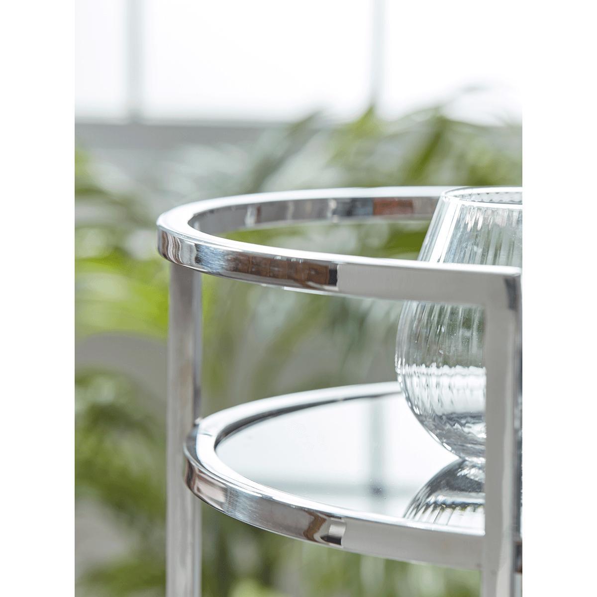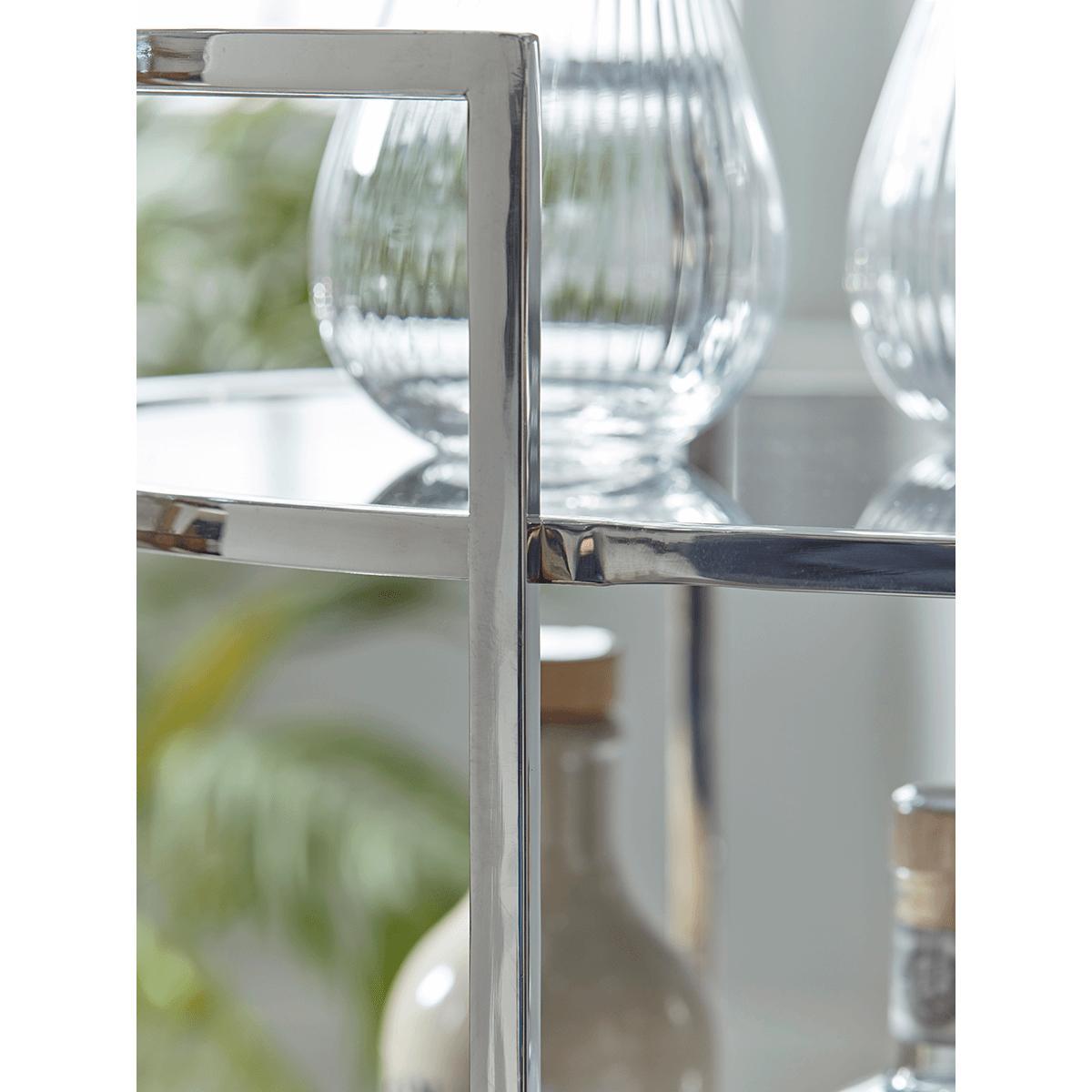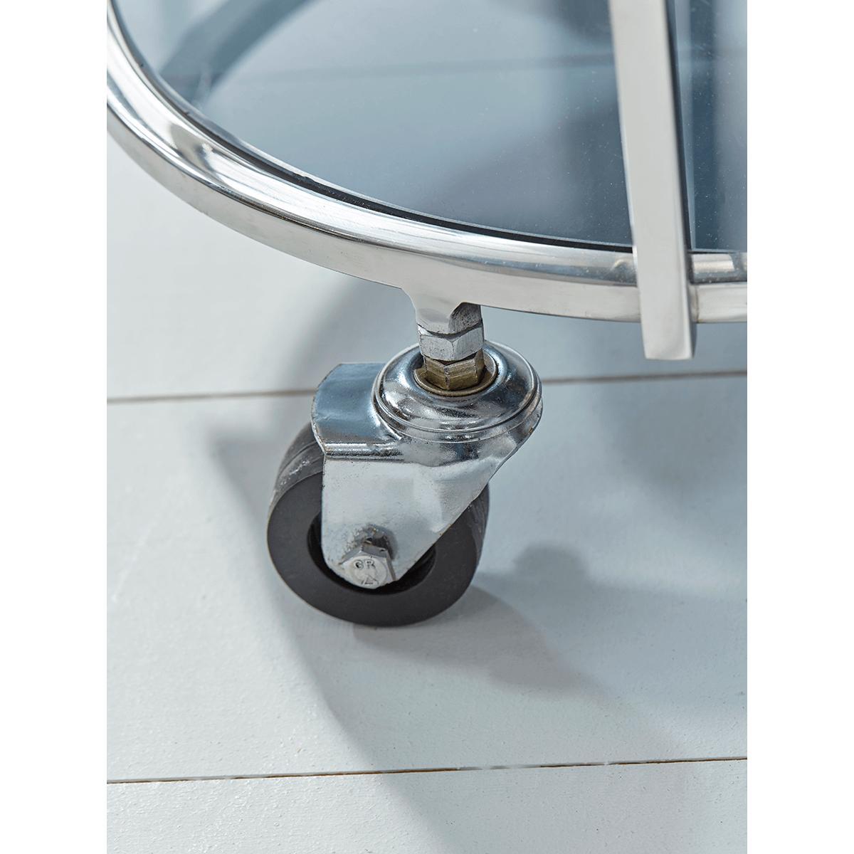 Elevate your hosting with our beautiful three-tier drinks trolley, conveniently on wheels it comes with a striking smoke mirrored-effect on the glass tray shelves and a luxe polished steel curved frame. A timeless addition for those entertaining at home, in style this season.