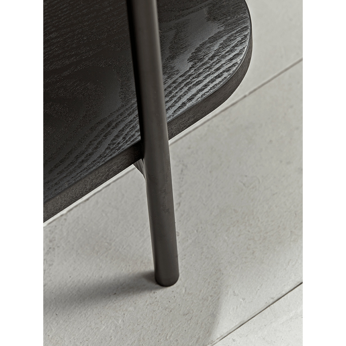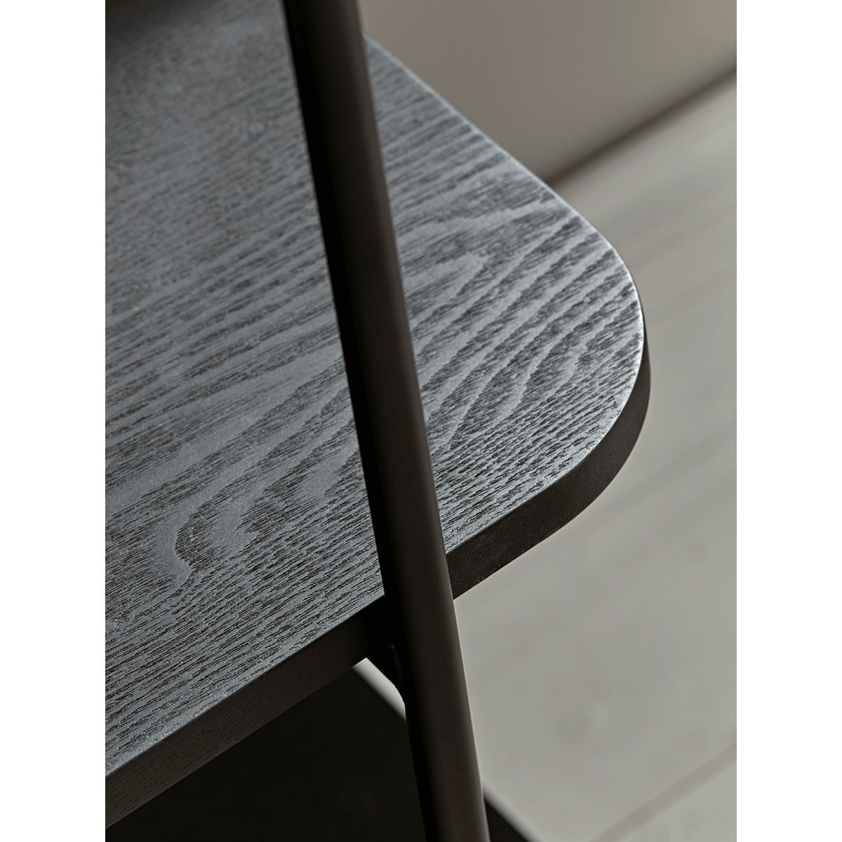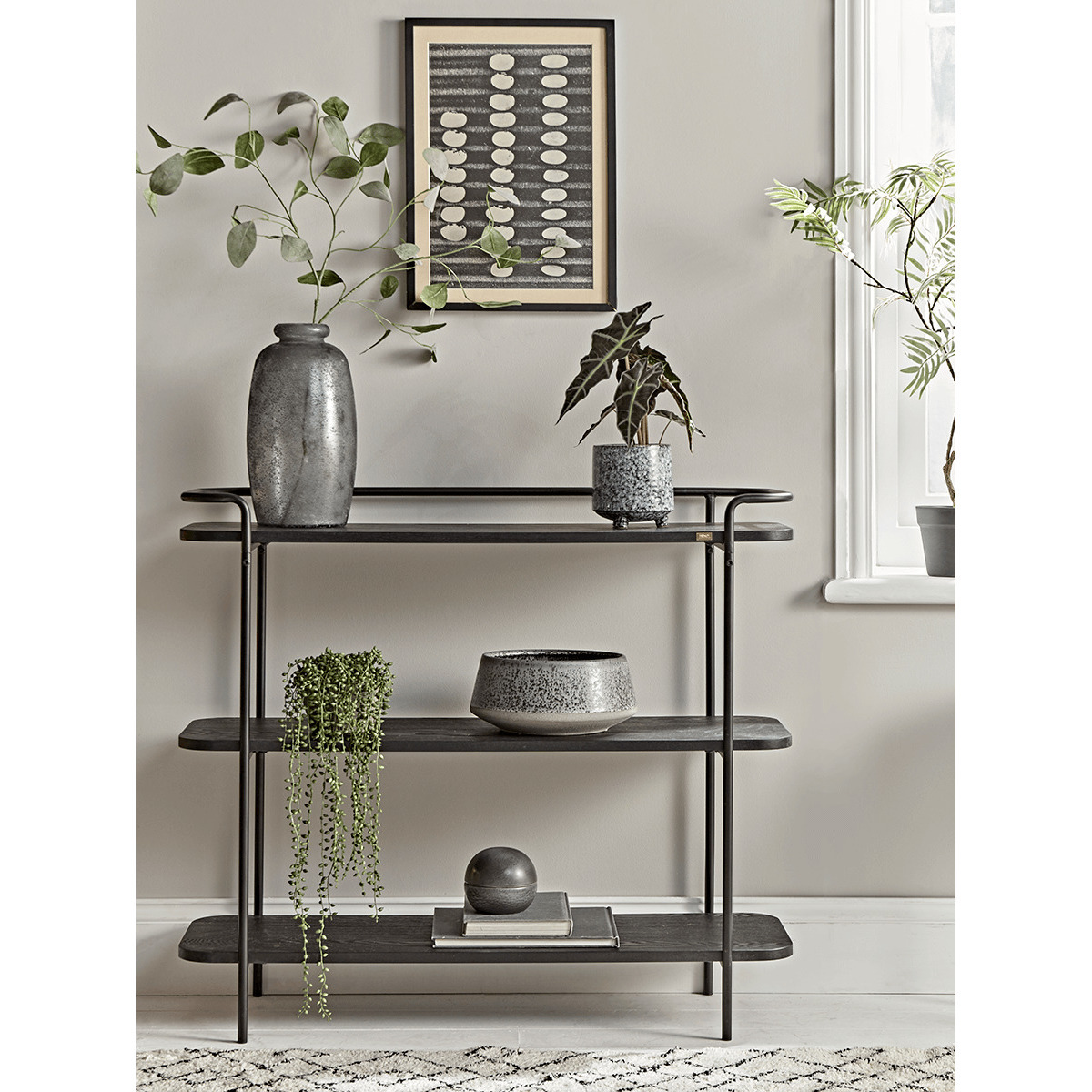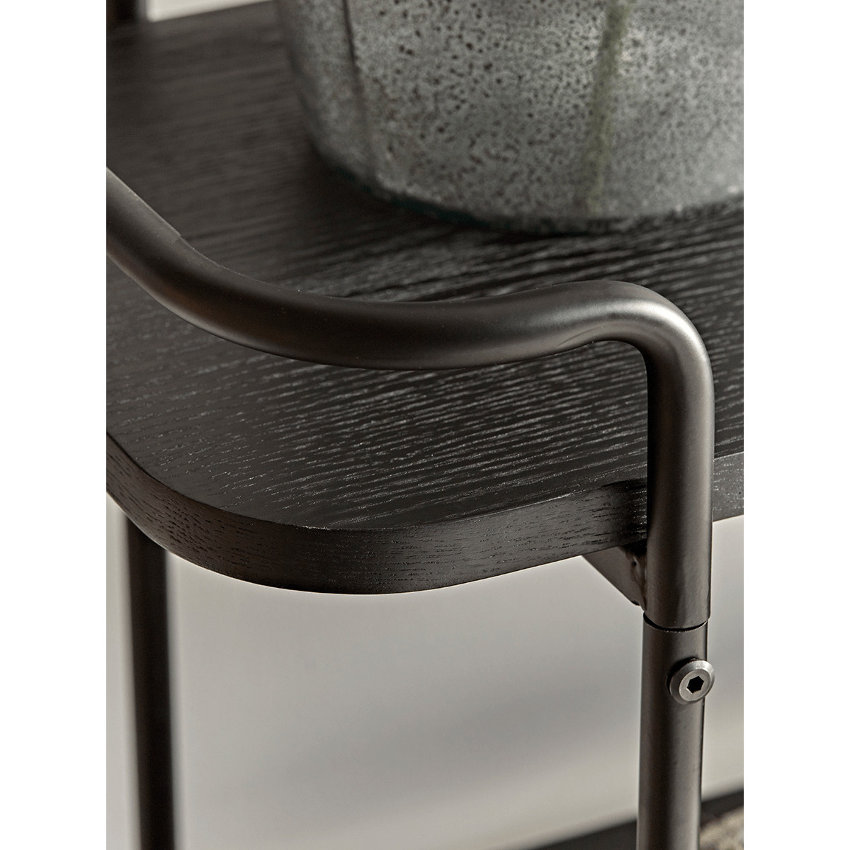 Contemporary, sleek and feminine, our elegant storage console features a slender black metal frame and three rounded rectangular shelves. Each wooden shelf has a black stain and visible wood grain.