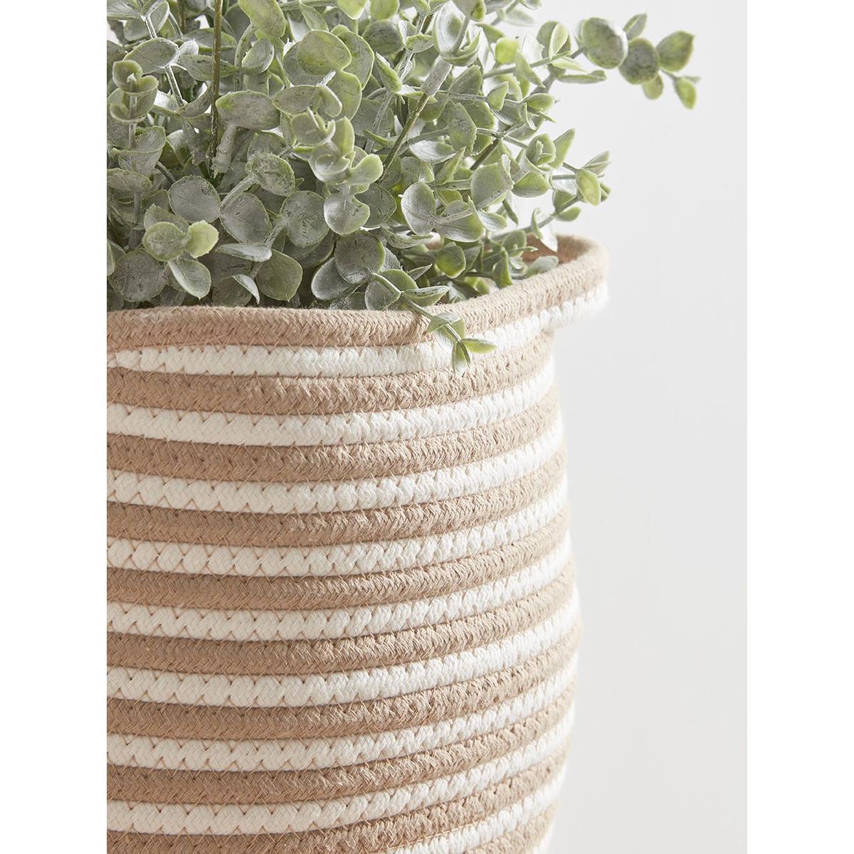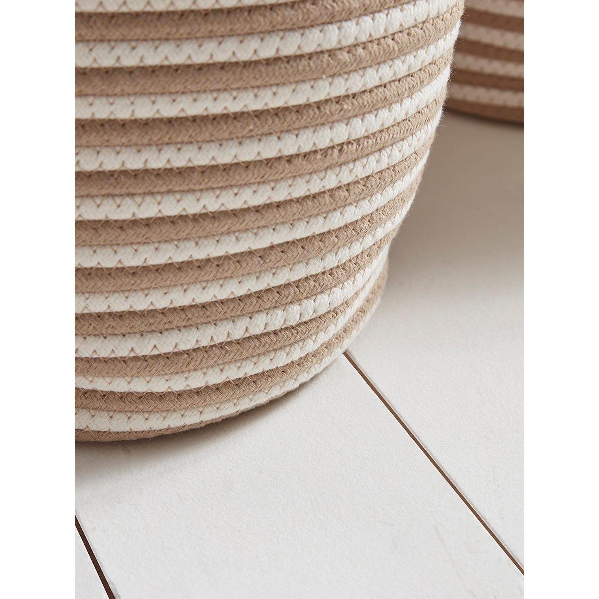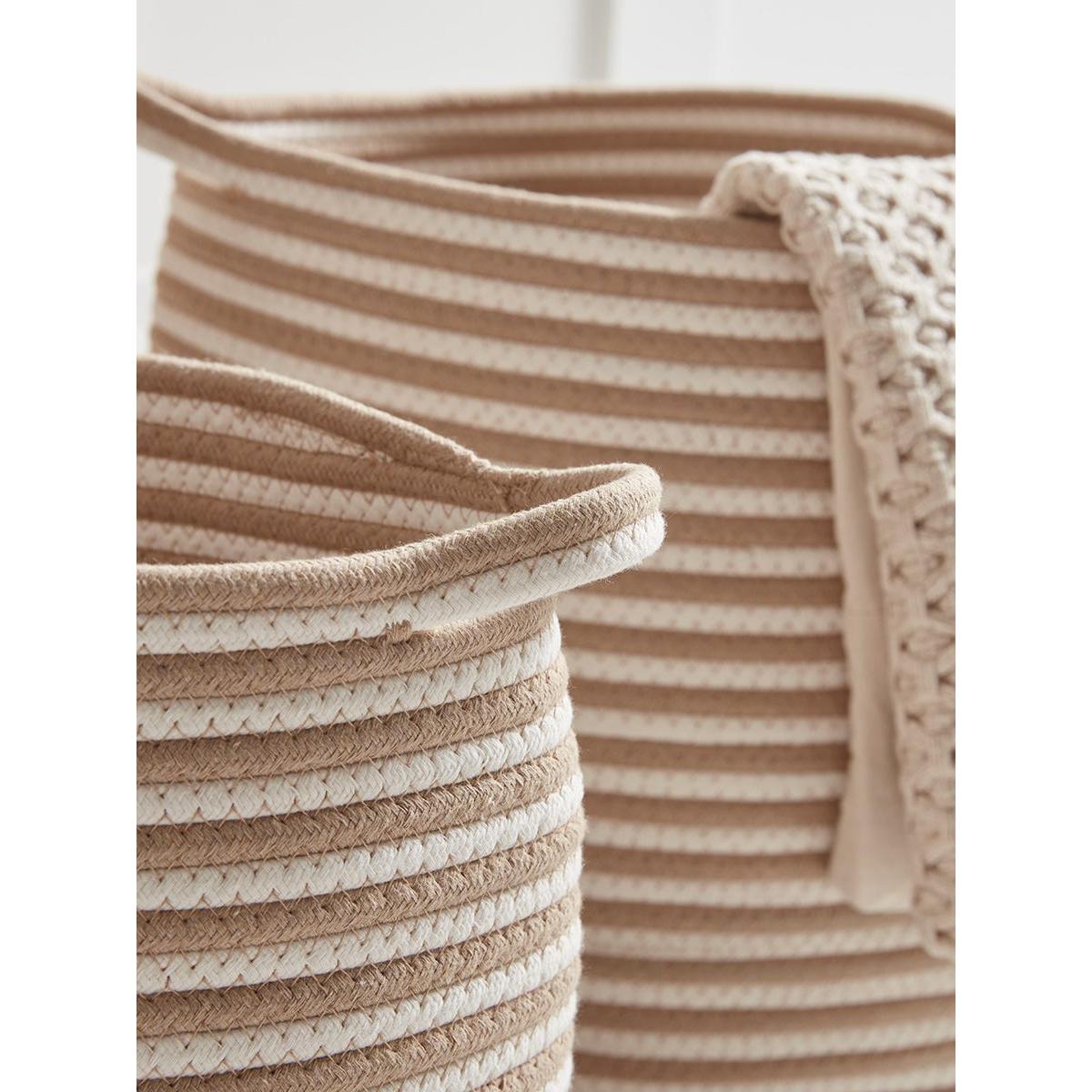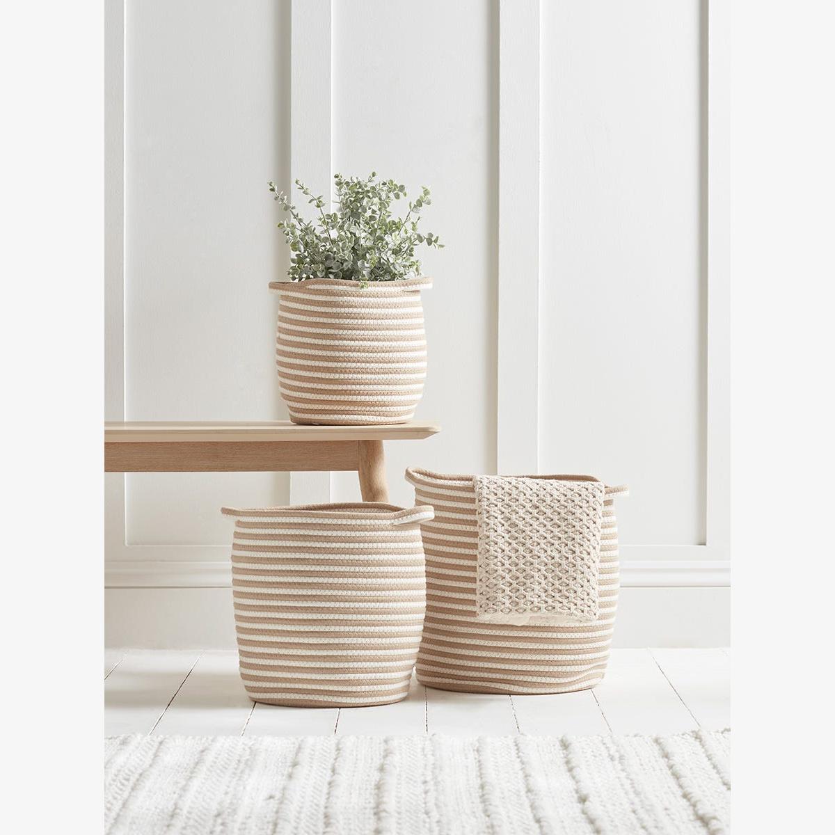 Endlessly versatile and naturally good looking, this set features three baskets a striped weave of white and natural toned polyester rope. With a small, medium and large basket in each set, the baskets feature simple slit handles to the side making them easy to move around and offering plenty storage options for any room in the house.