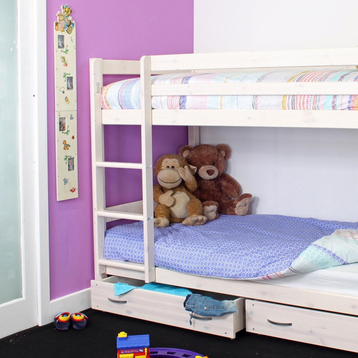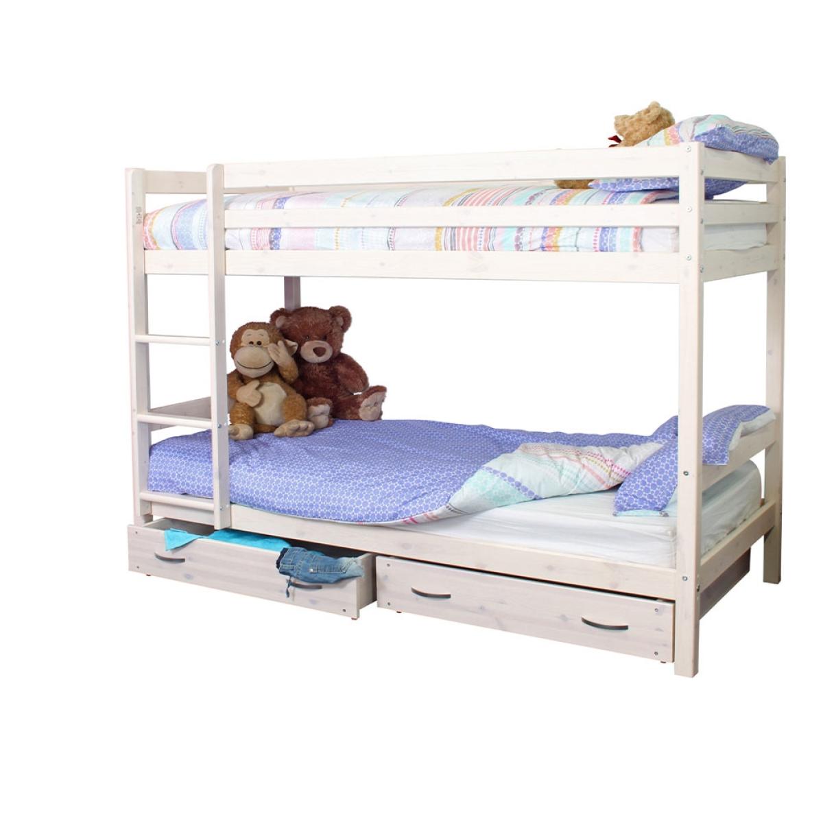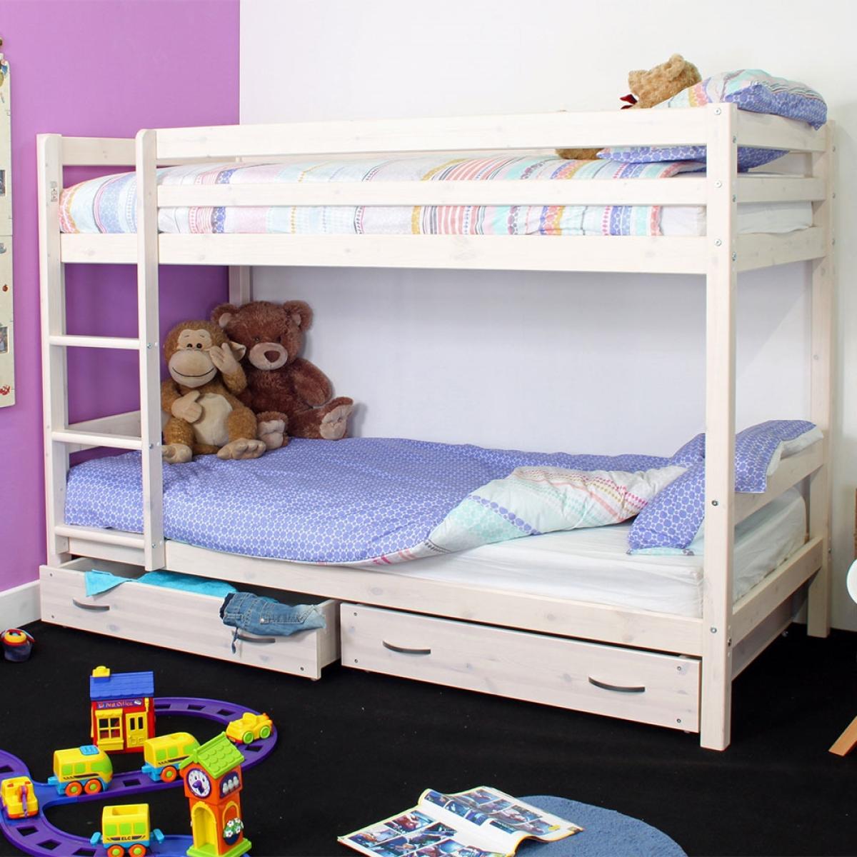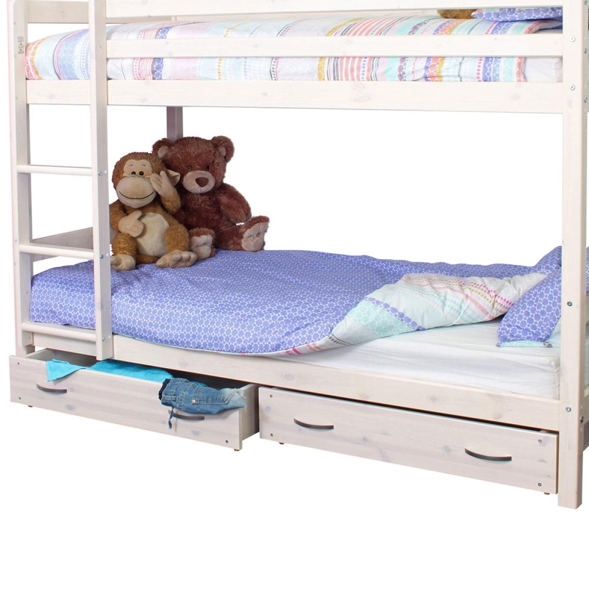 The Thuka HIT 6 Bunk Bed and Drawers makes bedroom sharing simple! Saving space where you might be short on square footage, kiddies can bunk up and use all of the extra room for other furniture. And most importantly - for playing! Complete with two underbed storage drawers with contemporary style handles, each child gets a separate spot for clothes, bedding, games or toys. Crafted from quality Scandinavian pine wood with a light whitewash finish, any bedroom colour scheme is made possible. Style the bunks with bedding to suit each kiddies personality and sharing won't be so bad!.