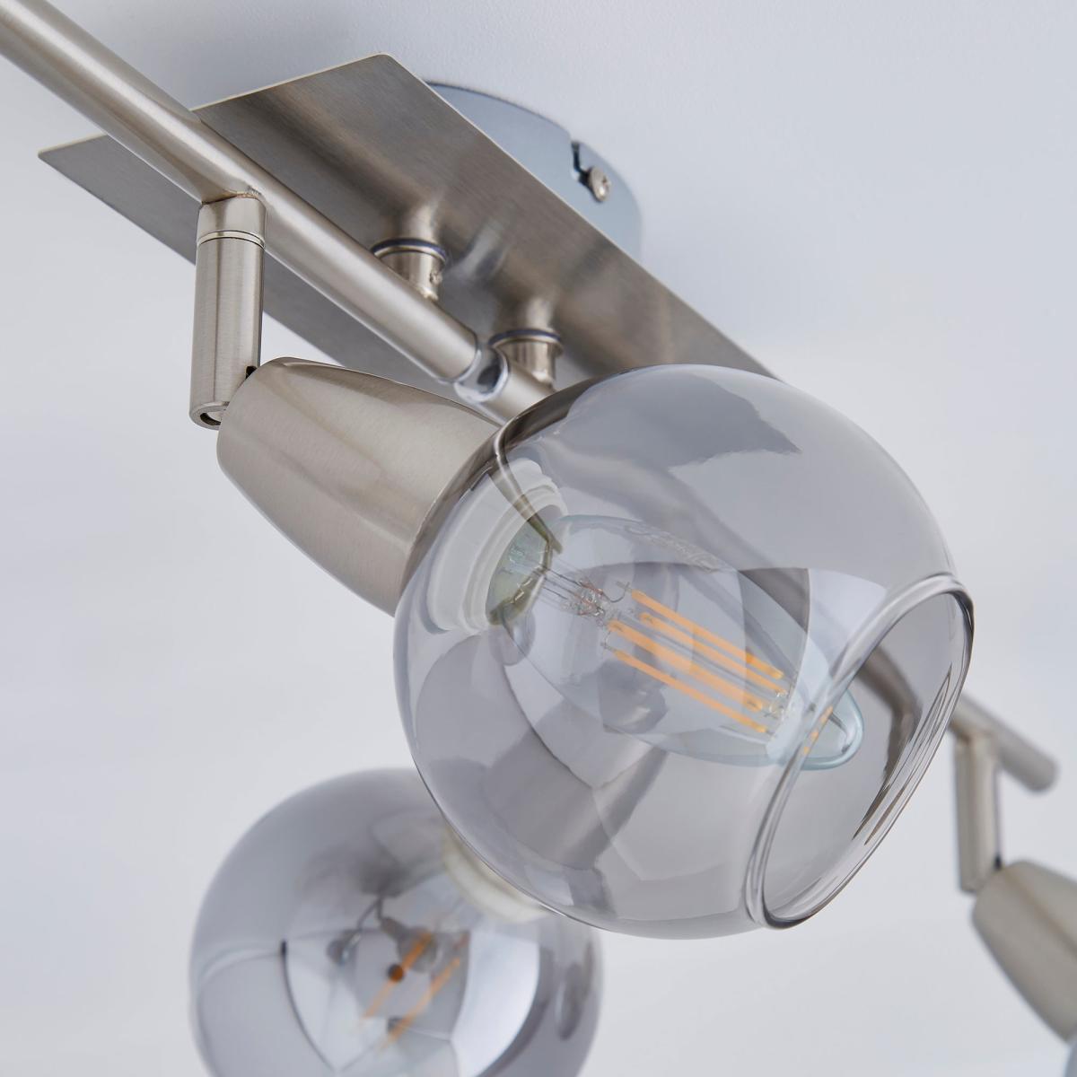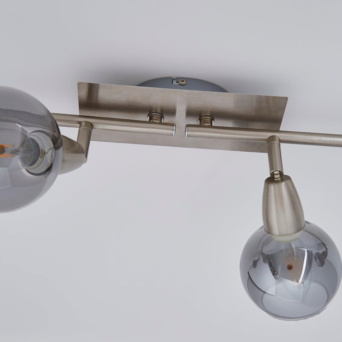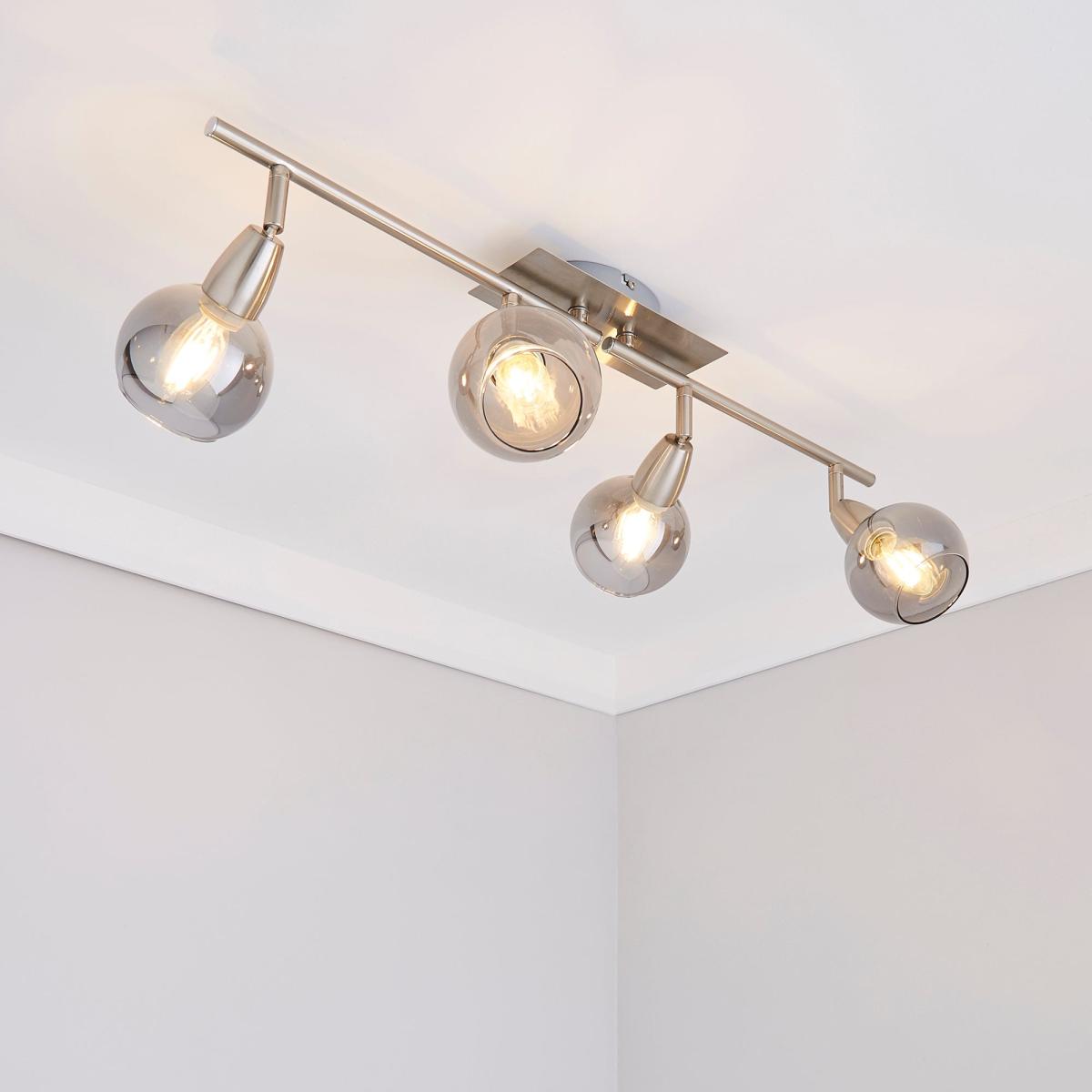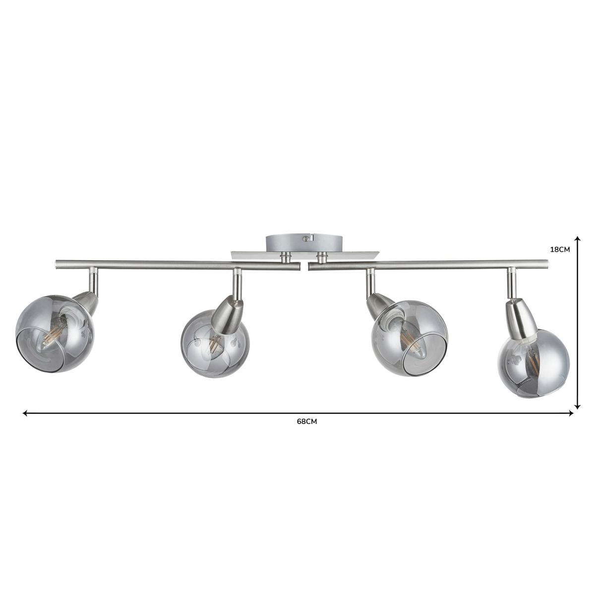 * Bulb required: 4 x 6W E40 Round * Bulb not included * Dimmable * Available in Frosted and Pink glass shades * Satin brushed gold effect plate * 4 adjustable spotlight heads * Split bar for further adjustability * Matching family items available * Other colours available This modern light fitting features adjustable glass shades, available in smoked with a nickel base, and frosted or pink glass with a complementing gold base. This spotlight bar is dimmable and available in other colours, with matching family items available to help coordinate your home.