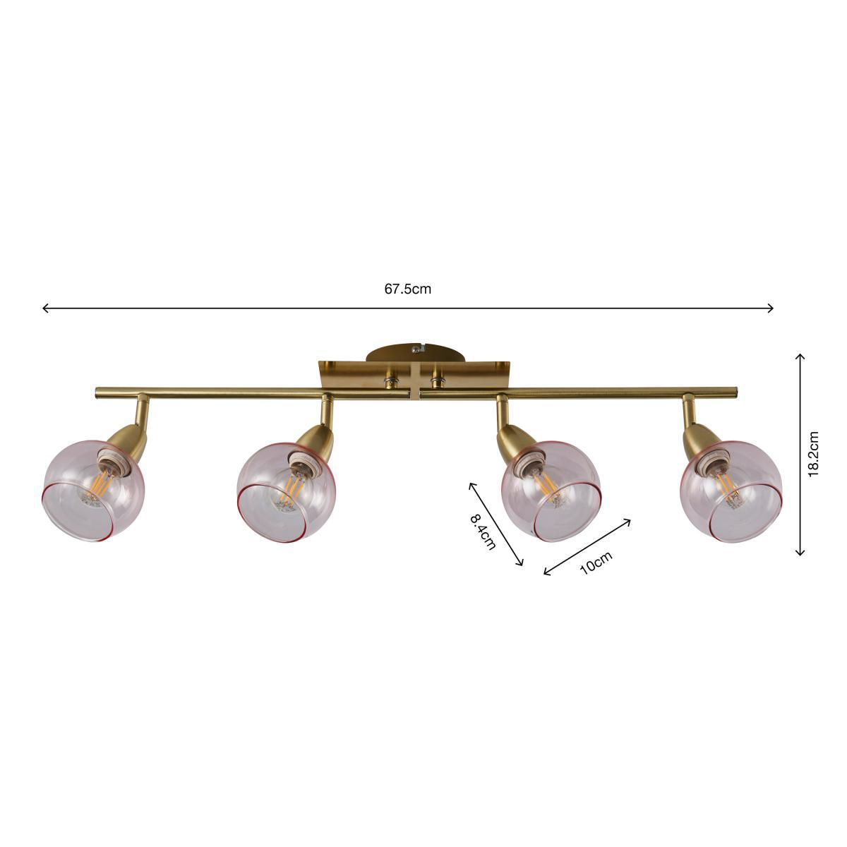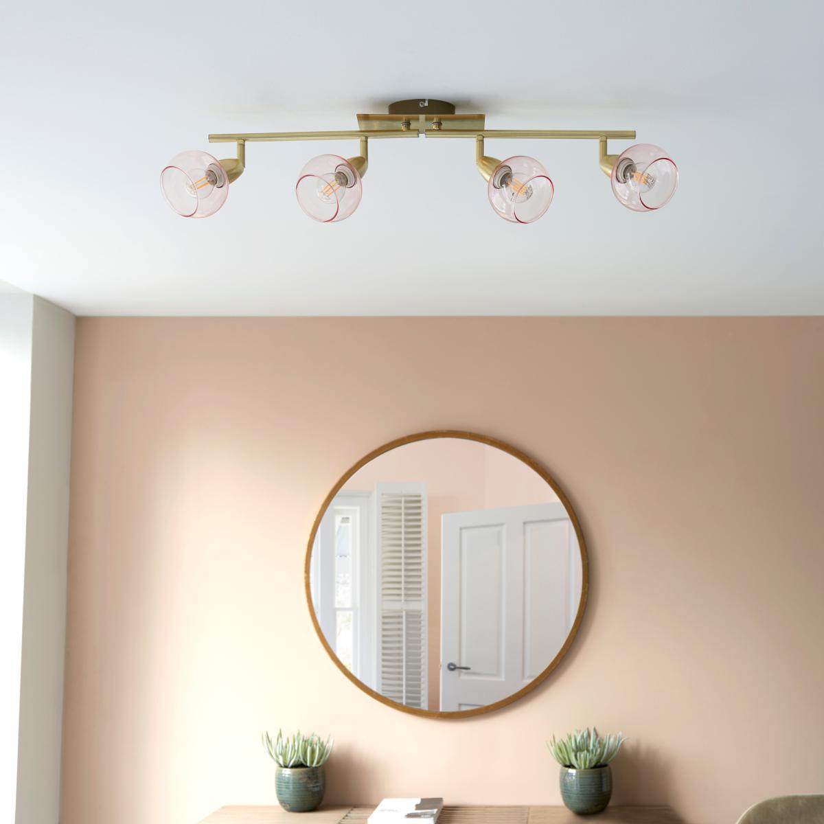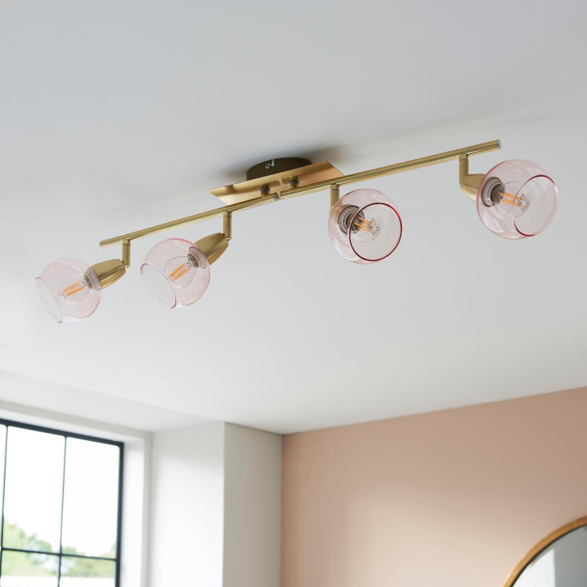 Brighten up your home with this stylish Tia 4 Light Spotlight Bar. This modern light fitting is available in a choice of frosted or pink glass shades with adjustable heads to allow for optimum direction of light and a satin brush gold effect finish on the base, the folding bar allows for greater adjustment options. This spotlight bar is dimmable and available in other colours, with matching family items available to help coordinate your home.