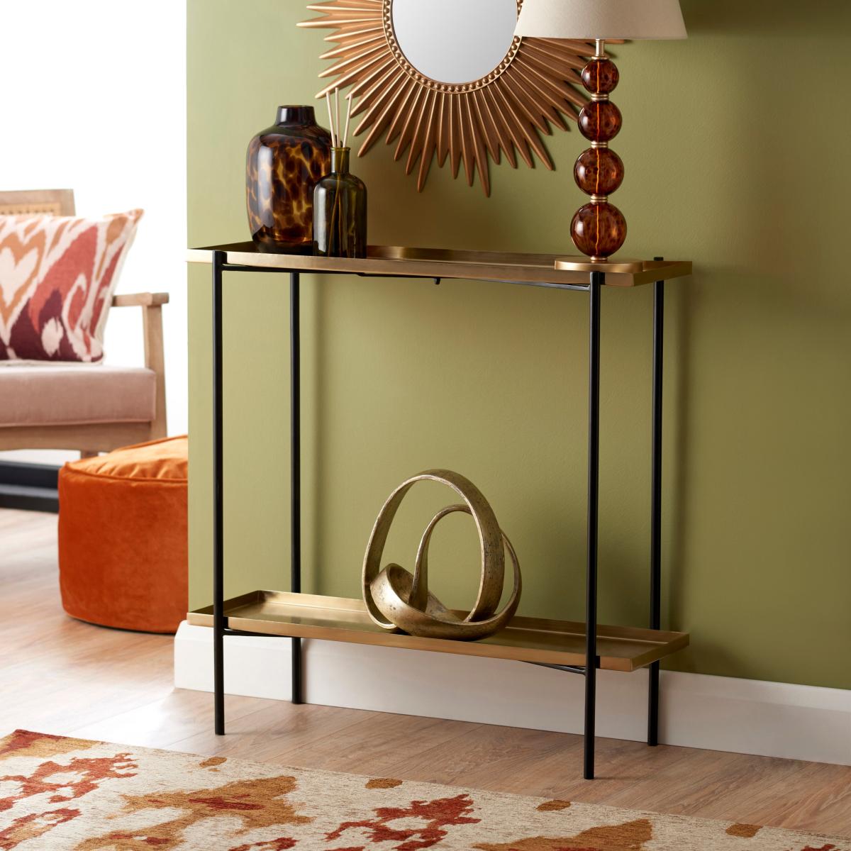 Get your extra storage sorted with a stylish console tray, topped with a metallic effect tray. The black metal legs are the perfect balance between minimalist and industrial, while the additional shelf helps you keep everything in its place and offers ideal storage space for books, drinks and other knick-knacks.
