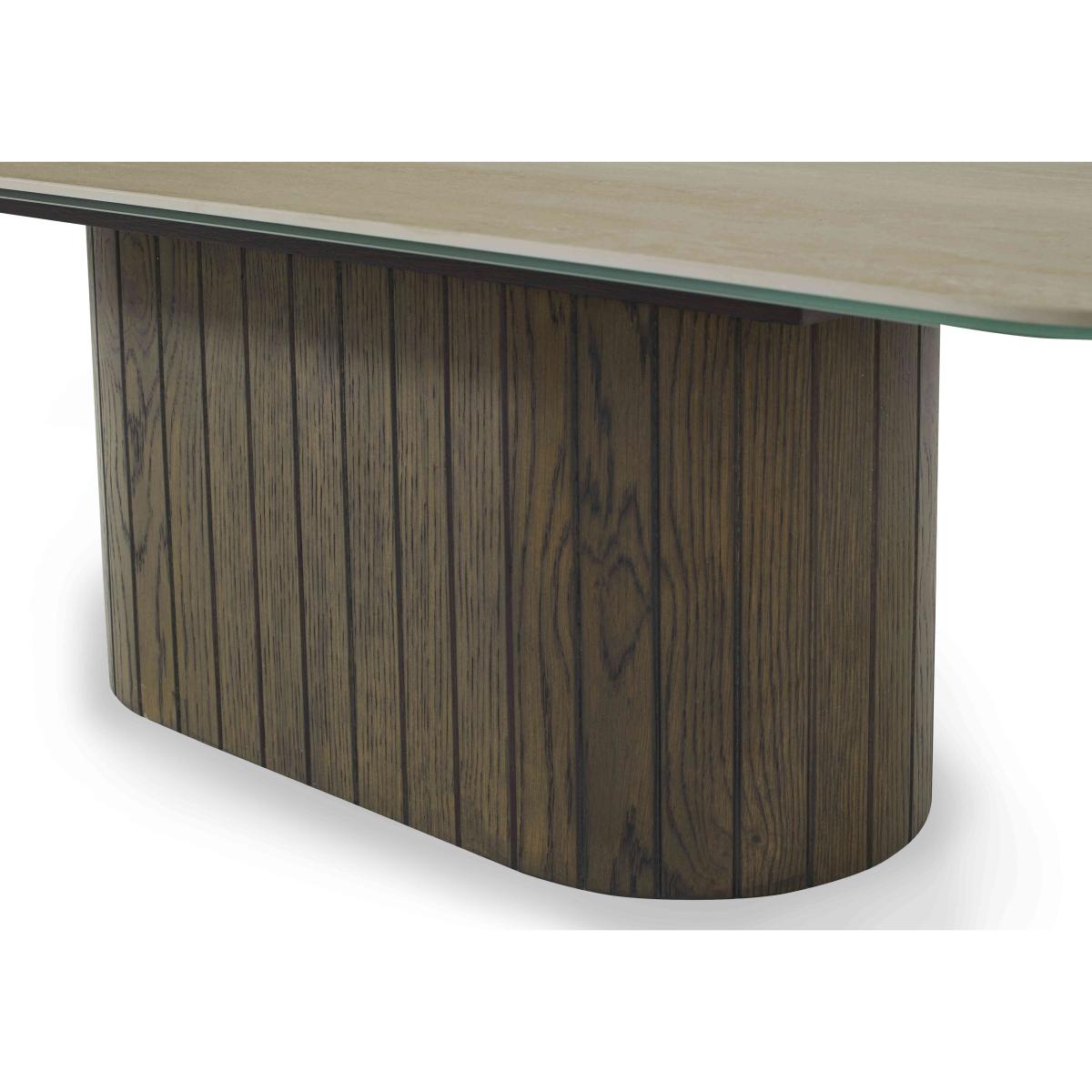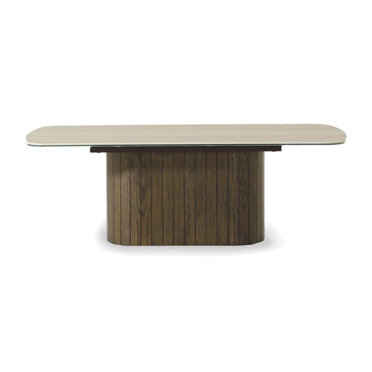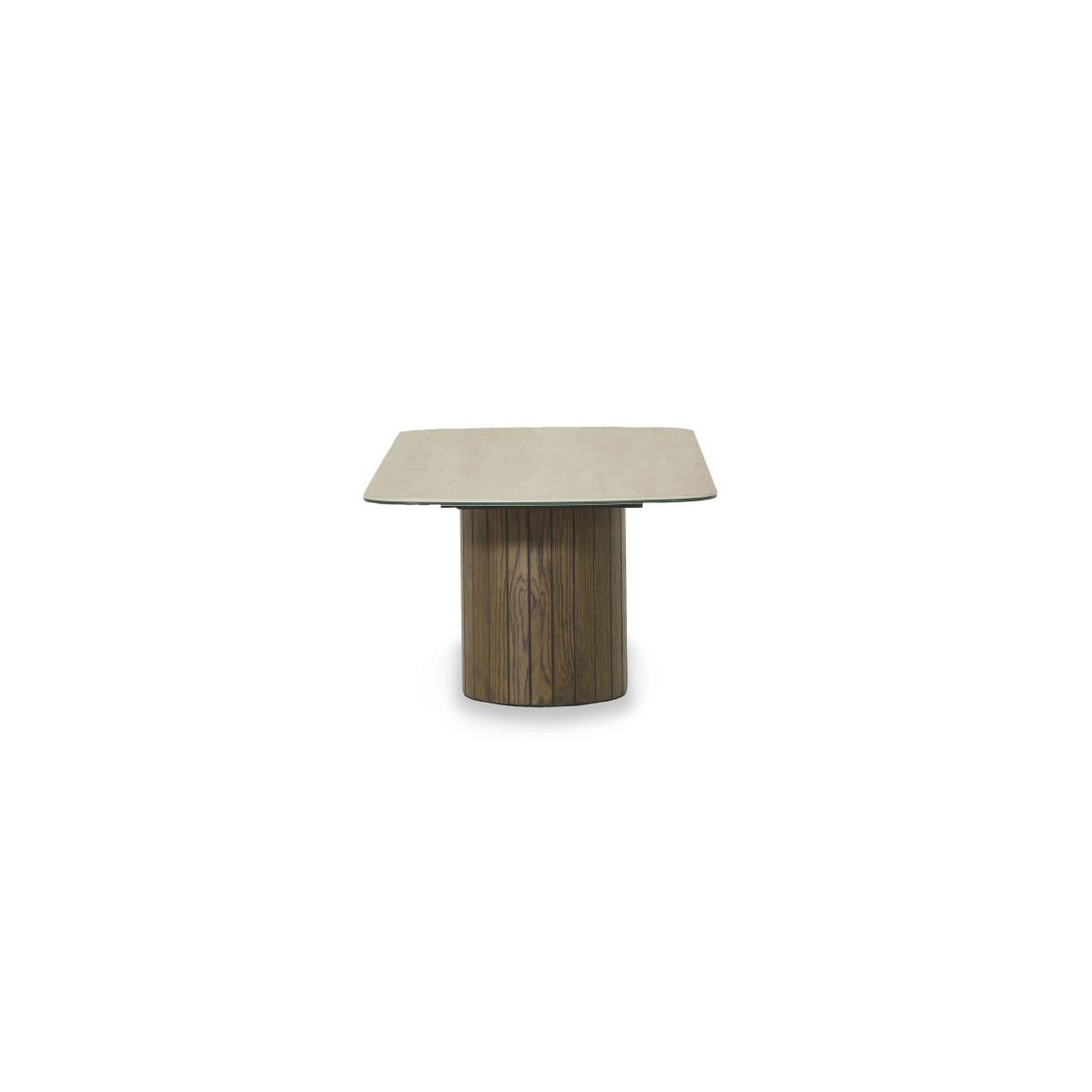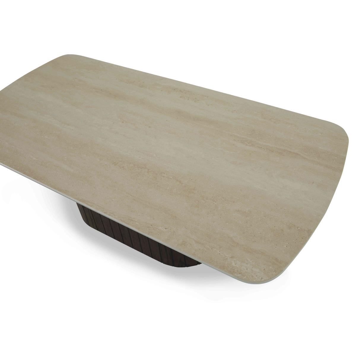Fabulous modern design in beautiful white travertine ceramic and hand-finished dark wood veneer – Tiber brings stunning style on a grand scale to more compact spaces. And it’s so versatile too. The look is sleek and high-end so you're always ready to entertain guests in style. Yet because ceramic is so hardwearing and durable, this is furniture that you can enjoy every day – especially as table tops are bonded to glass for even greater durability. This beautiful collection includes two sizes of draw leaf extending dining table, dining chairs and dining sets as well as storage pieces for living, dining and bedrooms. Create a focal point in your living room with this beautiful coffee table. Topped with travertine ceramic coupled to glass, it’s both stylish and very family-friendly. Why you'll love it Fabulous modern style for on-trend homes and family spaces. Sleek and stunning coffee table with a travertine ceramic top. The ceramic top is bonded to glass for extra strength and durability. Plus it’s heatproof, scratch-resistant and chip-resistant. Stylishly contrasting dark wood veneer pedestal base with fluting is finished by hand. This coffee table is part of the Tiber range. What you need to know We recommend using coasters and placemats at all times. Easy to care for. Simply wipe with a clean, slightly damp cloth. Love the look? Be sure to browse our Tiber bedroom furniture collection.