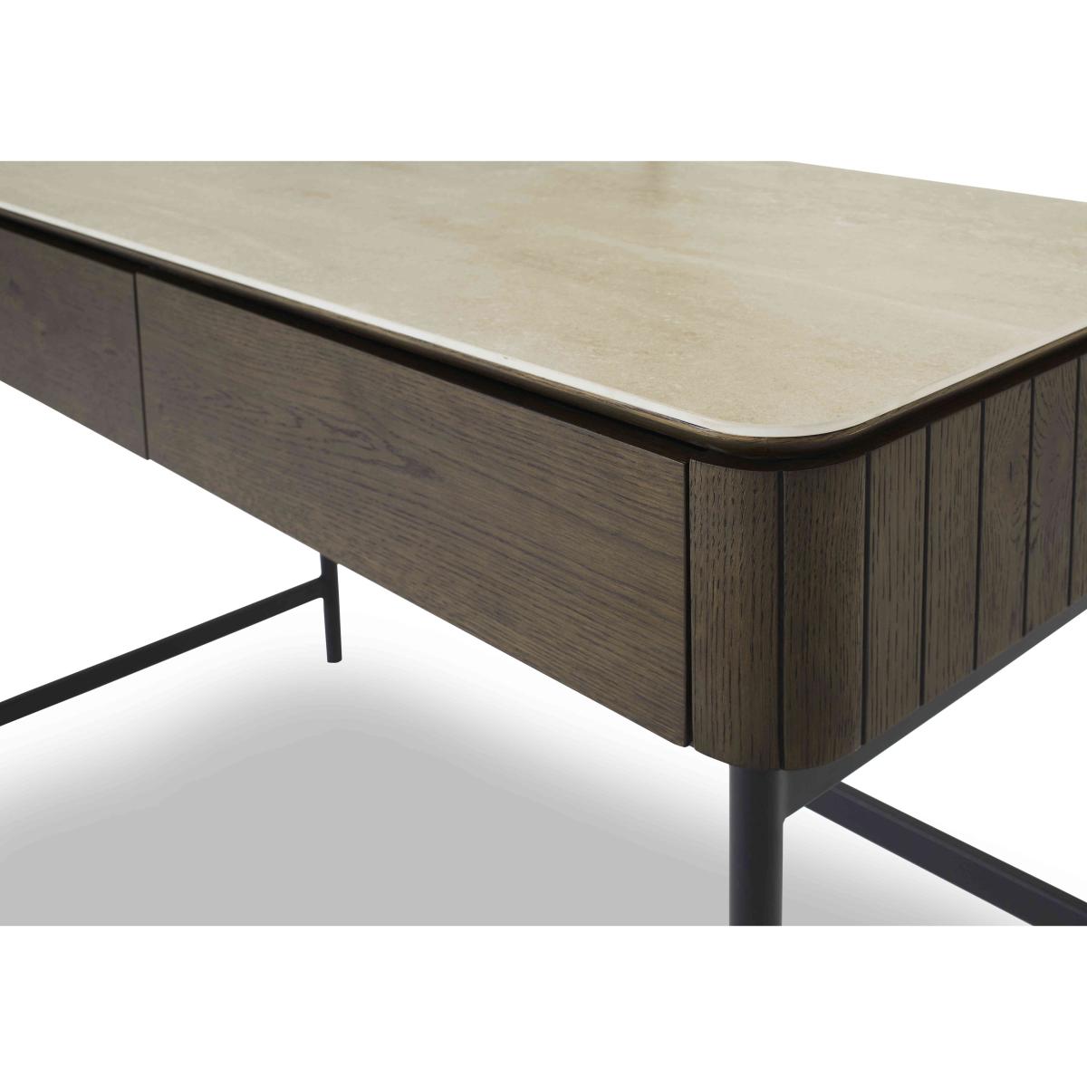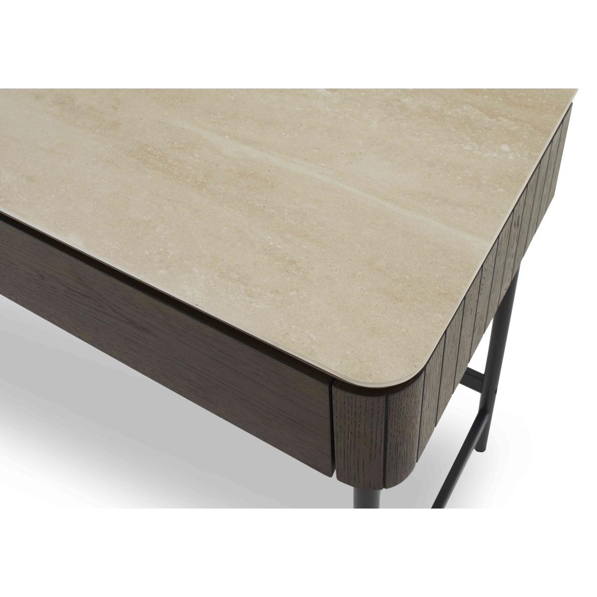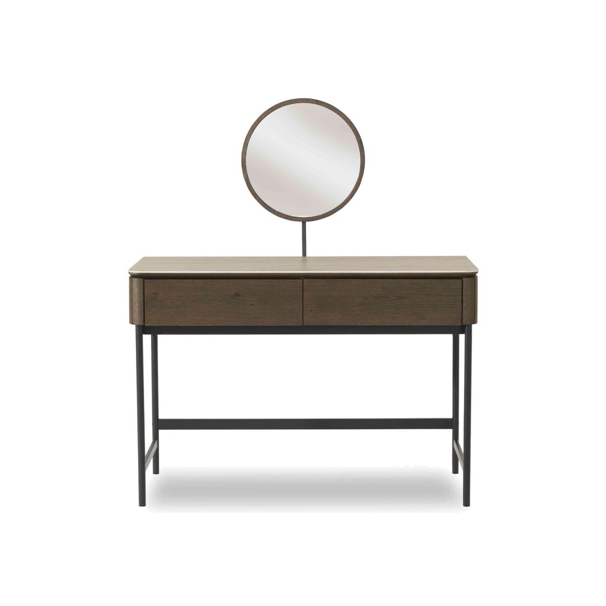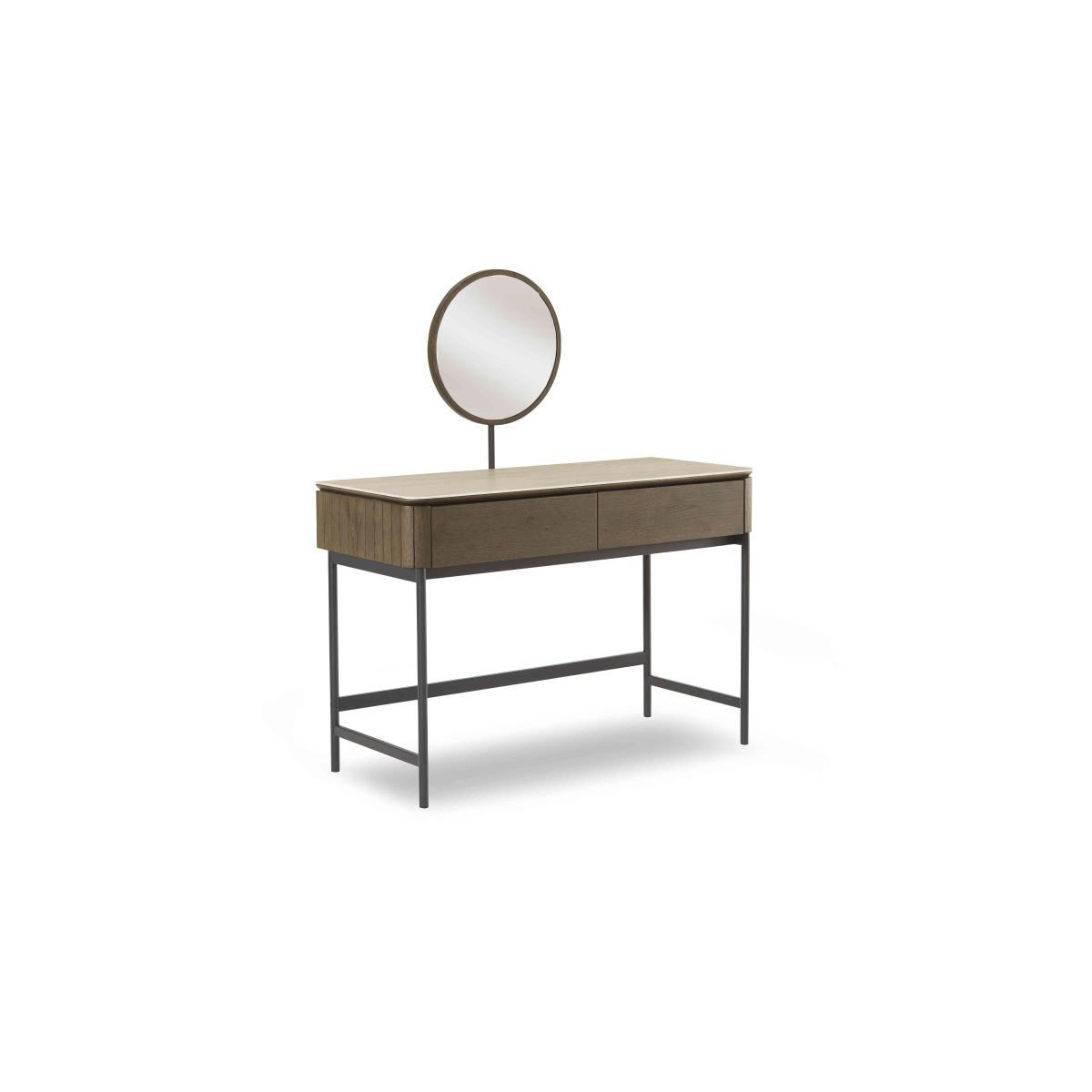 Fabulous modern design in beautiful white travertine ceramic and hand-finished dark wood veneer – Tiber brings stunning style on a grand scale to more compact spaces. And it’s so versatile too. The look is sleek and high-end so you're always ready to entertain guests in style. Yet because ceramic is so hardwearing and durable, this is furniture that you can enjoy every day – especially as table tops are bonded to glass for even greater durability. This beautiful collection includes two sizes of draw leaf extending dining table, dining chairs and dining sets as well as storage pieces for living, dining and bedrooms. Stylish and versatile, the Tiber dressing table has a ceramic surface and two handy drawers and comes complete with an elegant circular tilting mirror. Why you'll love it Fabulous modern style for on-trend bedrooms. Compact proportions for every size and style of home. This beautifully crafted dressing table has 2 soft-closing drawers. Sleek and stunning travertine ceramic top. Ceramic is heatproof, scratch-resistant and chip-resistant. Contrasting dark wood veneer frame with fluting and drawer fronts are finished by hand. Elegant titling mirror attaches to the back of the dressing table. Fittings provided. Powder-coated metal legs in black. This dressing table with mirror is part of the Tiber range. What you need to know We recommend using coasters and placemats at all times. Easy to care for. Simply wipe with a clean, slightly damp cloth. Love the look? Be sure to browse our Tiber dining room furniture collection. Item code: TIBRDTMR--001