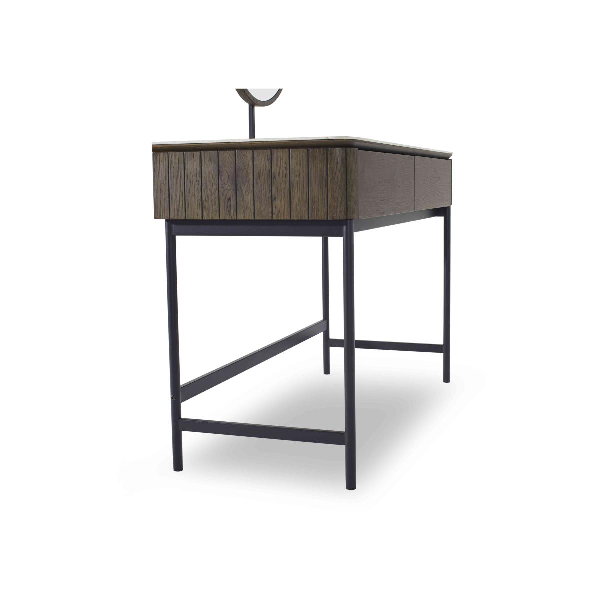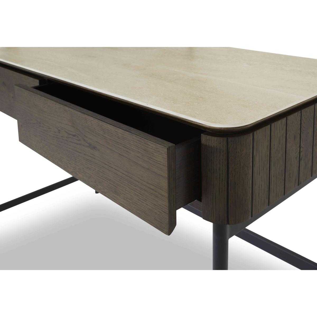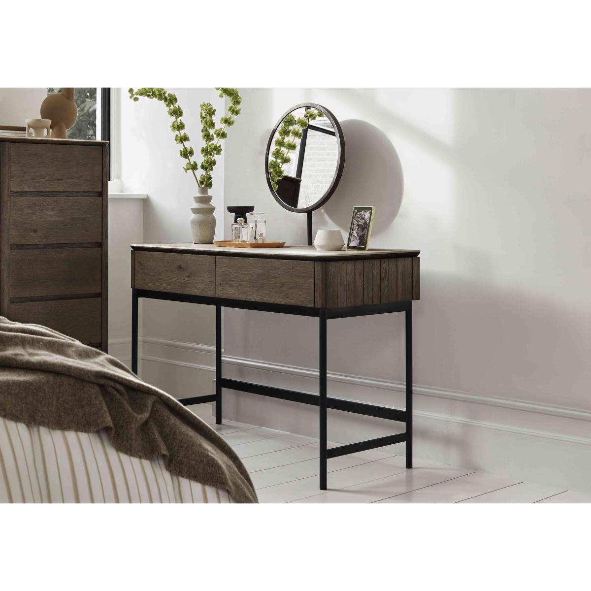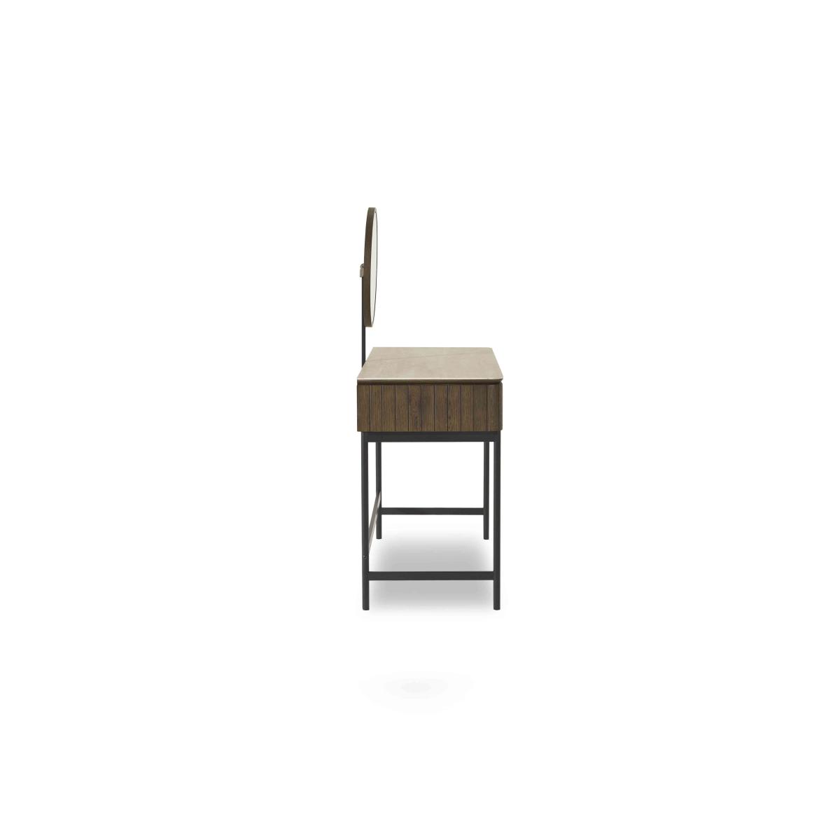Fabulous modern design in beautiful white travertine ceramic and hand-finished dark wood veneer – Tiber brings stunning style on a grand scale to more compact spaces. And it’s so versatile too. The look is sleek and high-end so you're always ready to entertain guests in style. Yet because ceramic is so hardwearing and durable, this is furniture that you can enjoy every day – especially as table tops are bonded to glass for even greater durability. This beautiful collection includes two sizes of draw leaf extending dining table, dining chairs and dining sets as well as storage pieces for living, dining and bedrooms. Stylish and versatile, the Tiber dressing table has a ceramic surface and two handy drawers and comes complete with an elegant circular tilting mirror. Why you'll love it Fabulous modern style for on-trend bedrooms. Compact proportions for every size and style of home. This beautifully crafted dressing table has 2 soft-closing drawers. Sleek and stunning travertine ceramic top. Ceramic is heatproof, scratch-resistant and chip-resistant. Contrasting dark wood veneer frame with fluting and drawer fronts are finished by hand. Elegant titling mirror attaches to the back of the dressing table. Fittings provided. Powder-coated metal legs in black. This dressing table with mirror is part of the Tiber range. What you need to know We recommend using coasters and placemats at all times. Easy to care for. Simply wipe with a clean, slightly damp cloth. Love the look? Be sure to browse our Tiber dining room furniture collection. Item code: TIBRDTMR--001