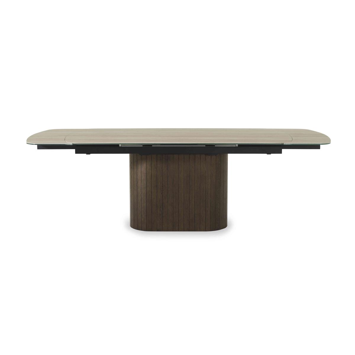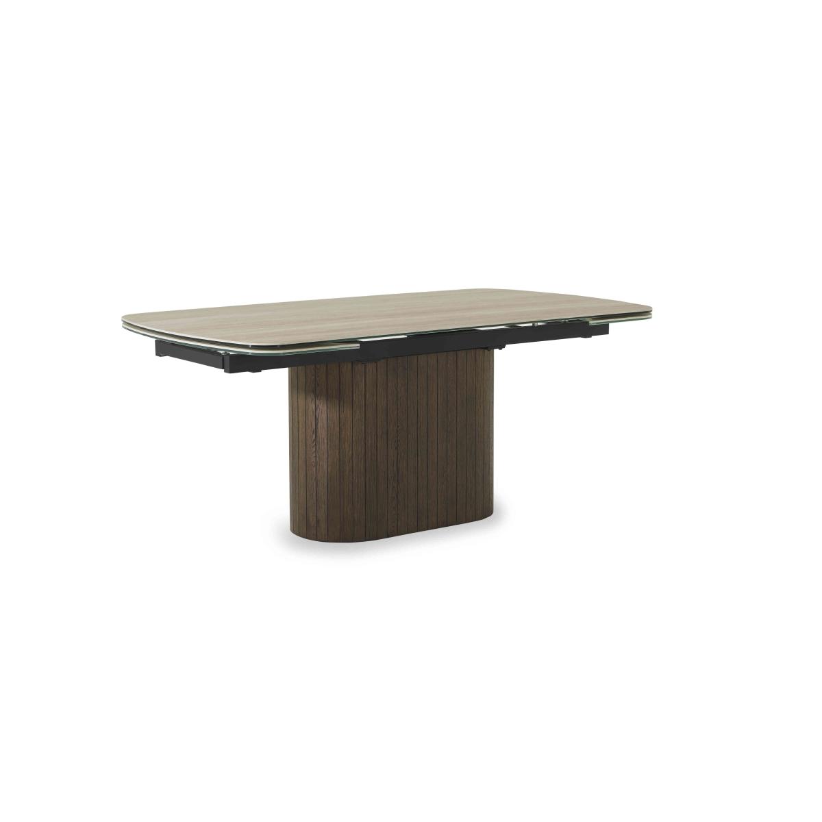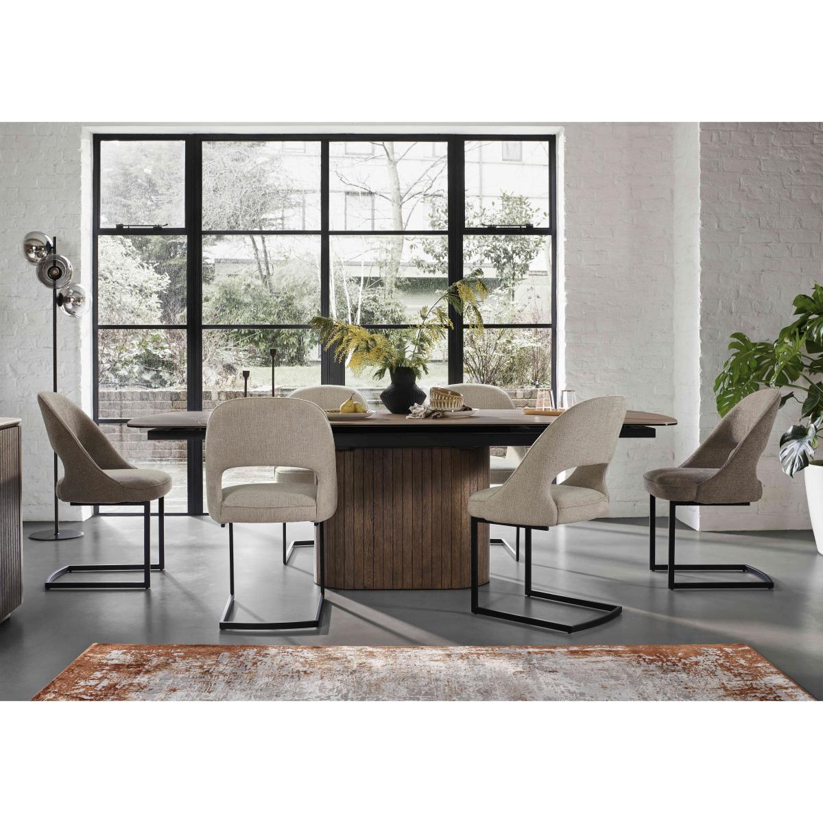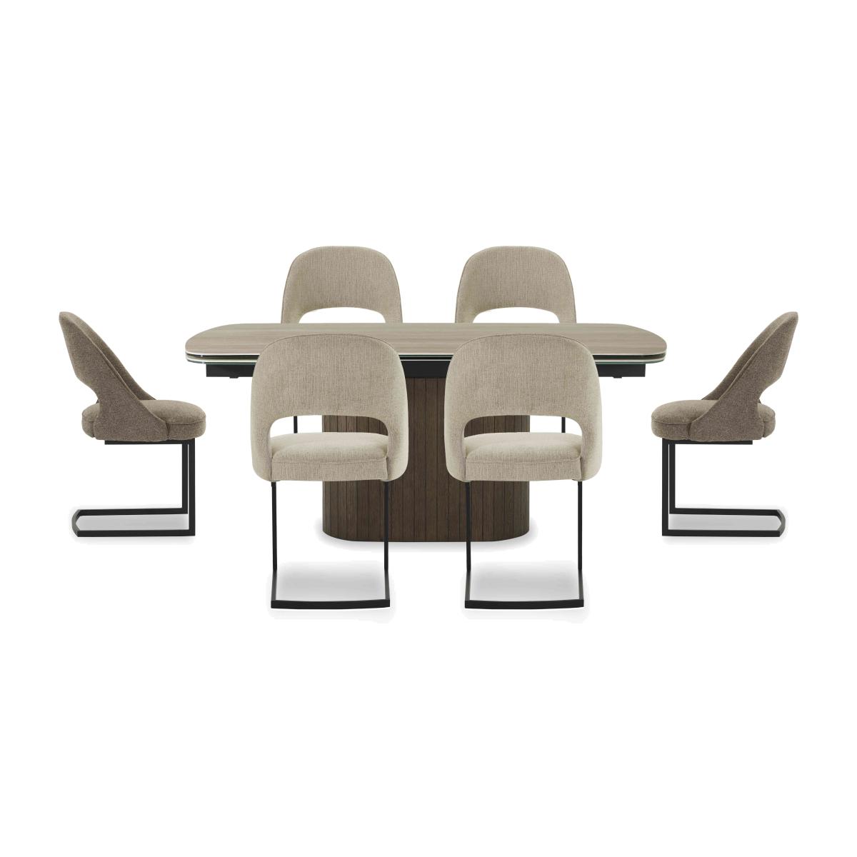 Fabulous modern design in beautiful white travertine ceramic and hand-finished dark wood veneer – Tiber brings stunning style on a grand scale to more compact spaces. And it’s so versatile too. The look is sleek and high-end so you're always ready to entertain guests in style. Yet because ceramic is so hardwearing and durable, this is furniture that you can enjoy every day – especially as table tops are bonded to glass for even greater durability. This beautiful collection includes two sizes of draw leaf extending dining table, dining chairs and dining sets as well as storage pieces for living, dining and bedrooms. This sophisticated dining set features a large extending dining table, topped with travertine and glass, that seats up to ten. We’ve paired it with six stylish chairs in two different colours. Why you'll love it Fabulous modern style for on-trend homes and family spaces. Compact proportions that suit every size and style of home. Sleek and stunning extending dining table with a travertine ceramic top. The ceramic top is bonded to glass for extra strength and durability. Plus it’s heatproof, scratch-resistant and chip-resistant. Stylishly contrasting dark wood veneer pedestal base with fluting is finished by hand. Smooth draw leaf mechanism. Simply pull on the table ends to extend. In 2 practical and versatile sizes. Dining set includes 6 cantilever dining chairs – 2 in truffle and 4 in alabaster. Chairs are deeply cushioned and beautifully curved. Open-back style is so on trend. Simple black metal cantilever bases. This dining set is part of the Tiber range. What you need to know Dining chairs have metal frames and cantilever bases. Cushioned with foam. 180 cm dining table seats 8 closed and 10 extended. We recommend using coasters and placemats at all times. Easy to care for. Simply wipe with a clean, slightly damp cloth. Love the look? Be sure to browse our Tiber bedroom furniture collection. Item code:TIBRSET5MIX-001