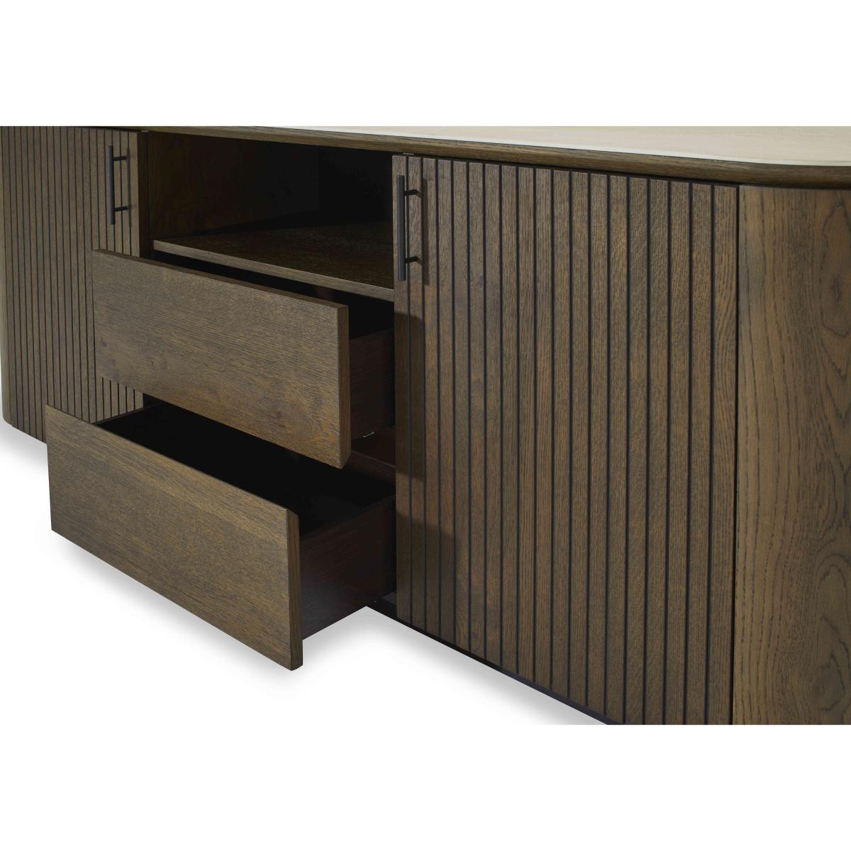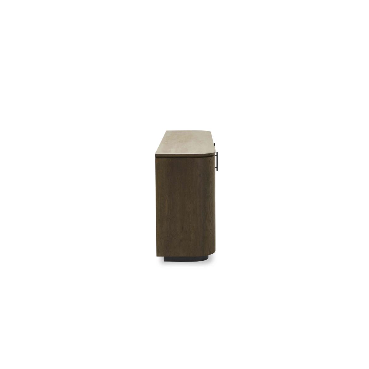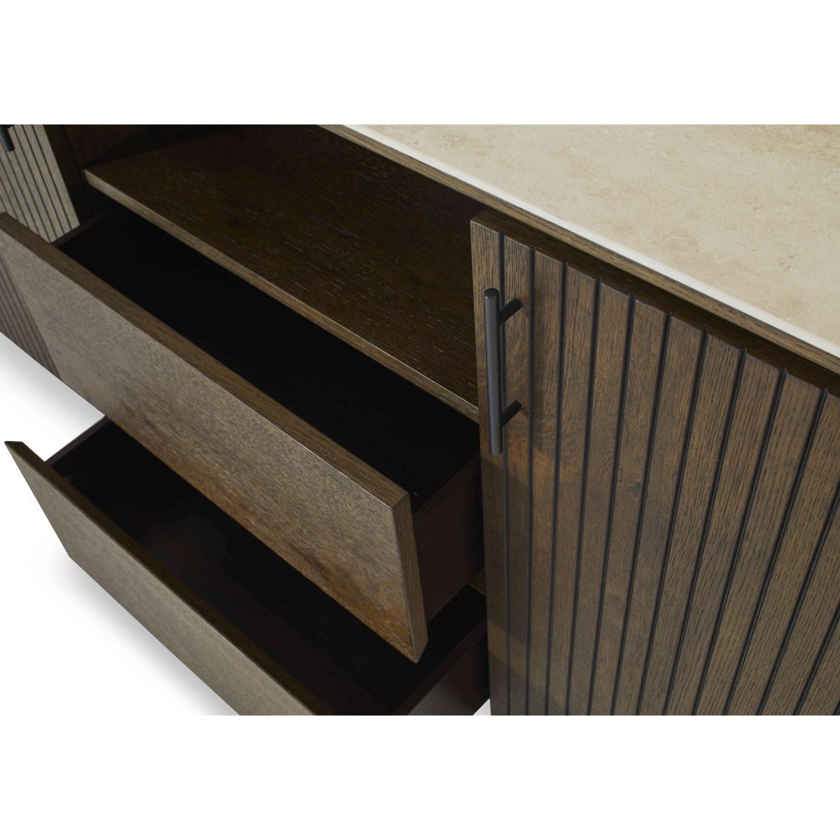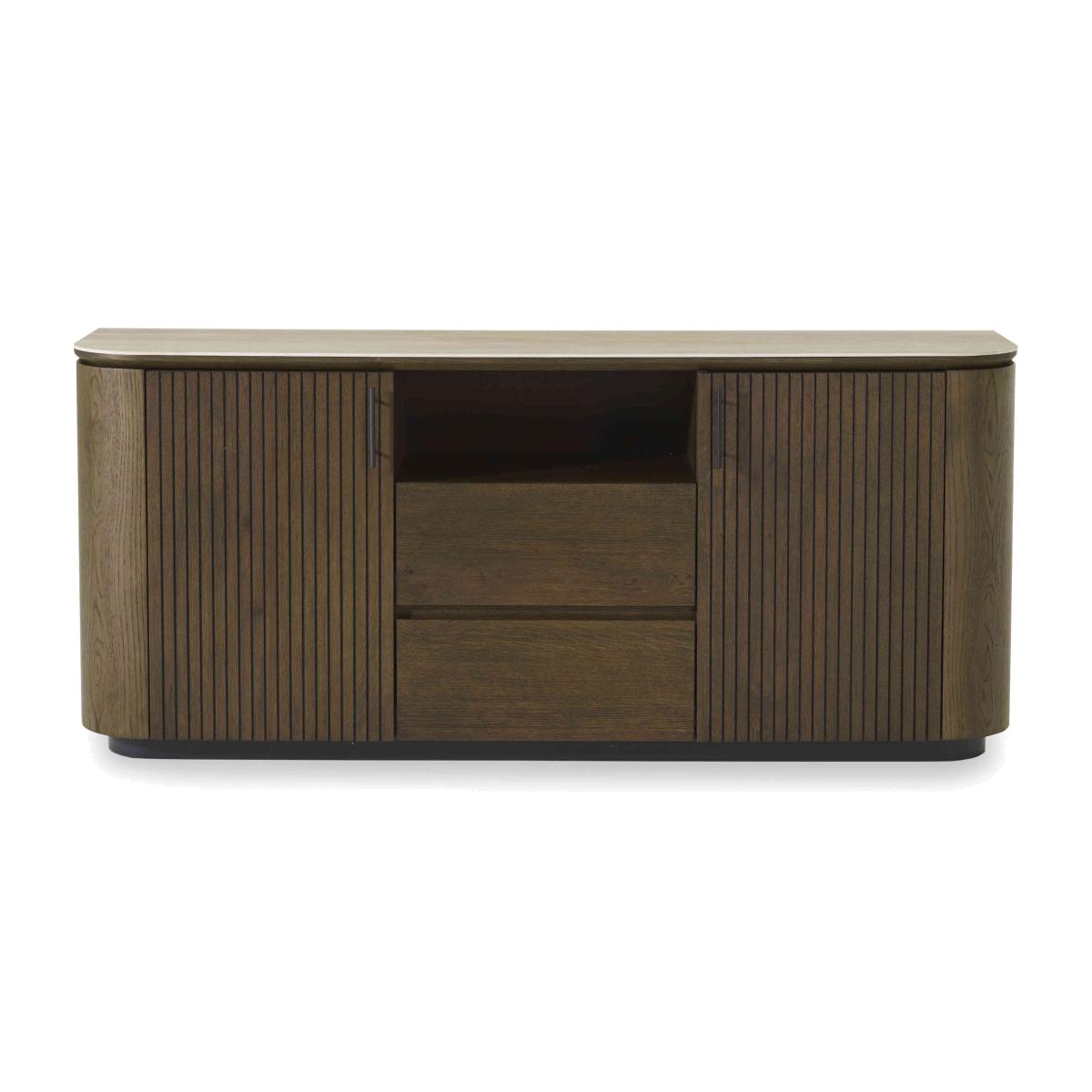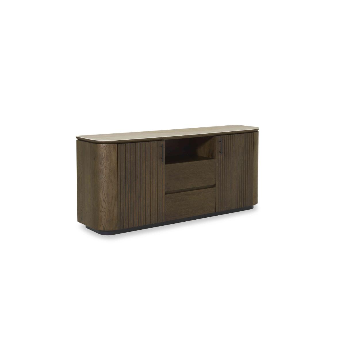 Fabulous modern design in beautiful white travertine ceramic and hand-finished dark wood veneer – Tiber brings stunning style on a grand scale to more compact spaces. And it’s so versatile too. The look is sleek and high-end so you're always ready to entertain guests in style. Yet because ceramic is so hardwearing and durable, this is furniture that you can enjoy every day – especially as table tops are bonded to glass for even greater durability. This beautiful collection includes two sizes of draw leaf extending dining table, dining chairs and dining sets as well as storage pieces for living, dining and bedrooms. You’ll love the look and appreciate the practicality of this large sideboard. With its travertine ceramic and dark wood veneer finish, it’s just so stylish. Why you'll love it Fabulous modern style for on-trend homes and family spaces. Compact proportions that suit every size and style of home. Sleek and stunning large sideboard with a travertine ceramic top. Ceramic is heatproof, scratch-resistant and chip-resistant. Stylishly contrasting dark wood veneer frame with fluting is finished by hand. Versatile and spacious storage – there’s an alcove, 2 drawers and 2 cupboards. Exceptional quality with soft-closing drawer and cupboard doors. This large sideboard is part of the Tiber range. What you need to know 2 drawers. 2 cupboards each with an adjustable shelf. We recommend using coasters and placemats at all times. Easy to care for. Simply wipe with a clean, slightly damp cloth. Love the look? Be sure to browse our Tiber bedroom furniture collection. WARNING!Furniture can tip over unexpectedly and cause injury. This item must be fixed to a wall using the anti-tip kit provided. Be sure to use the correct wall fixings suitable for the walls in your home. Furniture Village is not able to fix anti-tip devices for you. Seek professional advice if you are unsure. Item code: TIBRLSBD--001