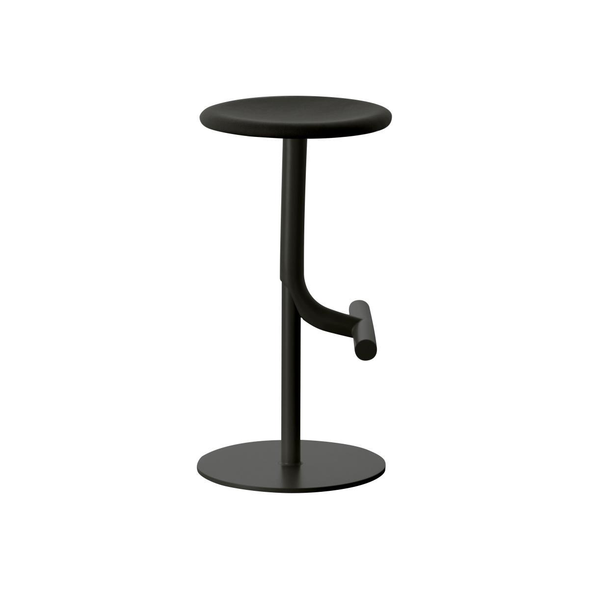"Tibu gas-lift barstool features two discs forming the base and seat, connected by a perpendicular pole. A small section branches off to create a footrest, made from the same tubular steel. The profile is kept simple using a release button for the gas lift that is integrated into the underside of the seat. ""We have been very motivated by showing the possibility for movement - adjusting the stool up and down. This led to the organic, continuous, flowing language of the stool"". The designers were keen to maintain one consistent colour across the piece despite the challenges presented by textural variation across the multiple materials. ".