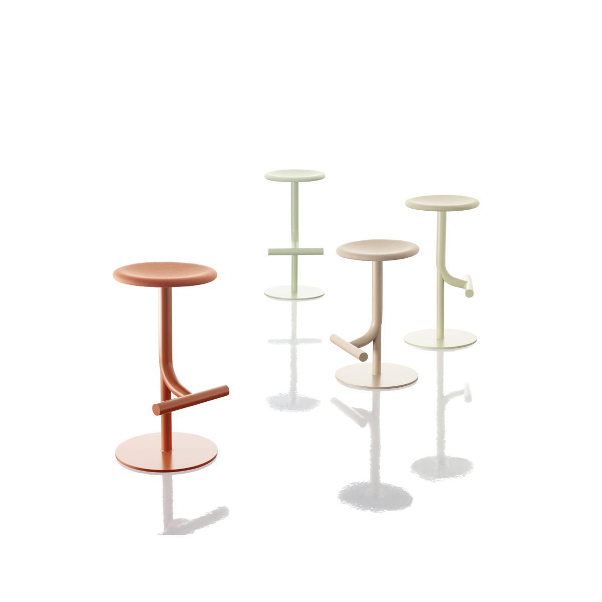 An incredibly clear and graphic profile for this rotating and height-adjustable stool by the Norwegian design studio Anderssen & Voll. In perfect harmony, the seat and the footrest are connected via a fluid and organic shape. In order to preserve the purity of the lines, the button to adjust the height is completely hidden under the seat. The symmetry between the two disks forming the base and the seat grant it all a wonderful harmony. The seat is upholstered in an elegant Kvadrat wool fabric which provides comfort and softness. The structure is made from varnished steel. The monochrome finish of Tibu provides unity to the different textures and highlights the clear nature of the profile. The fine and confident lines of Tibu evoke a calligraphic symbol or a plant element.