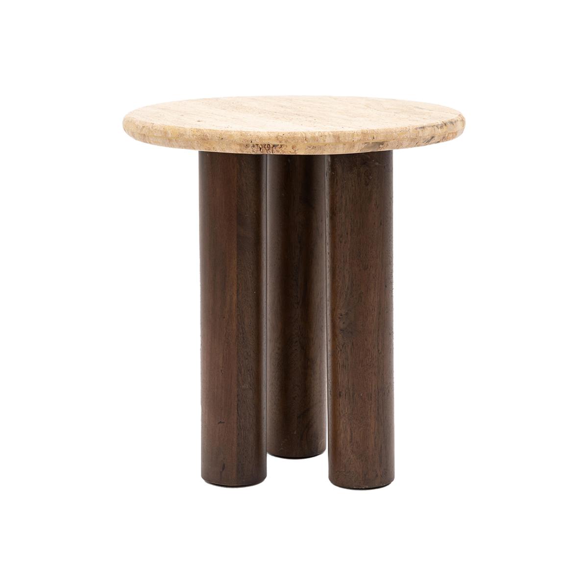I love the way this side table brings together a pale travertine top and rich, dark-wood legs - it feels both grounded and refined. It works equally well in contemporary, Scandi-inspired or mid-century interiors, pairing nicely with neutral sofas or colourful accent chairs. For styling, keep the surface uncluttered: a small pot plant or a single ceramic vase plus a couple of art books will accentuate its clean lines without overwhelming the piece. Placed next to an armchair or at the end of a sofa, it makes a practical spot for your evening drink or bedside essentials.